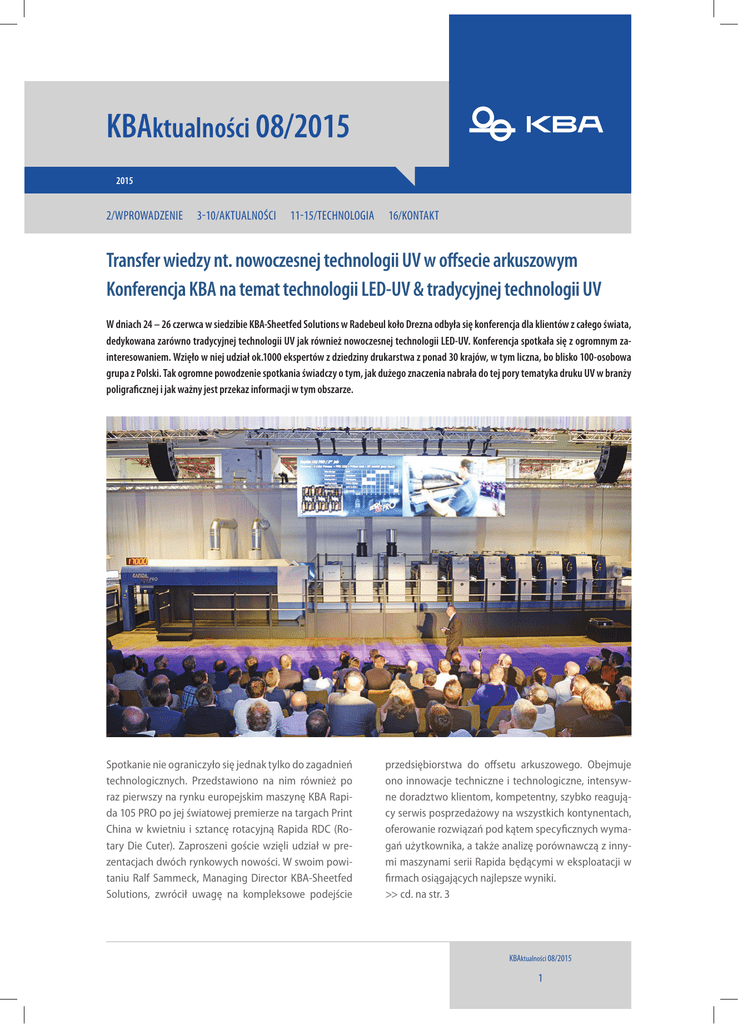 KBAktualności 08/2015 2015 2/WPROWADZENIE 3-10/AKTUALNOŚCI 11-15/TECHNOLOGIA 16/KONTAKT Transfer wiedzy nt. nowoczesnej technologii UV w offsecie arkuszowym Konferencja KBA na temat technologii LED-UV & tradycyjnej technologii UV W dniach 24 – 26 czerwca w siedzibie KBA-Sheetfed Solutions w Radebeul koło Drezna odbyła się konferencja dla klientów z całego świata, dedykowana zarówno tradycyjnej technologii UV jak również nowoczesnej technologii LED-UV. Konferencja spotkała się z ogromnym zainteresowaniem. Wzięło w niej udział ok.1000 ekspertów z dziedziny drukarstwa z ponad 30 krajów, w tym liczna, bo blisko 100-osobowa grupa z Polski. Tak ogromne powodzenie spotkania świadczy o tym, jak dużego znaczenia nabrała do tej pory tematyka druku UV w branży poligraficznej i jak ważny jest przekaz informacji w tym obszarze. Spotkanie nie ograniczyło się jednak tylko do zagadnień technologicznych. Przedstawiono na nim również po raz pierwszy na rynku europejskim maszynę KBA Rapida 105 PRO po jej światowej premierze na targach Print China w kwietniu i sztancę rotacyjną Rapida RDC (Rotary Die Cuter). Zaproszeni goście wzięli udział w prezentacjach dwóch rynkowych nowości. W swoim powitaniu Ralf Sammeck, Managing Director KBA-Sheetfed Solutions, zwrócił uwagę na kompleksowe podejście przedsiębiorstwa do offsetu arkuszowego. Obejmuje ono innowacje techniczne i technologiczne, intensywne doradztwo klientom, kompetentny, szybko reagujący serwis posprzedażowy na wszystkich kontynentach, oferowanie rozwiązań pod kątem specyficznych wymagań użytkownika, a także analizę porównawczą z innymi maszynami serii Rapida będącymi w eksploatacji w firmach osiągających najlepsze wyniki. >> cd. na str. 3 KBAktualności 08/2015 1 2/WPROWADZENIE 3-10/AKTUALNOŚCI 11-15/TECHNOLOGIA KBA Success Story Drodzy czytelnicy, nim się obejrzeliśmy wkroczyliśmy w drugą połowę 2015 r. i wielu z nas zdążyło już wrócić z letnich wakacji. Bez wątpienia wszyscy zasłużyliśmy na odrobinę relaksu. Pierwszą dobrą wiadomością, którą chciałbym się z Państwem podzielić w tym wydaniu KBAktualności jest znaczny wzrost wartości akcji firmy Koenig & Bauer. Od początku bieżącego roku podwoiły one swoją wartość. Była to nie tylko reakcja giełd na bardzo dobre wyniki ekonomiczne i finansowe firmy Koenig & Bauer w 2014 roku, ale także potwierdzenie zaufania rynku do sukcesu firmy, przejawiającego się wdrożeniem szybkich procesów restrukturyzacyjnych, które doprowadziły do zmian organizacyjnych, redukcji kosztów we wszystkich kluczowych działach firmy, w dywersyfikacji portfela produktów oraz poczynieniu nowych inwestycji w ciągu ostatnich dwóch lat. Firma Koenig & Bauer zawsze starała się zrozumieć, jakie są potrzeby użytkowników i wprowadzać na rynek zaawansowane rozwiązania wspierające działalność biznesową przedsiębiorstw poligraficznych w ich pomyślnym rozwoju. Stoją za tym dziesiątki milionów euro zainwestowane przez firmę KBA w jej zakłady produkcyjne oraz inwestycje poczynione w rozwój technologii druku KBA w segmencie druku opakowań, druku komercyjnego, druku flexo oraz druku cyfrowego. Na kolejnych stronach przeczytacie Państwo, czym zajmowaliśmy się w pierwszej połowie 2015 roku. Możecie zapoznać się Państwo z informacjami dotyczącymi naszego seminarium (KBA Seminar Day), jakie odbyło się w okolicach Warszawy; a także o wizycie studentów Politechniki Warszawskiej i Politechniki Łódzkiej w Lipsku, Dreźnie, Radebeul oraz w zakładach produkcyjnych w miejscowości Krzycko Wielkie należących do naszego www.kba.com/pl 16/KONTAKT kluczowego klienta, firmy Werner Kenkel. Koniec czerwca przyniósł ze sobą niezwykle ekscytujące wydarzenie w naszym zakładzie zlokalizowanym w Radebeul. Temat zorganizowanej konferencji brzmiał „Tradycyjne technologie UV oraz technologia LED UV”. Łącznie firma Koenig & Bauer miała zaszczyt powitać 1000 osób w tym ponad 150 gości z Polski, Czech oraz Słowacji. Mieli oni okazję obserwować na żywo druk wysokojakościowych materiałów opakowaniowych, etykiet in-mould oraz nisko- i wysokonakładowych materiałów komercyjnych. Podczas pokazów odbyły się dwie światowe premiery technologii KBA – maszyny KBA Rapida RDC (rotary die-cutter – sztanca rotacyjna) oraz maszyny KBA Rapida 105PRO-6+LTTL FAPC ALV3. W ciągu ostatnich miesięcy przeprowadziliśmy instalacje nowych maszyn w różnych zakresach formatowych, jednakże najbardziej motywującym dla nas był fakt potwierdzenia dominacji firmy KBA w obszarze maszyn wielkoformatowych. W bardzo krótkim czasie zainstalowaliśmy i przekazaliśmy do produkcji trzy wielkoformatowe maszyny drukujące – dwie maszyny KBA Rapida 145 oraz jedną maszynę KBA Rapida 164. W kolejnych numerach naszego biuletynu podzielimy się z Państwem szczegółami dotyczącymi tych instalacji. Lato 2015 to dla nas kolejne instalacje maszyn drukujących - ponownie we wszystkich klasach formatowych - z których najbardziej ekscytujące będą instalacje bogato wyposażonych długich maszyn opakowaniowych w formatach B0 i B1 oraz wysokiej klasy maszyny komercyjne w formacie B1. Kontynuujemy także wewnętrzny proces wzmacniania naszego zespołu – mamy nowych kolegów w dziale sprzedaży oraz serwisu w oddziałach w Warszawie oraz w Pradze. Wszyscy czekamy na nasze tradycyjne, weekendowe spotkanie pracowników i ich rodzin, w jakim będziemy uczestniczyć w końcu sierpnia. W 2013 roku spotkaliśmy się w Polsce, w ubiegłym roku w Czechach – teraz kolej na Słowację! Z optymizmem patrzymy w przyszłość i wierzymy, że także dla Państwa będzie ona satysfakcjonująca. Życzymy Państwu wszystkiego najlepszego! Z wyrazami szacunku, Jan Korenc Prezes Zarządu KBA CEE KBAktualności 08/2015 2 2/WPROWADZENIE 3-10/AKTUALNOŚCI 11-15/TECHNOLOGIA cd. ze strony 1. Praktycy z przemysłu poligraficznego przedstawili ze wszystkich s