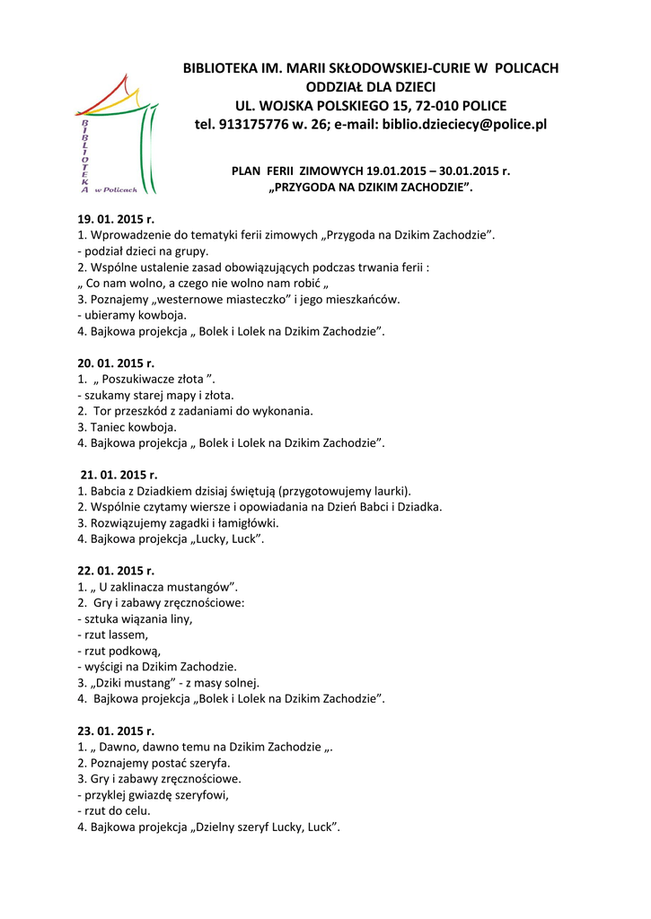 BIBLIOTEKA IM. MARII SKŁODOWSKIEJ-CURIE W POLICACH ODDZIAŁ DLA DZIECI UL. WOJSKA POLSKIEGO 15, 72-010 POLICE tel. 913175776 w. 26; e-mail: [email protected] PLAN FERII ZIMOWYCH 19.01.2015 – 30.01.2015 r. „PRZYGODA NA DZIKIM ZACHODZIE”. 19. 01. 2015 r. 1. Wprowadzenie do tematyki ferii zimowych „Przygoda na Dzikim Zachodzie”. - podział dzieci na grupy. 2. Wspólne ustalenie zasad obowiązujących podczas trwania ferii : „ Co nam wolno, a czego nie wolno nam robić „ 3. Poznajemy „westernowe miasteczko” i jego mieszkańców. - ubieramy kowboja. 4. Bajkowa projekcja „ Bolek i Lolek na Dzikim Zachodzie”. 20. 01. 2015 r. 1. „ Poszukiwacze złota ”. - szukamy starej mapy i złota. 2. Tor przeszkód z zadaniami do wykonania. 3. Taniec kowboja. 4. Bajkowa projekcja „ Bolek i Lolek na Dzikim Zachodzie”. 21. 01. 2015 r. 1. Babcia z Dziadkiem dzisiaj świętują (przygotowujemy laurki). 2. Wspólnie czytamy wiersze i opowiadania na Dzień Babci i Dziadka. 3. Rozwiązujemy zagadki i łamigłówki. 4. Bajkowa projekcja „Lucky, Luck”. 22. 01. 2015 r. 1. „ U zaklinacza mustangów”. 2. Gry i zabawy zręcznościowe: - sztuka wiązania liny, - rzut lassem, - rzut podkową, - wyścigi na Dzikim Zachodzie. 3. „Dziki mustang” - z masy solnej. 4. Bajkowa projekcja „Bolek i Lolek na Dzikim Zachodzie”. 23. 01. 2015 r. 1. „ Dawno, dawno temu na Dzikim Zachodzie „. 2. Poznajemy postać szeryfa. 3. Gry i zabawy zręcznościowe. - przyklej gwiazdę szeryfowi, - rzut do celu. 4. Bajkowa projekcja „Dzielny szeryf Lucky, Luck”. 26. 01. 2015 r. 1. „ Westernowa moda” 2. Przygotowujemy karnawałowe stroje. 3. Gry i zabawy zręcznościowe : - rzut do puszek, - rzut kapeluszem, - zabawa z chustą animacyjną. 4. Bajkowa projekcja „Bolek i Lolek na Dzikim Zachodzie”. 27. 01. 2015 r. 1. „W indiańskiej wiosce”. 2. Indiańskie tańce i harce. 3. Poznajemy wodza Indian. 4. Szlak przygód dla tropicieli i wojowników. 5. Zabawa z chustą animacyjną. 6. Bajkowa projekcja „ Bolek i Lolek na Dzikim Zachodzie”. 28. 01. 2015 r. 1. „Zagadki Białej Chmury”. 2. Zagadki i łamigłówki „Sokolego Oka”. 3. Poznajemy życie codzienne Indian. 4. Czytamy opowieści i Indianach. 5. „Szamański pokaz mody”. 6. Bajkowa projekcja „ Bolek i Lolek na Dzikim Zachodzie”. 29. 01. 2015 r. 1. Nad wielkim strumieniem. - gry i zabawy zręcznościowe. 2. Celne oko. - gry i zabawy zręcznościowe. 3. Indiański węch. - gry i zabawy zręcznościowe. 4. W indiańskim języku. - gry i zabawy zręcznościowe. 5. Na indiańskim szlaku. - gry i zabawy zręcznościowe. 6. „Westernowa kuchnia” - robimy ciasteczka wg. przepisu szeryfa 7. Bajkowa projekcja „Bolek i Lolek na Dzikim Zachodzie”. 30. 01. 2015 r. 1. Zakończenie ferii. 2. Pokaz „westernowej mody”. 3. Wybór „najmilszej feriowiczki i najmilszego feriowicza”. 4. „Westernowy bal”. 5. Wręczenie nagrody dla „Najbardziej rozczytanego czytelnika 2014 roku”. 6. Zakończenie ferii 2015 r. Organizatorzy zastrzegają sobie prawo do zmian w programie ferii.