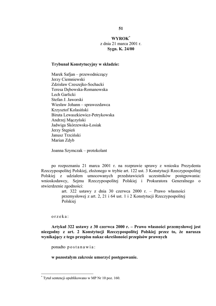 51 WYROK* z dnia 21 marca 2001 r. Sygn. K. 24/00 Trybunał Konstytucyjny w składzie: Marek Safjan – przewodniczący Jerzy Ciemniewski Zdzisław Czeszejko-Sochacki Teresa Dębowska-Romanowska Lech Garlicki Stefan J. Jaworski Wiesław Johann – sprawozdawca Krzysztof Kolasiński Biruta Lewaszkiewicz-Petrykowska Andrzej Mączyński Jadwiga Skórzewska-Łosiak Jerzy Stępień Janusz Trzciński Marian Zdyb Joanna Szymczak – protokolant po rozpoznaniu 21 marca 2001 r. na rozprawie sprawy z wniosku Prezydenta Rzeczypospolitej Polskiej, złożonego w trybie art. 122 ust. 3 Konstytucji Rzeczypospolitej Polskiej z udziałem umocowanych przedstawicieli uczestników postępowania: wnioskodawcy, Sejmu Rzeczypospolitej Polskiej i Prokuratora Generalnego o stwierdzenie zgodności: art. 322 ustawy z dnia 30 czerwca 2000 r. – Prawo własności przemysłowej z art. 2, 21 i 64 ust. 1 i 2 Konstytucji Rzeczypospolitej Polskiej orzeka: Artykuł 322 ustawy z 30 czerwca 2000 r. – Prawo własności przemysłowej jest niezgodny z art. 2 Konstytucji Rzeczypospolitej Polskiej przez to, że narusza wynikający z tego przepisu nakaz określoności przepisów prawnych ponadto p o s t a n a w i a : w pozostałym zakresie umorzyć postępowanie. * Tytuł sentencji opublikowano w MP Nr 10 poz. 160. Uzasadnienie: I 1. Złożonym na podstawie art. 122 ust. 3 Konstytucji RP wnioskiem z 25 lipca 2000 r., Prezydent Rzeczypospolitej Polskiej zwrócił się o stwierdzenie zgodności art. 322 ustawy z 30 czerwca 2000 r. – Prawo własności przemysłowej (dalej: prawo przemysłowe) z art. 2, 21 i 64 ust. 1 i 2 konstytucji. W uzasadnieniu powyższego Prezydent RP wskazał, że uchwalona z przedłożenia Rady Ministrów ustawa została mu przedstawiona przez Marszałka Sejmu do podpisu, zaś jej celem – w myśl uzasadnienia – jest ujęcie w jednym akcie normatywnym wszystkich regulacji prawnych dotyczących własności przemysłowej oraz realizacja zobowiązań wynikających z Układu Europejskiego ustanawiającego stowarzyszenie między Rzecząpospolitą Polską z jednej strony, a Wspólnotami Europejskimi i ich Państwami Członkowskimi z drugiej strony (Dz.U. z 1994 r. Nr 11, poz. 38 ze zm.; dalej: Układ stowarzyszeniowy) i z Porozumienia ustanawiającego Światową Organizację Handlu (Dz.U. z 1995 r. Nr 98, poz. 483 ze zm.; dalej: Porozumienie o WTO), w szczególności załącznika Nr 1 – Porozumienia w sprawie handlowych aspektów praw własności intelektualnej (dalej: Załącznik TRIPS; obwieszczenie Ministra Spraw Zagranicznych z dnia 12 lutego 1996 r. w sprawie publikacji załączników do Porozumienia ustanawiającego Światową Organizację Handlu [WTO]; Dz.U. Nr 32, poz. 143). Mocą zaskarżonego przepisu znak towarowy zarejestrowany w kraju lub za granicą na rzecz przedsiębiorstw handlu zagranicznego (dalej: PHZ) lub ich następców prawnych podlega w Polsce i za granicą przeniesieniu na rzecz producenta, jeżeli był używany do oznaczania w sposób ciągły wytwarzanych przezeń wyrobów, przez okres co najmniej dziesięciu lat przed dniem wejścia w życie ustawy. Regulacja ta nie została zawarta w przedłożeniu rządowym (Druk sejmowy Nr 248), stanowiła ona wniosek mniejszości wprowadzony w toku prac komisji sejmowych (Druk sejmowy Nr 1552) i wycofany w trzecim czytaniu. Ostatecznie wprowadzona została – zaakceptowaną przez Sejm RP – poprawką Nr 72 Senatu RP (uchwała z 14 kwietnia 2000 r.), uzasadnioną faktem, iż przywrócenie producentom praw do znaków towarowych stanowi realizację zasady słuszności i ma istotne znaczenie w procesie prywatyzacji i reprywatyzacji. Ze stanowiskiem tym zgodził się Minister Skarbu Państwa, wskazując jednak na konieczność rozważenia ewentualnych roszczeń wobec Skarbu Państwa ze strony podmiotów, które zobowiązane byłyby do przeniesienia znaków towarowych. Zdaniem Prezydenta RP, zasada słuszności i realizacja procesu prywatyzacji nie mogą być uznane za przesłanki uzasadniające wprowadzenie rozwiązań sprzecznych z zasadami i wartościami konstytucyjnymi. Istotą kwestionowanego przepisu, którego adresatami są przedsiębiorstwa państwowe, państwowo-spółdzielcze oraz ich następcy prawni (w tym podmioty gospodarcze sektora publicznego), jest zmiana stosunków własnościowych, poprzez pozbawienie praw z rejestracji znaków towarowych podmiotów, niezależnie od ich charakteru (podmioty krajowe i zagraniczne) i formy własności. Fakt, iż podmiotami uprawnionymi z rejestracji znaków towarowych są prawni następcy PHZ stanowi konsekwencję gospodarki planowej, opartej na zasadzie jednolitej własności państwowej. Przedstawiając regulacje historyczne rejestracji znaków towarowych Prezydent RP wskazał, że w myśl zarówno ustawy z dnia 28 marca 1963 r. o znakach towarowych (Dz.U. Nr 14, poz. 73; dalej: ustawa z 1963 r.), jak i ustawy z dnia 31 stycznia 1985 r. o znakach towarowych (Dz.U. Nr 5, poz. 17 ze zm.; dalej: ustawa z 1985 r.) rejestracja znaku mogła nastąpić tylko na rzecz przedsiębiorstwa i jedynie dla towarów będących przedmiotem jego działalności. Tak więc “przesłanką konieczną dla rejestracji znaku nie była (...) wyłącznie produkcja towarów objętych znakiem towarowym [a] podmiotami uprawnionymi do znaków towarowych byli także dystrybutorzy produktów oznaczonych znakami towarowymi” (s. 4 wniosku). W myśl zarządzenia Ministra Handlu Zagranicznego z dnia 4 lipca 1964 r. w sprawie zgłaszania znaków towarowych do rejestracji za granicą i ich używania oraz w sprawie sposobu opatrywania znakami towarowymi towarów przeznaczonych do obrotu zagranicznego (MP Nr 44, poz. 209) znaki towarowe dla towarów przeznaczonych do obrotu zagranicznego zgłaszane były do rejestracji w Polsce i za granicą przez PHZ właściwe ze względu na eksport towaru i na ich rzecz. Rozporządzenie Rady Ministrów z dnia 10 czerwca 1964 r. w sprawie zasad przenoszenia na przedsiębiorstwa handlu zagraniczn