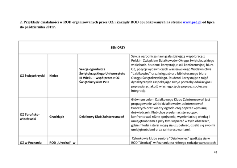 2. Przykłady działalności w ROD organizowanych przez OZ i Zarządy ROD opublikowanych na stronie www.pzd.pl od lipca do października 2015r. SENIORZY OZ Świętokrzyski OZ Toruńskowłocławski OZ w Poznaniu Kielce Grudziądz ROD „Urodzaj” w Sekcja ogrodnicza Świętokrzyskiego Uniwersytetu III Wieku – współpraca z OZ Świętokrzyskim PZD Działkowy Klub Zainteresowań Sekcja ogrodnicza nawiązała ściślejszą współpracę z Polskim Związkiem Działkowców Okręgu Świętokrzyskiego w Kielcach. Studenci korzystają z sali konferencyjnej biura OZ, pozycji wydawniczych warszawskiego Wydawnictwa "działkowiec" oraz księgozbioru bibliotecznego biura Okręgu Świętokrzyskiego. Studenci korzystając z zajęć dydaktycznych zaspokajając swoje potrzeby edukacyjne i poprawiając jakość własnego życia poprzez społeczną integrację. Głównym celem Działkowego Klubu Zainteresowań jest propagowanie wśród działkowców, zainteresowań twórczych oraz wiedzy ogrodniczej poprzez wymianę doświadczeń. Klub chce przełamać stereotypy, konfrontować różne spojrzenia, wymieniać się wiedzą i umiejętnościami a przy tym wspierać w tych obszarach, gdzie młodzi i starsi mogą się uzupełniać, dzielić się swoimi umiejętnościami oraz zainteresowaniami. Członkowie klubu seniora "Działkowiec" spotkają się w ROD "Urodzaj" w Poznaniu na różnego rodzaju warsztatach 48 Poznaniu OZ Gdańsk OZ w Gdańsku Tczew ROD im. Sikorskiego w Kwidzynie Artystyczny Klub Seniora Zajęcia ruchowe dla seniorów w Tczewie – „Aktywni Razem” Koło Gospodyń Działkowych np. nauki decoupage (różne rodzaje techniki zdobniczej na metalu, drewnie, szkle itp.) Kolegium Prezesów Zarządów Tczewskich ROD podjęło współprace z Towarzystwem Miłośników Koszykówki „Pomorze” z Tczewa. Wspólnie realizują program aktywności ruchowej osób starszych pod hasłem „Aktywni Razem”. Zajęcia z gimnastyki ogólnokorekcyjnej odbywają się w budynku Domu Działkowca Rodzinnego Ogrodu Działkowego im. Sambora II przy ul. Rokickiej w Tczewie. W Rodzinnym Ogrodzie Działkowym im. gen. Władysława Sikorskiego w Kwidzynie od wiosny 2013 roku działa Koło Gospodyń Działkowych. Jest to miejski odpowiednik Kół Gospodyń Wiejskich, którego głównym celem jest promowanie zdrowej żywności- owoców i warzyw, otrzymanych z upraw w Rodzinnych Ogrodach Działkowych i domowych przetworów wyrabianych z nich na własne potrzeby. Panie często spotykają się w Domu Działkowca lub na swoich działkach przekazując sobie nawzajem i również młodszemu pokoleniu działkowców swoje doświadczenia kulinarne. DZIECI i MŁODZIEŻ OZ w Szczecinie ROD Przyjaźń w Szczecinie Spacer edukacyjny po ogrodzie Uczniowie z klasy drugiej Szkoły Podstawowej nr 56 im. kpt. ż. w. Konstantego Maciejewicza ze Szczecina mieli okazję zobaczyć jak wyglądają ogrody jesienią oraz 49 dla dzieci z szkoły podstawowej OZ Podkarpacki OZ w Gdańsku ROD "Małopolanin" w Rzeszowie ROD im. Ceynowy w Wejherowie Wycieczka edukacyjna po ogrodzie dla dzieci z świetlicy SP „Zielona szkoła - uczmy dzieci dbania o przyrodę” spróbować pysznych jeżyn, malin i winogron prosto z krzaczka. Niektórzy po raz pierwszy widzieli rosnące w ziemi warzywa. Działkowicze przyjęli dzieci bardzo serdecznie. Przygotowano dla dzieci niespodziankę : herbatka, ciasto i świeżo zerwane jabłuszka w świetlicy działkowej. Co to jest kompostownik? Po co przekopujemy ziemię? Kim jest piędzik przedzimek? A jakie prace w ogrodzie trzeba wykonać jesienią? Na te i inne pytania, działkowcy z Rodzinnego Ogrodu Działkowego „Małopolanin” w Rzeszowie odpowiedzieli uczestnikom wycieczki z Zespołu Szkół nr 6 przy ulicy Solarza 16 w Rzeszowie. Dzieci zapoznały się ze sprzętem ogrodniczym i terminarzem prac na działce. Miały też okazję spróbować zerwanych prosto z drzewa, świeżuteńkich, soczystych gruszek, jabłek i słodkich malin. Po tajnikach działkowej przyrody dzieci oprowadziła jedna z działkowiczek Pani Krystyna Kuzdro. Projekt został przygotowany i przeprowadzony jako pierwsza inwestycja w ramach Budżetu Obywatelskiego Miasta Wejherowa. Niezagospodarowanym terenem przy świetlicy ogrodowej przekształcono w miejsce, w którym dzieci mogą poprzez bezpośredni kontakt z przygodą uczyć się o ekologii, ogrodnictwie i zdrowym trybie życia. To nauka przez praktykę. Dzieci będą zajmować się pracami ogrodniczymi. Podczas lekcji uczniowie poznają na czym polega siew, sadzenia i pielęgnacji roślin. W ramach inwestycji dokonano uprzątnięcia dotychczas 50 niezagospodarowanego terenu. Usunięto zadrzewienia i zakrzewienia oraz rozebrano stare ogrodzenia. Uporządkowany teren zagospodarowano na nowo poprzez wykonanie chodnika z kostki brukowej, ustawienie czterech tablic informacyjnych o florze i faunie występującej w ogrodach a także przygotowanie miejsca pod grządki oraz umieszczono stoły i ławki ogrodowe. OZ Podlaski ROD "Malwa" w Białej Podlaskiej OZ Poznań OZ Toruńskowłocławski ROD im. Roosevelta w Poznaniu ROD „Flisak” w Toruniu Dzieci z Przedszkola Samorządowego Nr 11 wybrały się na spacer ogrodową alejką. Warsztaty w połączeniu ze spacerem umożliwiły im zdobycie wiedzy o środowisku Jesienne warsztaty „Jesień w naturalnym, ogrodach, pozwoliły na obserwowanie sadzie i w ogrodzie„ połączone ze kwiatów, krzewów i drzew owocowych. Przedszkolaki spacerem po ogrodzie poprzez bezpośredni kontakt z naturą wzbogaciły swoje wiadomości i doświadczenia. Lekcje przyrody dla dzieci Lekcje przyrody dla dzieci i młodzieży Uczniowie Szkoły Podstawowej im. Jana III Sobieskiego uczestniczą w lekcjach przyrody organizowanych w ROD poznając m.in. roślinność wczesną jesienią. Dzieci zwiedzając ogród zbierają, co ciekawsze okazy liści różnych roślin do albumu. W zajęciach uczestniczyły dzieci ze Szkoły Podstawowej nr 2 w Toruniu. Pszczelarz, który prowadzi 