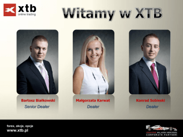 Bartosz Białkowski Senior Dealer forex, akcje, opcje www.xtb.pl Małgorzata Karwat Dealer Konrad Sobieski Dealer Zdobywał wiedzę teoretyczną w obszarze finansów na Wydziale Ekonomiczno-Socjologicznym Uniwersytetu Łódzkiego w Łodzi, a zgłębił ją podczas studiów podyplomowych z zakresu „Mechanizmy funkcjonowania strefy euro” uzyskując dyplom sygnowany przez Uniwersytet Łódzki i NBP. „Nauczycielem wszystkiego jest praktyka” to motto Juliusza Cezara towarzyszy mu od wielu lat, dlatego też jeszcze przed podjęciem studiów ekonomicznych rozpoczął proces inwestowania swojego kapitału poznając tym samym arkana rynków. Pierwsze doświadczenia zdobył inwestując w akcje spółek giełdowych notowanych na GPW w Warszawie, następnie jego obiektem zainteresowań stały się kontrakty terminowe, rynek walutowy i towarowy na których inwestuje do dziś. Dokonując transakcji na rynkach finansowych, kieruje się głownie analizą techniczną ze szczególnym uwzględnieniem Teorii fal Elliotta oraz geometrii rynku. Obecnie na stanowisku Senior Dealer/Team Leader w Domu Maklerskim XTB, gdzie swoją wiedzą i doświadczeniem dzieli się z inwestorami prowadząc szkolenia z analizy technicznej rynków finansowych. Stres towarzyszący inwestowaniu na własny rachunek i pracy w branży finansowej koi na morzach i skandynawskich jeziorach, wędkując z zapałem lub uprawiając sporty zimowe. [email protected] – Merytoryczne i techniczne wsparcie klientów rzeczywistych forex, akcje, opcje www.xtb.pl Dealer X-Trade Brokers DM S.A., mgr administracji Uniwersytetu Warszawskiego. Specjalizuje się w analizie technicznej, swoje doświadczenie zdobywała inwestując na rynku giełdowym i Forex. Podczas szkoleń zarówno stacjonarnych jak i internetowych przedstawia zagadnienia z zakresu analizy technicznej. Posługuje się językiem angielskim i hiszpańskim. Interesuje się mieszanymi sztukami walki, w wolnych chwilach trenuje siatkówkę i ściankę wspinaczkową. [email protected] – Pomoc merytoryczna i otwieranie rachunków rzeczywistych forex, akcje, opcje www.xtb.pl Pracuje w X Trade Brokers DM. S.A. na stanowisku Dealera walutowego. Absolwent Wyższej Szkoły Ekonomiczno-Informatycznej w Warszawie, który na kierunku Ekonomii ukończył specjalizację „Finanse i Bankowość” oraz „Małe i Średnie Przedsiębiorstwa”. Obszarami jego zainteresowań związanych z rynkiem finansowym jest zarówno analiza fundamentalna jak i techniczna. To właśnie kompilację tych dwóch sposobów podejścia do rynków stosuje w swoich inwestycjach. Wiedzę na temat rynków oraz dodatkowe umiejętności zdobyte poprzez inwestowanie na Giełdzie Papierów Wartościowych jak i na rynku Forex, przekazuje prowadząc szkolenia internetowe dla inwestorów. [email protected] – Rachunki demonstracyjne, pomoc techniczna forex, akcje, opcje www.xtb.pl Pobrałeś właśnie wersję demonstracyjną platformy transakcyjnej. Rozpocznij testy, a my pomożemy Ci poznać rynek walutowy, surowcowy oraz rynki zagraniczne. forex, akcje, opcje www.xtb.pl Jakie możliwości daje platforma MetaTrader ? • umożliwia inwestowanie na rynku walutowym, towarów, indeksów oraz Equity CFD • pozwala na automatyzację handlu • oferuje ogromną ilość narzędzi do analizy technicznej • umożliwia korzystanie ze strategii i wskaźników forex, akcje, opcje www.xtb.pl 6 Poznaj podstawowe pojęcia • • • • • Pips Lot Depozyt zabezpieczający Stop loss Take profit forex, akcje, opcje www.xtb.pl EUR/USD jako przykład pary walutowej CFD forex, akcje, opcje www.xtb.pl 8 Wszystkie niezbędne informacje dotyczące każdego instrumentu znajdziesz w Tabeli Specyfikacji Instrumentów Finansowych forex, akcje, opcje www.xtb.pl 9 PIPS – najmniejsza możliwa zmiana ceny Pips (inaczej punkt) jest najmniejszą wartością, o jaką może się zmienić notowanie instrumentu. Procedura obliczania 1 Pipsa (przykład dla USDPLN): Uwaga: Wielkość Pipsa liczymy od drugiej waluty w parze • Wielkość jednego Pipsa dla USDPLN: 0,0001 („Tabela Specyfikacji Instrumentów Finansowych”) 1 Pips = 0,0001 * 100 000 PLN = 10 PLN LOT – jednostka transakcyjna kontraktu Dla walut 1 Lot = 100 000 waluty bazowej forex, akcje, opcje www.xtb.pl 10 PIPS – najmniejsza możliwa zmiana ceny Procedura obliczania 1 Pipsa (przykład dla surowców) - Wielkość jednego Pipsa dla SILVERs: 0,01 („Tabela Specyfikacji Instrumentów Finansowych”) -1 lot SILVERs = Cena uncji srebra troy x 5 000 USD -1 pips dla jednego lota wynosi 0.01 x 5 000 USD = 50 USD -1 pips dla długiej pozycji SILVERs: 50 USD x 3.2618 USDPLN (BID) = 163.09 PLN Procedura obliczania 1 Pipsa (przykład dla indeksu) - Minimalny krok notowań dla W.20 wynosi 1 - Mnożnik równa się 10 -Tak więc,1 pips dla 1 lota W.20 to: 10 PLN x 1 = 10 PLN forex, akcje, opcje www.xtb.pl Depozyt zabezpieczający • zabezpieczenie rozliczeniowe pobierane przy otwieraniu transakcji; • umożliwia wykorzystanie Dźwigni Finansowej; • wielkość depozytu (standardowo): 1% dla walut; 2% dla indeksów, [3% dla W.20]; 3% dla towarów, [1% dla GOLDs]; 10-25% dla Equity CFD Wyliczenie dla kontraktu o wielkości 1 Lota EURUSD mamy zatem: Depozyt Zabezpieczający = 100 000 EUR * 1% = 1 000 EUR Interpretacja: Aby zawrzeć transakcję o wielkości 100 000 EUR musimy dysponować kwotą wyrażoną w PLN stanowiącej odpowiednik 1000 EUR. forex, akcje, opcje www.xtb.pl 12 Stop Loss oraz Take Profit, czyli kapitał pod kontrolą Stop Loss (Zlecenie obronne): Zamyka automatycznie pozycję z akceptowalną przez inwestora stratą. Cel: ograniczenie straty. Take Profit: Wyznaczony przez inwestora poziom, przy którym zyskowne zlecenie zostanie zamknięte. forex, akcje, opcje www.xtb.pl 13 Pobierz Kalkulator i wbuduj go w platformę XTBi Calculator automatycznie wyliczy wartości pipsa, spreadu, depozytu dla każdej pozycji o dowolnym wolumenie transakcyjnym. Skrypt można pobrać z naszej strony