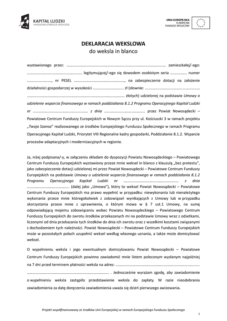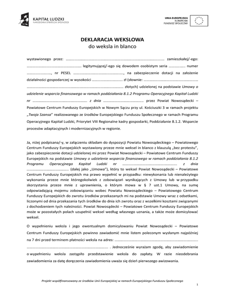 DEKLARACJA WEKSLOWA do weksla in blanco wystawionego przez: ……………………………………………………………………………………….… zamieszkałej/-ego: ……………………..…………………………. legitymującej/-ego się dowodem osobistym seria ……..….….. numer …………..……..…, nr PESEL ………………..……………………….…., na zabezpieczenie dotacji na założenie działalności gospodarczej w wysokości ………………….………. zł (słownie: ………………………………………………… ………………………………….…………….……………………………………… złotych) udzielonej na podstawie Umowy o udzielenie wsparcia finansowego w ramach poddziałania 8.1.2 Programu Operacyjnego Kapitał Ludzki nr ………………………….………….…………. z dnia ……………………….………….. przez Powiat Nowosądecki – Powiatowe Centrum Funduszy Europejskich w Nowym Sączu przy ul. Kościuszki 3 w ramach projektu „Twoja Szansa” realizowanego ze środków Europejskiego Funduszu Społecznego w ramach Programu Operacyjnego Kapitał Ludzki, Priorytet VIII Regionalne kadry gospodarki, Poddziałanie 8.1.2. Wsparcie procesów adaptacyjnych i modernizacyjnych w regionie. Ja, niżej podpisana/-y, w załączeniu składam do dyspozycji Powiatu Nowosądeckiego – Powiatowego Centrum Funduszy Europejskich wystawiony przeze mnie weksel in blanco z klauzulą „bez protestu”, jako zabezpieczenie dotacji udzielonej mi przez Powiat Nowosądecki – Powiatowe Centrum Funduszy Europejskich na podstawie Umowy o udzielenie wsparcia finansowego w ramach poddziałania 8.1.2 Programu Operacyjnego Kapitał Ludzki nr ………………………….………….…………. z dnia …………………………………….. (dalej jako „Umowa”), który to weksel Powiat Nowosądecki – Powiatowe Centrum Funduszy Europejskich ma prawo wypełnić w przypadku: niewykonania lub nienależytego wykonania przeze mnie któregokolwiek z zobowiązań wynikających z Umowy lub w przypadku skorzystania przeze mnie z uprawnienia, o którym mowa w § 7 ust.1 Umowy, na sumę odpowiadającą mojemu zobowiązaniu wobec Powiatu Nowosądeckiego – Powiatowego Centrum Funduszy Europejskich do zwrotu środków przekazanych mi na podstawie Umowy wraz z odsetkami, liczonymi od dnia przekazania tych środków do dnia ich zwrotu oraz z wszelkimi kosztami związanymi z dochodzeniem tych należności. Powiat Nowosądecki – Powiatowe Centrum Funduszy Europejskich może w pozostałych polach uzupełnić weksel według własnego uznania, a także może domicylować weksel. O wypełnieniu weksla i jego ewentualnym domicylowaniu Powiat Nowosądecki – Powiatowe Centrum Funduszy Europejskich powinno zawiadomić mnie listem poleconym wysłanym najpóźniej na 7 dni przed terminem płatności weksla na adres: ………………………………………………………………….……….. …………………………………………………………………………. . Jednocześnie wyrażam zgodę, aby zawiadomienie o wypełnieniu weksla zastąpiło przedstawienie weksla do zapłaty. W razie nieodebrania zawiadomienia za datę doręczenia zawiadomienia uważa się dzień pierwszego awizowania. Projekt współfinansowany ze środków Unii Europejskiej w ramach Europejskiego Funduszu Społecznego 1 Niniejsza deklaracja jest bezwarunkowa i nieodwołalna. Deklaracja i złożony weksel in blanco tracą ważność jedynie w przypadku, gdy Umowa zostanie wykonana, a jej warunki zostaną dotrzymane i zostaną zakończone rozliczenia pomiędzy Stronami Umowy. Po wypełnieniu warunków Umowy i zakończeniu rozliczeń między Stronami Umowy wystawca weksla zostanie pisemnie wezwany przez Powiat Nowosądecki – Powiatowe Centrum Funduszy Europejskich do odebrania weksla. Jednocześnie wystawca weksla wyraża zgodę na zniszczenie weksla w przypadku nieodebrania go we wskazanym w wezwaniu terminie. Dodatkowo, oświadczam że (należy zakreślić „x” w prostokącie przy prawidłowej odpowiedzi): 1. Nie pozostaję w związku małżeńskim. 2. Pozostaję w związku małżeńskim i posiadam wspólność majątkową małżeńską z moim małżonkiem. 3. Pozostaję w związku małżeńskim, ale posiadamy rozdzielność majątkową. 4. Pozostaję w prawnej separacji z moim małżonkiem (orzeczonej postanowieniem sądu). .................................................................................................. (data, miejsce i podpis) W sytuacji zaznaczenia w powyższym oświadczeniu Wystawcy weksla odpowiedzi nr 2, koniecznym jest złożenie oświadczenia przez współmałżonka Beneficjenta o wyrażeniu zgodny na wystawienie weksla in blanco: Ja, niżej podpisana/-y ………………………………………..………..….….. zamieszkała/-y: ………………………………… …………………………………………………………………………………………….., seria i numer dowodu osobistego ………………………………………….……….., PESEL ………………………………….… wyrażam zgodę na wystawienie przez moją współmałżonkę/mojego współmałżonka ……………………………………………………….. weksla in blanco z klauzulą „bez protestu” opisanego w niniejszej deklaracji wekslowej. .................................................................................................. (data i podpis) Potwierdzam odbiór weksla oraz własnoręczność złożonych w mojej obecności podpisów Wystawcy i Poręczyciela na deklaracji i wekslu: ……………………………………………………………………………………… (data i podpis pracownika Powiatowego Centrum Funduszy Europejskich odbierającego deklarację) Projekt współfinansowany ze środków Unii Europejskiej w 