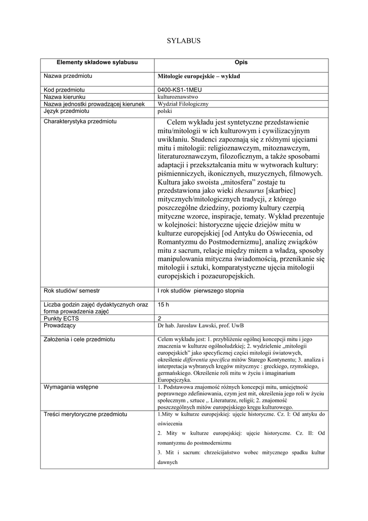 SYLABUS Elementy składowe sylabusu Opis Nazwa przedmiotu Mitologie europejskie – wykład Kod przedmiotu Nazwa kierunku Nazwa jednostki prowadzącej kierunek Język przedmiotu 0400-KS1-1MEU kulturoznawstwo Wydział Filologiczny polski Charakterystyka przedmiotu Celem wykładu jest syntetyczne przedstawienie mitu/mitologii w ich kulturowym i cywilizacyjnym uwikłaniu. Studenci zapoznają się z różnymi ujęciami mitu i mitologii: religioznawczym, mitoznawczym, literaturoznawczym, filozoficznym, a także sposobami adaptacji i przekształcania mitu w wytworach kultury: piśmienniczych, ikonicznych, muzycznych, filmowych. Kultura jako swoista „mitosfera” zostaje tu przedstawiona jako wieki thesaurus [skarbiec] mitycznych/mitologicznych tradycji, z którego poszczególne dziedziny, poziomy kultury czerpią mityczne wzorce, inspiracje, tematy. Wykład prezentuje w kolejności: historyczne ujęcie dziejów mitu w kulturze europejskiej [od Antyku do Oświecenia, od Romantyzmu do Postmodernizmu], analizę związków mitu z sacrum, relacje między mitem a władzą, sposoby manipulowania mityczna świadomością, przenikanie się mitologii i sztuki, komparatystyczne ujęcia mitologii europejskich i pozaeuropejskich. Rok studiów/ semestr I rok studiów pierwszego stopnia Liczba godzin zajęć dydaktycznych oraz forma prowadzenia zajęć Punkty ECTS Prowadzący 15 h Założenia i cele przedmiotu Celem wykładu jest: 1. przybliżenie ogólnej koncepcji mitu i jego znaczenia w kulturze ogólnoludzkiej; 2. wydzielenie „mitologii europejskich” jako specyficznej części mitologii światowych, określenie differentia specifica mitów Starego Kontynentu; 3. analiza i interpretacja wybranych kręgów mitycznyc : greckiego, rzymskiego, germańskiego. Określenie roli mitu w życiu i imaginarium Europejczyka. 1. Podstawowa znajomość różnych koncepcji mitu, umiejętność poprawnego zdefiniowania, czym jest mit, określenia jego roli w życiu społecznym , sztuce ,. Literaturze, religii; 2. znajomość poszczególnych mitów europejskiego kręgu kulturowego. Wymagania wstępne Treści merytoryczne przedmiotu 2 Dr hab. Jarosław Ławski, prof. UwB 1.Mity w kulturze europejskiej: ujęcie historyczne. Cz. I: Od antyku do oświecenia 2. Mity w kulturze europejskiej: ujęcie historyczne. Cz. II: Od romantyzmu do postmodernizmu 3. Mit i sacrum: chrześcijaństwo wobec mitycznego spadku kultur dawnych 4. Mit, władza, historia. 5. Świadomość historyczna a świadomość mityczna. Manipulacje mitem 6. Mit i sztuka. Sposoby wykorzystania mitu w dziele literackim, plastycznym, muzycznym i filmowym 7. Forma i warunki zaliczenia przedmiotu Mit Europy? Kultura masowa i mit. Komparatystyka i mit Egzamin. Zagadnienia egzaminacyjne: 1. Pytanie dotyczące lektur obowiązkowych z ćwiczeń z mitologii. 2. Pytanie dotyczące listy lektur obowiązkowych z wykładu. 3. Opracowanie adaptacji dowolnego mitu w kulturze współczesnej [literaturze, sztukach plastycznych, muzyce, życiu społecznym etc.; opracowywany mit zgłaszamy do końca roku na kartce z nazwiskiem lub mailowo: [email protected]]. Wykaz literatury podstawowej i uzupełniającej Lektury: A. Obowiązkowe: 1. K. Armstrong, Krótka historia mitu, przeł. I. Kania, Kraków 2005. 2. M. Eliade, Aspekty mitu, przeł. P. Mrówczyński, Warszawa 1998. 3. H. Markiewicz, Literatura a mity, „Twórczość” 1987, z. 10. 4. D. A. Leeming, M. A. Leeming, Mity o stworzeniu świata, Poznań 1999 [tu obowiązuje znajomość 5 wybranych haseł]. 5. S. Filipowicz, Mit i spektakl władzy, Warszawa 1988. B. Fakultatywne: 1. E. Mieletinski, Poetyka mitu, przeł. J. Dancygier, wstęp M. R. Mayenowa, Warszawa 1981. 2. D. de Rougemont, Miłość a świat kultury zachodniej, przeł. L. Eustachiewicz, Warszawa 1999. 3. G. van der Leeuv, Fenomenologia religii, przeł. J. Prokopiuk, Warszawa 1978 [ wybrany rozdział ]. 4. J. P. Roux, Krew: mity, symbole, rzeczywistość, przeł. M. Perek, Karków 1994 [wybrany rozdział] 5. P. Oczko, Życie i śmierć doktora Fausta, Kraków 2010. 6. M. Janion, Niesamowita Słowiańszczyzna, Karków 2007.