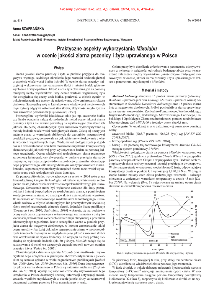 Prosimy cytować jako: Inż. Ap. Chem. 2014, 53, 6, 418-420 INŻYNIERIA I APARATURA CHEMICZNA str. 418 Nr 6/2014 Anna SZAFRAŃSKA e-mail: [email protected] Zakład Przetwórstwa Zbóż i Piekarstwa, Instytut Biotechnologii Przemysłu Rolno-Spożywczego, Warszawa Praktyczne aspekty wykorzystania Mixolabu w ocenie jakości ziarna pszenicy i żyta uprawianego w Polsce Wstęp Ocena jakości ziarna pszenicy i żyta w punkcie przyjęcia do magazynu wymaga szybkiego określenia jego wartości technologicznej w aspekcie właściwości białka i skrobi. W ocenie ziarna pszenicy najczęściej wykonywane jest oznaczenie ilości i jakości białek glutenowych oraz liczby opadania. Jakość ziarna żyta określana jest za pomocą mniejszej liczby wyróżników. Przy ocenie wartości wypiekowej żyta nie uwzględnia się oceny cech białka, ponieważ w cieście żytnim w trakcie mieszenia nie tworzy się usieciowana, trójwymiarowa struktura białkowa. Szczególną rolę w kształtowaniu właściwości wypiekowych mąki żytniej odgrywa natomiast stan skrobi, aktywność amylolityczna oraz zawartość pentozanów [Gąsiorowski, 1993]. Poszczególne wyróżniki jakościowe takie jak np. zawartość białka czy liczba opadania należą do pośrednich metod oceny jakości ziarna pszenicy i żyta i nie zawsze pozwalają na wystarczające określenie ich jakości. Do pełnej charakterystyki tych surowców wykorzystywane są metody badania właściwości reologicznych ciasta. Zaletą tej oceny jest badanie ciasta w warunkach zbliżonych do warunków przemysłowej produkcji pieczywa, co pozwala na dokładniejsze wnioskowanie o właściwościach wypiekowych mąki. Wadą metod reologicznych jest jednak ich czasochłonność oraz brak możliwości uzyskania kompleksowej charakterystyki jakościowej przy wykonywaniu badań za pomocą jednego urządzenia. Ocena właściwości reologicznych ciasta pszennego za pomocą farinografu czy alweografu, w punkcie przyjęcia ziarna do magazynu, wymaga przeprowadzenia próbnego przemiału laboratoryjnego poprzedzonego kilkunastogodzinnym kondycjonowaniem ziarna. Ponadto, za pomocą wspomnianych urządzeń nie ma możliwości wykonania oceny cech reologicznych ciasta żytniego. Za pomocą Mixolabu, wprowadzonego na rynek w 2004 roku przez francuską firmę Chopin Technologies, określane są właściwości reologiczne ciasta jednocześnie w zakresie kompleksu białkowego jak i skrobiowego. Oznaczenie może być wykonane zarówno dla śruty pszennej, jak i żytniej bezpośrednio po rozdrobnieniu ziarna, z pominięciem kondycjonowania ziarna, co znacząco skraca czas uzyskania wyników. W zależności od zastosowanego rozdrabniacza laboratoryjnego i ustawienia walców w młynie laboratoryjnym lub przemysłowym uzyska się różny stopień uszkodzenia ziarenek skrobi. Jednakże liczne publikacje [Stoenescu i in., 2010; Szafrańska, 2010] wskazują, że na podstawie oceny cech ciasta uzyskanego z ześrutowanego ziarna można z dużą dokładnością wnioskować o cechach ciasta z mąki otrzymanej z przemiału laboratoryjnego tego ziarna. Jest to szczególnie ważne w punkcie przyjęcia ziarna do magazynu zbożowego, w którym zastosowanie takiej oceny umożliwi bardziej dokładne segregowanie ziarna w poszczególnych komorach magazynu ze względu na jego jakość i znacznie skróci czas oczekiwania na wynik końcowy. Ze względu na małą próbkę niezbędną do wykonania badania (ok. 50 g śruty), Mixolab nadaje się do zastosowania również we wczesnych etapach hodowli nowych odmian pszenicy i żyta [Peňa i in., 2007]. Charakterystyka działania aparatu Mixolab oraz możliwości wykorzystania tego urządzenia w przemyśle zbożowo-młynarskim i piekarskim są szeroko opisane w wielu zagranicznych publikacjach [Koksel i in., 2009; Banu i in., 2010; Stoenescu i in., 2010]. Dane dotyczące oceny jakości ziarna zbieranego w Polsce są natomiast nieliczne [Szafrańska, 2011a; 2013]. Wydaje się więc konieczne aby użytkownikom tego urządzenia w Polsce dostarczyć szerszej informacji dotyczącej zróżnicowania wyników uzyskiwanych w ocenie jakości śruty całoziarnowej otrzymanej z ziarna pszenicy i żyta uprawianego w kraju. Celem pracy było określenie zróżnicowania parametrów odczytywanych z wykresu w zależności od rodzaju badanego zboża oraz wyznaczenie zależności między wyróżnikami jakościowymi tradycyjnie stosowanymi w ocenie jakości ziarna pszenicy i żyta uprawianego w Polsce a parametrami uzyskanymi z Mixolabu. Materiał i metody Materiał badawczy stanowiło 15 próbek ziarna pszenicy (odmiany: Bombona – pszenica jara oraz Ludwig i Muszelka – pszenica ozima) dostarczonych z Ośrodków Doradztwa Rolniczego oraz 15 próbek ziarna żyta z magazynów zbożowych. Próbki pochodziły z ziarna uprawianego na terenie województw: Zachodnio-Pomorskiego, Wielkopolskiego, Kujawsko-Pomorskiego, Podlaskiego, Mazowieckiego, Łódzkiego, Lubelskiego i Opolskiego). Ziarno rozdrobniono za pomocą rozdrabniacza laboratoryjnego Lab Mill 3100 o średnicy oczek sita 0,8 mm. Oznaczenia. W uzyskanej śrucie całoziarnowej oznaczono poniższe cechy: – zawartość białka (Nx5,7 pszenica; Nx6,25 żyto) wg [PN-EN ISO 20483:2007], – liczbę opadania wg [PN-EN ISO 3093:2010], – barwę – za pomocą trójbodźcowego kolorymetru Minolta CR-310 stosując system pomiarowy L*a*b*. Właściwości reologiczne ciasta za pomocą Mixolabu oznaczono wg [ISO 17718:2013] zgodnie z protokołem Chopin Wheat+ w przypadku pszenicy oraz protokołem Chopin+ w przypadku żyta. Badanie cech reologicznych ciasta ze śruty pszennej i żytniej przebiegało dwuetapowo. W pierwszym etapie wyznaczono wodochłonność śruty, odpowiadającą konsystencji ciasta w punkcie C1 wynoszącej 1,1±0,05 N·m. W drugim etapie badano zmiany cech ciasta podczas jego tworzenia i dalszego mieszenia w zmiennych warunkach temperatury w czasie 45 min [Dubat 2010]. Na wykresie (Rys. 1), rejestrowane są zmiany o