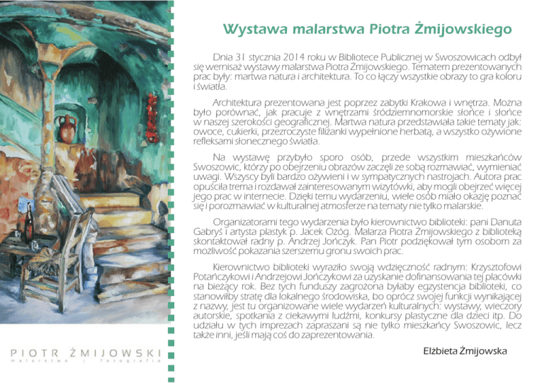 Wystawa malarstwa Piotra ¯mijowskiego Dnia 31 stycznia 2014 roku w Bibliotece Publicznej w Swoszowicach odby³ siê wernisa¿ wystawy malarstwa Piotra ¯mijowskiego. Tematem prezentowanych prac by³y: martwa natura i architektura. To co ³¹czy wszystkie obrazy to gra koloru i œwiat³a. Architektura prezentowana jest poprzez zabytki Krakowa i wnêtrza. Mo¿na by³o porównaæ, jak pracuje z wnêtrzami œródziemnomorskie s³oñce i s³oñce w naszej szerokoœci geograficznej. Martwa natura przedstawia³a takie tematy jak: owoce, cukierki, przezroczyste fili¿anki wype³nione herbat¹, a wszystko o¿ywione refleksami s³onecznego œwiat³a. Na wystawê przyby³o sporo osób, przede wszystkim mieszkañców Swoszowic, którzy po obejrzeniu obrazów zaczêli ze sob¹ rozmawiaæ, wymieniaæ uwagi. Wszyscy byli bardzo o¿ywieni i w sympatycznych nastrojach. Autora prac opuœci³a trema i rozdawa³ zainteresowanym wizytówki, aby mogli obejrzeæ wiêcej jego prac w internecie. Dziêki temu wydarzeniu, wiele osób mia³o okazjê poznaæ siê i porozmawiaæ w kulturalnej atmosferze na tematy nie tylko malarskie. Organizatorami tego wydarzenia by³o kierownictwo biblioteki: pani Danuta Gabryœ i artysta plastyk p. Jacek O¿óg. Malarza Piotra ¯mijowskiego z bibliotek¹ skontaktowa³ radny p. Andrzej Joñczyk. Pan Piotr podziêkowa³ tym osobom za mo¿liwoœæ pokazania szerszemu gronu swoich prac. Kierownictwo biblioteki wyrazi³o swoj¹ wdziêcznoœæ radnym: Krzysztofowi Potañczykowi i Andrzejowi Joñczykowi za uzyskanie dofinansowania tej placówki na bie¿¹cy rok. Bez tych funduszy zagro¿ona by³aby egzystencja biblioteki, co stanowi³by stratê dla lokalnego œrodowiska, bo oprócz swojej funkcji wynikaj¹cej z nazwy, jest tu organizowane wiele wydarzeñ kulturalnych: wystawy, wieczory autorskie, spotkania z ciekawymi ludŸmi, konkursy plastyczne dla dzieci itp. Do udzia³u w tych imprezach zapraszani s¹ nie tylko mieszkañcy Swoszowic, lecz tak¿e inni, jeœli maj¹ coœ do zaprezentowania. El¿bieta ¯mijowska