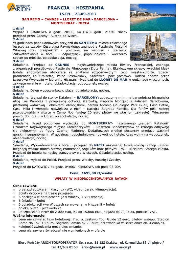FRANCJA - HISZPANIA 15.09 – 23.09.2017 SAN REMO – CANNES – LLORET DE MAR - BARCELONA – MONTSERRAT - NICEA 1 dzień Wyjazd z KRAKOWA o godz. 20:00, KATOWIC godz. 21:30. Nocny przejazd przez Czechy i Austrię do Włoch. 2 dzień W godzinach popołudniowych przyjazd do SAN REMO miasta założonego jeszcze za czasów Cesarstwa Rzymskiego, znanego z Festiwalu Piosenki Włoskiej oraz przepięknej - położonej na wzgórzu - Starówki. Zakwaterowanie w hotelu – odpoczynek, popołudniowo - wieczorny spacer po mieście, obiadokolacja, nocleg. 3 dzień Śniadanie. Przejazd do CANNES – najsławniejszego miasta Riwiery Francuskiej, znanego z organizacji prestiżowego Festiwalu Filmowego (Złota Palma). Ekskluzywne sklepy, wysokiej klasy hotele, snobistyczna atmosfera są znakami rozpoznawczymi tego miasta-kurortu. Spacer promenadą La Croisette, Pałac Festiwalowy, Starówka, port jachtowy. Dalsza podróż przez Lazurowe Wybrzeże w kierunku Hiszpanii. Przyjazd do LLORET DE MAR w godzinach wieczornych, zakwaterowanie w hotelu, obiadokolacja, odpoczynek, nocleg. 4 dzień Śniadanie. Dzień wypoczynkowy, plaża, obiadokolacja, nocleg. 5 dzień Śniadanie. Wyjazd do stolicy Katalonii – BARCELONY: zobaczymy m.in. najbarwniejszą hiszpańska ulicę Las Ramblas z przepiękną gotycką starówką, wzgórze Montjuic z Pałacem Narodowym, platformą widokową i obiektami olimpijskimi, perełki Antonio Gaudiego: Parc Guell, Casa Batllo, Casa Milla i wreszcie największa z nich – Katedra Sagrada Familia. Dla fanów piłki nożnej przygotowaliśmy wizytę w Camp Nou (wstęp 20 euro płatny we własnym zakresie). Wieczorem powrót do hotelu w Lloret, obiadokolacja, nocleg. 6 dzień Śniadanie. Przed południem wycieczka do MONTSERRAT- nazywanego „sercem Katalonii” i zarazem Najświętszego miejsca Katalończyków - Klasztoru Benedyktynów do którego odbywają się pielgrzymki do figury Czarnej Madonny. Dodatkowych wrażeń dostarczy przejazd wąskimi górskimi serpentynami. W godzinach popołudniowych powrót do hotelu, czas wolny na wypoczynek, obiadokolacja, nocleg. 7 dzień Śniadanie, Wykwaterowanie z hotelu, przejazd do NICEI nazywanej letnią stolicą Francji. Spacer biegnącą wzdłuż morza sławną Promenadą Anglików oraz pełnymi uroku uliczkami Starego Miasta. Przejazd do hotelu na nocleg tranzytowy we Włoszech. Obiadokolacja, nocleg. 8 dzień Śniadanie, wyjazd do Polski. Przejazd przez Włochy, Austrię i Czechy. 9 dzień Przyjazd do KATOWIC / ok godz. 04:00/. KRAKOWA /ok godz.05:00/. Cena: 1695,00 zł/osoba WPŁATY W NIEOPROCENTOWANYCH RATACH Cena zawiera: • przejazd autokarem klasy lux (WC, video, barek, klimatyzacja), • opłaty drogowe na trasie przejazdu • 6 noclegów w hotelach*** (2 x Włochy, 4 x Hiszpania), • 6 śniadań - bufet • 6 obiadokolacji /we Włoszech serwowane, w Hiszpanii – bufet/ • opiekę pilota - przewodnika • ubezpieczenie NNW do 2 000 EUR, KL do 15.000 EUR, bagażu do 200 EUR, podatek VAT. Ważne informacje: • cena nie zawiera: taxy hotelowej: 7 euro, zestawu Tour Guide 12 euro, biletów wstępu: Stadion Camp Nou ok. 18 euro, Sagrada Familia ok 20 euro, przewodnika w Barcelonie: ok. 4 euro/os. • kolejność zwiedzania może ulec zmianie, • cena nie zawiera świadczeń nie wymienionych w ofercie Biuro Podróży ARION TOUROPERATOR Sp. z o.o. 31-128 Kraków, ul. Karmelicka 32 / I piętro / Tel. 12/632 01 50 [email protected] www.arion.pl