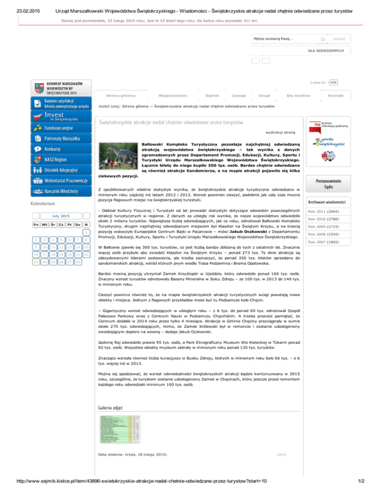 23.02.2015 Urząd Marszałkowski Województwa Świętokrzyskiego Wiadomości Świętokrzyskie atrakcje nadal chętnie odwiedzane przez turystów Dzisiaj jest poniedziałek, 23 lutego 2015 roku. Jest to 53 dzień tego roku. Do końca roku pozostało 311 dni. szukaj Wpisz szukaną frazę... DLA NIEWIDOMYCH Lubię to! Strona główna Województwo Sejmik Zarząd Urząd Dla mediów 936 Kontakt Jesteś tutaj: Strona główna Świętokrzyskie atrakcje nadal chętnie odwiedzane przez turystów Świętokrzyskie atrakcje nadal chętnie odwiedzane przez turystów wydrukuj stronę Bałtowski Kompleks Turystyczny pozostaje najchętniej odwiedzaną atrakcją województwa świętokrzyskiego – tak wynika z danych zgromadzonych przez Departament Promocji, Edukacji, Kultury, Sportu i Turystyki Urzędu Marszałkowskiego Województwa Świętokrzyskiego. Łącznie bilety do niego kupiło 300 tys. osób. Bardzo chętnie odwiedzane są również atrakcje Sandomierza, a na mapie atrakcji pojawiło się kilka ciekawych pozycji. Z opublikowanych właśnie statystyk wynika, że świętokrzyskie atrakcje turystyczne odwiedzano w minionym roku częściej niż latach 2012 i 2013. Wzrost powinien cieszyć, podobnie jak cały czas mocna pozycja flagowych miejsc na świętokrzyskiej turystyki. Kalendarium luty 2015 Pn Wt Śr Cz Pt So N 1 2 3 4 5 6 7 8 9 10 11 12 13 14 15 16 17 18 19 20 21 22 23 24 25 26 27 28 Oddział Kultury Fizycznej i Turystyki od lat prowadzi statystyki dotyczące odwiedzin poszczególnych atrakcji turystycznych w regionie. Z danych za ubiegły rok wynika, że nasze województwo odwiedziło około 2 miliony turystów. Największa liczbę odwiedzających, jak co roku, odnotował Bałtowski Kompleks Turystyczny, drugim najchętniej odwiedzanym miejscem był Klasztor na Świętym Krzyżu, a na trzecią pozycję wskoczyło Europejskie Centrum Bajki w Pacanowie – mówi Jakub Oczkowski z Departamentu Promocji, Edukacji, Kultury, Sportu i Turystyki Urzędu Marszałkowskiego Województwa Świętokrzyskiego. Archiwum wiadomości Rok 2011 (2604) Rok 2010 (2788) Rok 2009 (2719) Rok 2008 (2359) Rok 2007 (1809) W Bałtowie zjawiło się 300 tys. turystów, co jest liczbą bardzo zbliżoną do tych z ostatnich lat. Znacznie więcej osób przybyło aby zwiedzić Klasztor na Świętym Krzyżu – ponad 273 tys. Te dwie atrakcje są zdecydowanymi liderami zestawienia, ale trzeba zaznaczyć, że ponad 350 tys. biletów sprzedano do sandomierskich atrakcji, wśród których prym wiodły Trasa Podziemna i Brama Opatowska. Bardzo mocną pozycję utrzymał Zamek Krzyżtopór w Ujeździe, który odwiedziło ponad 160 tys. osób. Znaczny wzrost turystów odnotowały Baseny Mineralne w Solcu Zdroju – ze 100 tys. w 2013 do 140 tys. w minionym roku. Cieszyć powinno również to, że na mapie świętokrzyskich atrakcji turystycznych wciąż powstają nowe obiekty i miejsca. Jednym z flagowych przykładów może być tu Podzamcze koło Chęcin. – Gigantyczny wzrost odwiedzających w ubiegłym roku – z 6 tys. do ponad 60 tys. odnotował Zespół Pałacowo Parkowy wraz z Centrum Nauki w Podzamczu Chęcińskim. A trzeba przecież pamiętać, że Centrum działało w 2014 roku przez tylko 4 miesiące. Atrakcje w Gminie Chęciny przyciągnęły w sumie około 270 tys. odwiedzających, mimo, że Zamek Królewski był w remoncie i zostanie udostępniony zwiedzającym dopiero na wiosnę – dodaje Jakub Oczkowski. Jaskinię Raj odwiedziło prawie 95 tys. osób, a Park Etnograficzny Muzeum Wsi Kieleckiej w Tokarni ponad 92 tys. osób. Wszystkie obiekty muzeum zebrały w minionym roku ponad 130 tys. turystów. Znacząco wzrosła również liczba kuracjuszy w Busku Zdroju, których w minionym roku było 66 tys. – o 6 tys. więcej niż w 2013. Można się spodziewać, że wzrost odwiedzalności świętokrzyskich atrakcji będzie kontynuowany w 2015 roku, szczególnie, że turystom zostanie udostępniony Zamek w Chęcinach, który jeszcze przed remontem każdego roku odwiedzało minimum 100 tys. osób. Galeria zdjęć Data dodania: środa, 18 lutego 2015r. http://www.sejmik.kielce.pl/item/43896swietokrzyskieatrakcjenadalchetnieodwiedzaneprzezturystow?start=10 cofnij 1/2