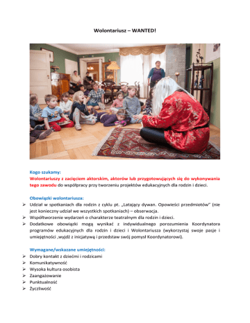 Wolontariusz – WANTED! Kogo szukamy: Wolontariuszy z zacięciem aktorskim, aktorów lub przygotowujących się do wykonywania tego zawodu do współpracy przy tworzeniu projektów edukacyjnych dla rodzin i dzieci. Obowiązki wolontariusza: Udział w spotkaniach dla rodzin z cyklu pt. „Latający dywan. Opowieści przedmiotów” (nie jest konieczny udział we wszystkich spotkaniach) – obserwacja. Współtworzenie wydarzeń o charakterze teatralnym dla rodzin i dzieci. Dodatkowe obowiązki mogą wynikać z indywidualnego porozumienia Koordynatora programów edukacyjnych dla rodzin i dzieci i Wolontariusza (wykorzystaj swoje pasje i umiejętności ,wyjdź z inicjatywą i przedstaw swój pomysł Koordynatorowi). Wymagane/wskazane umiejętności: Dobry kontakt z dziećmi i rodzicami Komunikatywność Wysoka kultura osobista Zaangażowanie Punktualność Życzliwość Dobra organizacja pracy i umiejętność współpracy Uśmiech Dostępność: Do ustalenia - możliwość ruchomego czasu pracy jeśli Koordynator z Wolontariuszem wspólnie ustalą inne reguły współpracy. Jak aplikować: Napisać na adres: [email protected] Co oferujemy: umowę i zaświadczenie oprowadzanie po galeriach i wystawach Muzeum miłą atmosferę możliwość poznania Muzeum „od kuchni” możliwość realizacji swoich pomysłów i rozwijania talentów Czytaj dalej jeśli jesteś zainteresowany... Opis cyklu spotkań dla rodzin z dziećmi pt. „Latający dywan. Opowieści przedmiotów”: Dawno, dawno temu, za górami, za lasami... A co, jeśli wcale nie tak daleko, tylko tuż za rogiem, dzieją się rzeczy niezwykłe, rodem z niejednej baśni? Opowieści przedmiotów to cykl spotkań dla dzieci z rodzicami, odbywających się w konwencji miniatur teatralnych, w których ważną rolę odegra improwizacja i interakcja z widzem. Podstawową formą artystyczną jest tu przygotowana na kanwie baśni opowieść, której bezpośrednią inspiracją są wybrane przykłady rzemiosła artystycznego, tkanin, biżuterii lub broni ze zbiorów Muzeum. Informacje dodatkowe: ● ● ● ● Cykl przeznaczony jest dla dzieci w wieku ok. 5–7 lat. Spotkania odbywają się w wybrane soboty o godz. 12.00 i trwają około 45 minut. Spotkania mają miejsce w przestrzeni ekspozycji muzealnych wybranych Oddziałów Muzeum. Na wszystkie Twoje pytanie odpowie koordynator spotkań Szczegółowy opis każdego spotkania: ● 3.10.2015 (sobota), godz. 12.00 Gmach Główny/Galeria Rzemiosła Artystycznego, al. 3 Maja 1 Bez słów rozmowa O tym, że czasem trzeba uważnie patrzeć, by dobrze usłyszeć. Prowadzenie: Cieszka Żółtko – Stowarzyszenie SZTUKMISJA Bohater spotkania: wachlarz Cena: 8 zł Liczba miejsc ograniczona, konieczna rezerwacja: [email protected] Rezerwacja od: 21.09.2015 ● 10.10.2015 (sobota), godz. 12.00 Dom Józefa Mehoffera, ul. Krupnicza 26 Stukające buty O tym, że smutek lub złość czasem warto wytańczyć, a miłość najlepiej wyśpiewać. Prowadzenie: Dagmara Żabska – TEATR FIGUR Bohaterka spotkania: tancerka flamenco Cena: 8 zł Liczba miejsc ograniczona, konieczna rezerwacja: [email protected] Rezerwacja od: 28.09.2015 ● 24.10.2015 (sobota), godz. 12.00 Europeum – Ośrodek Kultury Europejskiej, pl. Sikorskiego 6 Ballada rycerska O tym, że król ma rycerza, rycerz ma giermka, a giermek ma opowieść. Prowadzenie: Tadeusz Dylawerski – TEATR FIGUR Bohater spotkania: Don Kichot Cena: 8 zł Liczba miejsc ograniczona, konieczna rezerwacja: [email protected] Rezerwacja od: 12.10.2015 ● 7.11.2015 (sobota), godz. 12.00 Muzeum im. Emeryka Hutten-Czapskiego, ul. Piłsudskiego 12 Żeglarz Bagdadu O tym, że są miejsca, w których pieniądz to nie złoto. Prowadzenie: Dagmara Żabska – TEATR FIGUR Bohater spotkania: muszelki kauri Cena: 8 zł Liczba miejsc ograniczona, konieczna rezerwacja: [email protected] Rezerwacja od: 26.10.2015 ● 14.11.2015 (sobota), godz. 12.00 Kamienica Szołayskich im. Feliksa Jasieńskiego/wystawa: Niech żyje sztuka! Kolekcja Feliksa Jasieńskiego. Od Japonii do Europy. Rzeczy piękne i użyteczne, pl. Szczepański 9 Sówka, która się bała ciemności O tym, że pokonany strach staje się naszą siłą. Prowadzenie: Cieszka Żółtko – Stowarzyszenie SZTUKMISJA Bohater spotkania: Sówka na gałęzi sosny Cena: 8 zł Liczba miejsc ograniczona, konieczna rezerwacja: [email protected] Rezerwacja od: 2.11.2015 ● 12.12.2015 (sobota), godz. 12.00 Dom Jana Matejki, ul. Floriańska 41 Gdy nad wodą zalśni gwiazda szczęśliwa O tym, że zimowa noc kiedyś się kończy, a Łucja znaczy światło. Prowadzenie: Cieszka Żółtko – Stowarzyszenie SZTUKMISJA Bohater spotkania: żyrandol Cena: 8 zł Liczba miejsc ograniczona, konieczna rezerwacja: [email protected] Rezerwacja od: 30.11.2015 ● 9.01.2016 (sobota), godz. 12.00 Muzeum Książąt Czartoryskich – Arsenał, ul. Pijarska 8 Błoto z piety Achillesa O tym, że nawet super bohaterowie muszą dbać o higienę. Prowadzenie: Tadeusz Dylawerski – TEATR FIGUR Bohater spotkania: strigilla Cena: 8 zł Liczba miejsc ograniczona, konieczna rezerwacja: [email protected] Rezerwacja od: 21.12.2015 ● 30.01.2016 (sobota), godz. 12.00 Dom Jana Matejki, ul. Floriańska 41 Trzewiki szczęścia O tym, że czasem magia może mieszkać na dnie buta. Prowadzenie: Dagmara Żabska – TEATR FIGUR Bohater spotkania: buty Cena: 8 zł Liczba miejsc ograniczona, konieczna rezerwacja: [email protected] Rezerwacja od: 18.01.2016