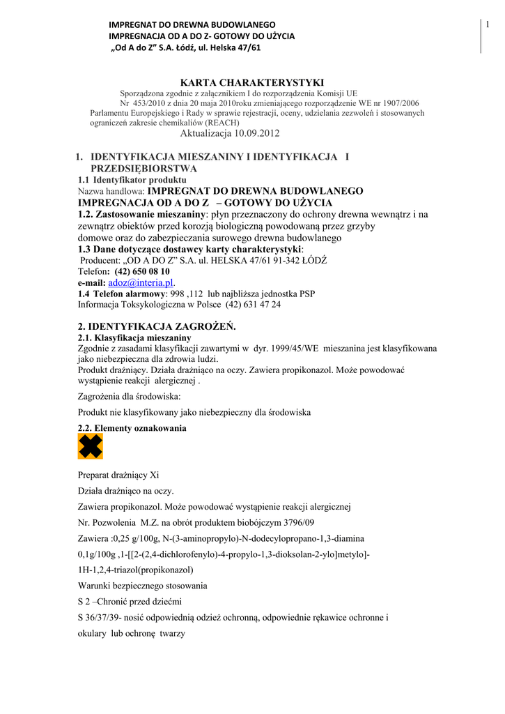 IMPREGNAT DO DREWNA BUDOWLANEGO IMPREGNACJA OD A DO Z- GOTOWY DO UŻYCIA „Od A do Z” S.A. Łódź, ul. Helska 47/61 KARTA CHARAKTERYSTYKI Sporządzona zgodnie z załącznikiem I do rozporządzenia Komisji UE Nr 453/2010 z dnia 20 maja 2010roku zmieniającego rozporządzenie WE nr 1907/2006 Parlamentu Europejskiego i Rady w sprawie rejestracji, oceny, udzielania zezwoleń i stosowanych ograniczeń zakresie chemikaliów (REACH) Aktualizacja 10.09.2012 1. IDENTYFIKACJA MIESZANINY I IDENTYFIKACJA I PRZEDSIĘBIORSTWA 1.1 Identyfikator produktu Nazwa handlowa: IMPREGNAT DO DREWNA BUDOWLANEGO IMPREGNACJA OD A DO Z – GOTOWY DO UŻYCIA 1.2. Zastosowanie mieszaniny: płyn przeznaczony do ochrony drewna wewnątrz i na zewnątrz obiektów przed korozją biologiczną powodowaną przez grzyby domowe oraz do zabezpieczania surowego drewna budowlanego 1.3 Dane dotyczące dostawcy karty charakterystyki: Producent: „OD A DO Z” S.A. ul. HELSKA 47/61 91-342 ŁÓDŹ Telefon: (42) 650 08 10 e-mail: [email protected]. 1.4 Telefon alarmowy: 998 ,112 lub najbliższa jednostka PSP Informacja Toksykologiczna w Polsce (42) 631 47 24 2. IDENTYFIKACJA ZAGROŻEŃ. 2.1. Klasyfikacja mieszaniny Zgodnie z zasadami klasyfikacji zawartymi w dyr. 1999/45/WE mieszanina jest klasyfikowana jako niebezpieczna dla zdrowia ludzi. Produkt drażniący. Działa drażniąco na oczy. Zawiera propikonazol. Może powodować wystąpienie reakcji alergicznej . Zagrożenia dla środowiska: Produkt nie klasyfikowany jako niebezpieczny dla środowiska 2.2. Elementy oznakowania Preparat drażniący Xi Działa drażniąco na oczy. Zawiera propikonazol. Może powodować wystąpienie reakcji alergicznej Nr. Pozwolenia M.Z. na obrót produktem biobójczym 3796/09 Zawiera :0,25 g/100g, N-(3-aminopropylo)-N-dodecylopropano-1,3-diamina 0,1g/100g ,1-[[2-(2,4-dichlorofenylo)-4-propylo-1,3-dioksolan-2-ylo]metylo]1H-1,2,4-triazol(propikonazol) Warunki bezpiecznego stosowania S 2 –Chronić przed dziećmi S 36/37/39- nosić odpowiednią odzież ochronną, odpowiednie rękawice ochronne i okulary lub ochronę twarzy 1 IMPREGNAT DO DREWNA BUDOWLANEGO IMPREGNACJA OD A DO Z- GOTOWY DO UŻYCIA „Od A do Z” S.A. Łódź, ul. Helska 47/61 S 46- W razie połknięcia niezwłocznie zasięgnij porady lekarza- pokaż opakowanie lub etykietę 2.3 Inne zagrożenia Produkt nie spełnia kryteriów PBT lub vPvB zgodnie z załącznikiem XIII REACH 3. SKŁAD/INFORMACJA O SKŁADNIKACH. Produkt jest mieszaniną substancji niebezpiecznych: 1. N-(3-Aminopropyl)-Ndodecylpropane-1,3-diamine nr CAS- 2372-82-9, Nr WE 219-145-8 stężenie 0,25% Klasyfikacja zgodnie z zał. I do dyrektywy 67/548/EWG : C, N R:48/22-35-50 Klasyfikacja zgodnie z rozp. WE 1272/2008: Acute Tox 3;H301, Skin Corr.1A;H314, STOT RE 2;H373, Aquatic Acute 1 ;H400 GHS05 ; GHS07; GHS09 Niebezpieczeństwo 2. 1-[[2-(2,4-dichlorophenyl)-4-propyl-1,3-dioxolan-2-yl]methyl]-1H-1,2,4-triazole(propikonazol) Nr. Indeks. 613-205-00-0, Nr CAS 60207-90-1 Nr WE 262-104-4 Stężenie 0,1% Klasyfikacja zgodnie z zał. I do dyrektywy 67/548/EWG: Xn, N R 22- 43- 50/53 klasyfikacja zgodnie z rozp. WE 1272/2008: Acute Tox.4;H302, Skin Sens.1 ;H317, Aquatic Acute 1 ;H400, Aquatic Chronic1 H410 . Niebezpieczeństwo 3.Amines,coco alkyldimethyl, N-oxides Nr CAS 61788-90-7 Nr WE 263-016-9 stężenie 0,52% Klasyfikacja zgodnie z zał. I do dyrektywy 67/548/EWG: Xi,N,R38- 41- 50 klasyfikacja zgodnie z rozp. WE 1272/2008: Eye Dam. 1; H318 ,Skin Irrit. 2; H315 ,Aquatic Acute 1 ;H400, Niebezpieczeństwo 4. Glikol dietylenowy Nr. Indeks 603-140-00-6 Nr CAS 111-46-6 Nr WE 203-872-2 Stężenie 0,15% Klasyfikacja zgodnie z zał. I do dyrektywy 67/548/EWG: Xn, R 22 klasyfikacja zgodnie z rozp. WE 1272/2008: Acute Tox 4;H302, STOT kat.2 .H373 Uwaga 5. Kwas mlekowy Nr CAS 598-82-3 Nr WE 209-954-4 Stężenie 0,21% Klasyfikacja zgodnie z zał. I do dyrektywy 67/548/EWG: Xi, R 38- 41 klasyfikacja zgodnie z rozp. WE 1272/2008: Eye Dam. 1; H318 ,Skin Irrit. 2; H315 Niebezpieczeństwo 2 IMPREGNAT DO DREWNA BUDOWLANEGO IMPREGNACJA OD A DO Z- GOTOWY DO UŻYCIA „Od A do Z” S.A. Łódź, ul. Helska 47/61 4. ŚRODKI PIERWSZEJ POMOCY Wyprowadzić poszkodowaną osobę z zanieczyszczonego produktem środowiska. Ułożyć na lewym boku z głową skierowana w dół. Gdy osoba poszkodowana nie oddycha zastosować sztuczne oddychanie i wezwać pomoc medyczną. Po połknięciu: Przepłukać usta wodą. Podać 1-2 szklanki wody do wypicia. Nie wywoływać wymiotów u osoby nieprzytomnej. Zapewnić spokój, leżenie i ciepło. Zapewnić pomoc lekarską Kontakt z oczami Przemyć skażone oczy większą ilością letniej wody przez 15 minut, przy wywiniętych powiekach (usunąć przedtem szkła kontaktowe). W przypadku konieczności zapewnić pomoc okulisty Kontakt ze skórą: Zdjąć skażone ubranie. Skażoną skórę przemyć dużą ilością wody, a następnie wodą z łagodnym mydłem. Zasięgnąć porady dermatologa, gdy wystąpi podrażnienie skóry. Personelowi medycznemu okazać kartę charakterystyki lub etykietę produktu. 5. POSTĘPOWANIE W PRZYPADKU POŻARU W warunkach normalnych produkt niepalny. 5.1 Środki gaśnicze właściwe dla palącego się otoczenia; gaśnice CO2, gaśnice proszkowe, gaśnice pianowe, Środki gaśnicze, jakich nie należy stosować: Nie kierować zwartych strumieni wody na powierzchnię palącego się produktu. 5.2 Szczególne zagrożenia związane z substancją lub mieszaniną Zawiadomić otoczenie o pożarze. Usunąć z obszaru zagrożenia wszystkie osoby postronne. W razie potrzeby wezwać Straż Pożarną i Policję. Podczas spalania preparatu powstają dymy zawierające niebezpieczne dla zdrowia substancje chemiczne, m.in. tlenki węgla, tlenki azotu, chlorowodór. Pojemniki narażone na działanie ognia lub wysokiej temperatury chłodzić wodą, i w miarę możliwości usunąć z zagrożonego obszaru. 5.3 Informacje dla straży pożarnej Sprzęt ochronny strażaków: Aparaty izolujące drogi oddechowe, odzie