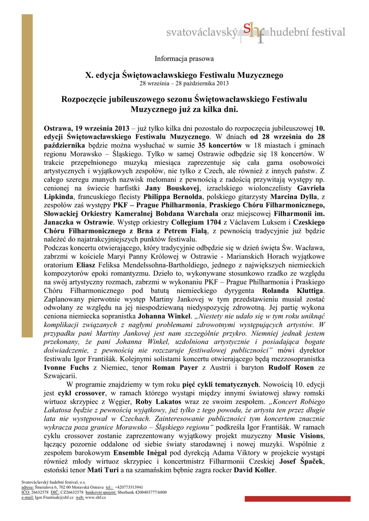 Informacja prasowa X. edycja Świętowacławskiego Festiwalu Muzycznego 28 września – 28 października 2013 Rozpoczęcie jubileuszowego sezonu Świętowacławskiego Festiwalu Muzycznego już za kilka dni. Ostrawa, 19 września 2013 – już tylko kilka dni pozostało do rozpoczęcia jubileuszowej 10. edycji Świętowacławskiego Festiwalu Muzycznego. W dniach od 28 września do 28 października będzie można wysłuchać w sumie 35 koncertów w 18 miastach i gminach regionu Morawsko – Śląskiego. Tylko w samej Ostrawie odbędzie się 18 koncertów. W trakcie przepełnionego muzyką miesiąca zaprezentuje się cała gama osobowości artystycznych i wyjątkowych zespołów, nie tylko z Czech, ale również z innych państw. Z całego szeregu znanych nazwisk melomani z pewnością z radością przywitają występy np. cenionej na świecie harfistki Jany Bouskovej, izraelskiego wiolonczelisty Gavriela Lipkinda, francuskiego flecisty Philippa Bernolda, polskiego gitarzysty Marcina Dylla, z zespołów zaś występy PKF – Prague Philharmonia, Praskiego Chóru Filharmonicznego, Słowackiej Orkiestry Kameralnej Bohdana Warchala oraz miejscowej Filharmonii im. Janaczka w Ostrawie. Występ orkiestry Collegium 1704 z Václavem Luksem i Czeskiego Chóru Filharmonicznego z Brna z Petrem Fialą, z pewnością tradycyjnie już będzie należeć do najatrakcyjniejszych punktów festiwalu. Podczas koncertu otwierającego, który tradycyjnie odbędzie się w dzień święta Św. Wacława, zabrzmi w kościele Maryi Panny Królowej w Ostrawie - Marianskich Horach wyjątkowe oratorium Eliasz Feliksa Mendelssohna-Bartholdiego, jednego z największych niemieckich kompozytorów epoki romantyzmu. Dzieło to, wykonywane stosunkowo rzadko ze względu na swój artystyczny rozmach, zabrzmi w wykonaniu PKF – Prague Philharmonia i Praskiego Chóru Filharmonicznego pod batutą niemieckiego dyrygenta Rolanda Kluttiga. Zaplanowany pierwotnie występ Martiny Jankovej w tym przedstawieniu musiał zostać odwołany ze względu na jej niespodziewaną niedyspozycję zdrowotną. Jej partię wykona ceniona niemiecka sopranistka Johanna Winkel. „Niestety nie udało się w tym roku uniknąć komplikacji związanych z nagłymi problemami zdrowotnymi występujących artystów. W przypadku pani Martiny Jankovej jest nam szczególnie przykro. Niemniej jednak jestem przekonany, że pani Johanna Winkel, uzdolniona artystycznie i posiadająca bogate doświadczenie, z pewnością nie rozczaruje festiwalowej publiczności” mówi dyrektor festiwalu Igor Františák. Kolejnymi solistami koncertu otwierającego będą mezzosopranistka Ivonne Fuchs z Niemiec, tenor Roman Payer z Austrii i baryton Rudolf Rosen ze Szwajcarii. W programie znajdziemy w tym roku pięć cykli tematycznych. Nowością 10. edycji jest cykl crossover, w ramach którego wystąpi między innymi światowej sławy romski wirtuoz skrzypiec z Węgier, Roby Lakatos wraz ze swoim zespołem. „Koncert Robiego Lakatosa będzie z pewnością wyjątkowy, już tylko z tego powodu, że artysta ten przez długie lata nie występował w Czechach. Zainteresowanie publiczności tym koncertem znacznie wykracza poza granice Morawsko – Śląskiego regionu“ podkreśla Igor Františák. W ramach cyklu crossover zostanie zaprezentowany wyjątkowy projekt muzyczny Music Visions, łączący pozornie oddalone od siebie światy starodawnej i nowej muzyki. Wspólnie z zespołem barokowym Ensemble Inégal pod dyrekcją Adama Viktory w projekcie wystąpi również młody wirtuoz skrzypiec i koncertmistrz Filharmonii Czeskiej Josef Špaček, estoński tenor Mati Turi a na szamańskim bębnie zagra rocker David Koller. Svatováclavský hudební festival, o.s. adresa: Šmeralova 6, 702 00 Moravská Ostrava tel.: +420773513941 IČO: 26632578 DIČ: CZ26632578 bankovní spojení: Sberbank 4200403777/6800 e-mail: [email protected] web: www.shf.cz Wyjątkowym przeżyciem w ramach cyklu kameralnego będzie koncert izraelskiego wiolonczelisty Gavriela Lipkinda, który występował między innymi z Zubinem Mehtą i Mstislavem Rostropoviczem. Solowy recital zaprezentuje także polski gitarzysta Marcin Dylla, którego Washington Post zaliczył „do najbardziej utalentowanych gitarzystów naszej planety”, będący wyjątkowym fenomenem we współczesnej historii gitary klasycznej. Pozycję tą zdobył między innymi dzięki niezliczonym nagrodom; dziewiętnastokrotnie zdobył pierwsze miejsce na najbardziej prestiżowych konkursach muzycznych. Na uwagę z pewnością zasługuje również koncert amerykańskiej skrzypaczki Esther Yoo, która wystąpi z orkiestrą Czech Virtuosi. Koncert zabrzmi pod batutą Ondřeja Vrabca, wyróżniającej się osobowości artystycznej młodej generacji, będącego asystentem dyrygenta głównego Filharmonii Czeskiej. Młoda Yoo zdobyła międzynarodowe uznanie dzięki licznym sukcesom w najbardziej prestiżowych konkursach skrzypcowych, dodatkowo będąc często jedną z najmłodszych uczestniczek tych konkursów w całej ich historii. W ramach cyklu organowego czołowy czeski organista i organolog Pavel Černý wykona muzykę organową J. S. Bacha. Interesującym przedsięwzięciem tego cyklu będzie również Labirynt świata i raj serca Petra Ebena. Podstawą tego utworu są znane improwizacje organowe na temat ponadczasowych tekstów Komeńskiego, które kompozytor z sukcesem wykonał w wielu miejscach na świecie i które pod koniec swojego życia zapisał w nutach. Na festiwalu utwór usłyszymy w wykonaniu jego syna, Marka Ebena (recytacja) oraz wspaniale grającego Petra Rajnohy (organy). Cykl barokowy zaproponuje słuchaczom oprócz wspomnianego Collegium 1704 np. Hipocondria Ensemble. Ciekawą symbiozę muzyki barokowej ze starymi pieśniami ludowymi zaprezentują projekty Musica Globus słowackiego zespołu barokowego Solamente Naturali z solistą Janem Rokytą mł. i Oversounding w wykonaniu barokowej flecistki Jany Semerádovej i słowackiego tr