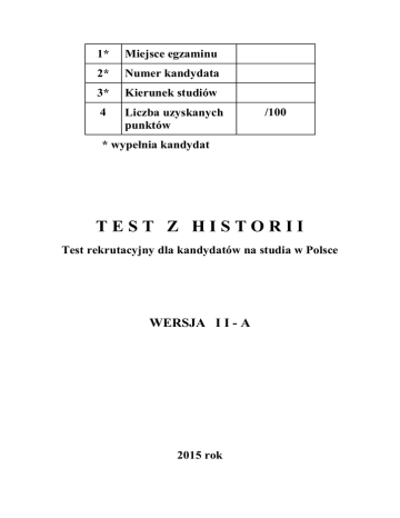 1* Miejsce egzaminu 2* Numer kandydata 3* Kierunek studiów 4 Liczba uzyskanych punktów /100 * wypełnia kandydat TEST Z HISTORII Test rekrutacyjny dla kandydatów na studia w Polsce WERSJA I I - A 2015 rok 2 I. Przeczytaj uważnie pytania i zaznacz poprawną odpowiedź w karcie odpowiedzi. 1. Ruś Kijowska przyjęła chrześcijaństwo w roku A) 960. B) 966. C) 988. D) 992. W tym czasie jej władcą był A) Ruryk. B) Igor. C) Włodzimierz Wielki. D) Jarosław Mądry. 2. „Dagome iudex” został wystawiony przez A.) Bolesława I Chrobrego. B) Bolesława II Śmiałego. C) Bolesława III Krzywoustego. D) Mieszka I. W dokumencie tym władca państwa polskiego A) Obiecał władcy czeskiemu płacić daninę ze Śląska. B) Przyłączał do Polski Grody Czerwieńskie. C) Oddawał państwo polskie pod opiekę św. Piotra (Stolicy Apostolskiej). D) Odbierał państwu niemieckiemu Łużyce i Milsko. 3. W latach 1002 – 1018 Bolesław Chrobry prowadził z Niemcami wojny, które zakończył pokój w A) Budziszynie. B) Krakowie. C) Gnieźnie. D) Berlinie. Na jego mocy A) Polska straciła Grody Czerwieńskie. B) Polska przyłączyła Grody Czerwieńskie. C) Polska straciła Łużyce i Milsko. D) Polska przyłączyła Łużyce i Milsko. 4. Ostateczny podział Kościoła chrześcijańskiego na prawosławny i katolicki nastąpił w A) 988 r. B) 1000 r. C) 1054 r. D) 1095 r. Wydarzenie to jest znane jako A) Wielka Ekskomunika. B) Sobór w Clermont. C) Wielka Schizma. D) Sobór w Konstancji. 5. Ustawa sukcesyjna Bolesława III Krzywoustego wprowadzała w Polsce A) trójpodział władzy wg Monteskiusza. B) podział państwa na dzielnice w ramach dynastii piastowskiej. C) absolutyzm oświecony. D) monarchie stanową. Na jej mocy pierwszym księciem zwierzchnim został syn Bolesława III Krzywoustego Test z historii - wersja II-A 2 0 15 3 A) Władysław. B) Bolesław. C) Mieszko. D) Kazimierz. 6. Wielka Karta Swobód została wprowadzona przez Jana bez Ziemi w państwie A) angielskim B) francuskim C) niemieckim D) polskim B) 1095. C) 1138. D) 1215. w roku A) 1000. 7. Konrad Mazowiecki sprowadził Krzyżaków do Polski w roku 1226 i nadał im jako lenno A) ziemię dobrzyńską. B) Małopolskę. C) Wielkopolskę. D) Pomorze Gdańskie. Pełna nazwa Zakonu Krzyżackiego to A) Zakon Szpitala Domu Bożego w Jerozolimie. B) Zakon Szpitala Najświętszej Marii Panny Domu Niemieckiego. C) Zakon Szpitala Świątyni Jerozolimskiej. D) Zakon Szpitala Najświętszego Krzyża Jezusa Chrystusa. 8. Unia w Krewie została zawarta między Polską i Litwą w roku A) 1333. B) 1370. C) 1385. D) 1399. Skutkiem tego wydarzenia A) Ludwik Andegaweński został królem Polski. B) Kazimierz Wielki przyłączył Ruś Czerwoną do Polski. C) Litwa stała się państwem chrześcijańskim. D) Czesi obiecali płacić Polsce trybut ze Śląska. 9. Wojna Dwóch Róż była wojną domową A) w Anglii. B) we Francji. C) w Niemczech. D) w Portugalii. Wojna ta toczyła się pomiędzy rodem Yorków, których symbolizowała róża biała i Lancasterów, których symbolizowała róża A) żółta. B) czerwona. C) niebieska. D) czarna. B) Jana Kalwina C) Ignacego Loyolę D) św. Celestyna B) XV. C) XVI. D) XVII. 10. Zakon Jezuitów został założony przez A) Marcina Lutra w wieku A) XIV. 11. Bitwa pod Beresteczkiem miała miejsce w roku A) 1605. B) 1610. C) 1620. D) 1651. W bitwie tej wojskami polskimi dowodził A) hetman Jan Karol Chodkiewicz. B) hetman Stanisław Żółkiewski. C) hetman Jan Sobieski. D) król Jan II Kazimierz Waza. Test z historii - wersja II-A 2 0 15 4 12. Na mocy traktatu welawsko-bydgoskiego Polska utraciła lenno A) śląskie B) pruskie C) mazowieckie D) ruskie B) 1446. C) 1596. D) 1657. w roku A) 1350. 13. Komisję Edukacji Narodowej utworzono w Polsce w roku A) 1764. B) 1773. C) 1793. D) 1795. Jednym z jej twórców był A) Hugo Kołłątaj. B) Stanisław Staszic. C) Stanisław Małachowski. D) Ksawery Drucki-Lubecki. 14. Legiony Polskie we Włoszech zostały utworzone za zgodą cesarza A) Pawła I. B) Józefa II. C) Aleksandra I. D) Napoleona I. Pieśń Legionów Polskich „Jeszcze Polska nie umarła” znana jako „Mazurek Dąbrowskiego” została napisana przez A) Ignacego Krasińskiego. B) Józefa Wybickiego. C) Adama Mickiewicza. D) Adama Naruszewicza. 15. Napoleon Bonaparte zdobył Moskwę w roku A) 1810. B) 1811. C) 1812. D) 1813. Było to możliwe po wygranej wojsk francuskich w bitwie A) nad Berezyną. B) pod Borodino. C) pod Lipskiem. D) pod Waterloo. 16. Car Aleksander I nadał Królestwu Polskiemu konstytucję w roku A) 1814. B) 1815. C) 1816. D) 1817. Na jej podstawie Królestwo Polskie A) było nierozerwalnie połączone z Rosją. B) mogło prowadzić samodzielną politykę zagraniczną. C) posiadało własny rząd pod nazwą Straż Praw. D) stało się państwem niepodległym. 17. Dualistyczna monarchia austro-węgierska została proklamowana w roku A) 1866. B) 1867. C) 1870. D) 1871. Od tego czasu Austria i Węgry A) zostały połączone unią realną pod panowaniem dynastii Habsburgów. B) posiadały wspólny rząd i parlament. C) zostały połączone unią personalną pod panowaniem dynastii Habsburgów. D) zostały połączone unią personalną pod panowaniem dynastii Hohenzollernów. Test z historii - wersja II-A 2 0 15 5 18. Naczelny Wódz i premier Polski na uchodźstwie generał Władysław Sikorski zginął w katastrofie lotniczej A) w Smoleńsku B) w Gibraltarze C) nad Oceanem Indyjskim D) pod Moskwą. w roku A) 1939. B) 1941. C) 1943. D) 1945. 19. Obrady „okrągłego stołu” były spotkaniem władz PRL z A) opozycją solidarnościową B) przedstawicielami władz ZSRR C) generałami państw Układu Warszawskiego D) episkopatem polskim w roku A) 1981. B) 1983. C) 1988. D) 1989. 20. Po II wojnie światowej USA zaoferowały pomoc dla zrujnowanych działaniami wojennymi gospodarek państw europejskich. Pomoc ta została nazwana od imienia amerykańskiego generała planem A) Lincolna. B) Marsh