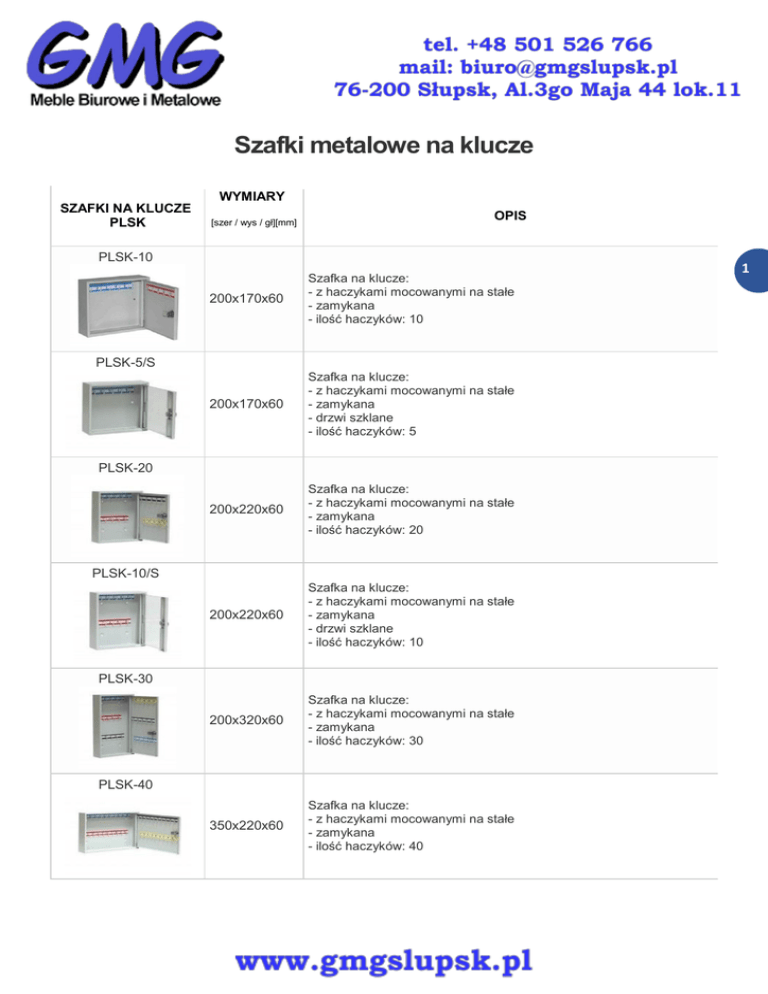 Szafki metalowe na klucze WYMIARY SZAFKI NA KLUCZE PLSK [szer / wys / gł][mm] OPIS PLSK-10 200x170x60 Szafka na klucze: - z haczykami mocowanymi na stałe - zamykana - ilość haczyków: 10 200x170x60 Szafka na klucze: - z haczykami mocowanymi na stałe - zamykana - drzwi szklane - ilość haczyków: 5 200x220x60 Szafka na klucze: - z haczykami mocowanymi na stałe - zamykana - ilość haczyków: 20 200x220x60 Szafka na klucze: - z haczykami mocowanymi na stałe - zamykana - drzwi szklane - ilość haczyków: 10 200x320x60 Szafka na klucze: - z haczykami mocowanymi na stałe - zamykana - ilość haczyków: 30 350x220x60 Szafka na klucze: - z haczykami mocowanymi na stałe - zamykana - ilość haczyków: 40 PLSK-5/S PLSK-20 PLSK-10/S PLSK-30 PLSK-40 1 WYMIARY SZAFKI NA KLUCZE PLSK [szer / wys / gł][mm] OPIS PLSK-15/S 200x320x60 Szafka na klucze: - z haczykami mocowanymi na stałe - zamykana - drzwi szklane - ilość haczyków: 15 PLSK-60 350x320x60 Szafka na klucze: - z haczykami mocowanymi na stałe - zamykana - ilość haczyków: 60 350x220x60 Szafka na klucze: - z haczykami mocowanymi na stałe - zamykana - drzwi szklane - ilość haczyków: 20 350x320x60 Szafka na klucze: - z haczykami mocowanymi na stałe - zamykana - drzwi szklane - ilość haczyków: 30 350x420x60 Szafka na klucze: - z haczykami mocowanymi na stałe - zamykana - ilość haczyków: 80 350x420x60 Szafka na klucze: - z haczykami mocowanymi na stałe - zamykana - drzwi szklane - ilość haczyków: 40 350x520x60 Szafka na klucze: - z haczykami mocowanymi na stałe - zamykana - ilość haczyków: 100 PLSK-20/S PLSK-30/S PLSK-80 PLSK-40/S PLSK-100 2 WYMIARY SZAFKI NA KLUCZE PLSK [szer / wys / gł][mm] OPIS PLSK-50/S 350x520x60 Szafka na klucze: - z haczykami mocowanymi na stałe - zamykana - drzwi szklane - ilość haczyków: 50 PLSK-120 390x320x120 Szafka na klucze: - z haczykami mocowanymi na stałe - zamykana - ilość haczyków: 120 390x320x120 Szafka na klucze: - z haczykami mocowanymi na stałe - zamykana - drzwi wewnątrz z drugim zamkiem - ilość haczyków: 120 390x420x120 Szafka na klucze: - z haczykami mocowanymi na stałe - zamykana - ilość haczyków: 160 390x420x120 Szafka na klucze: - z haczykami mocowanymi na stałe - zamykana - drzwi wewnątrz z drugim zamkiem - ilość haczyków: 160 390x520x120 Szafka na klucze: - z haczykami mocowanymi na stałe - zamykana - ilość haczyków: 200 390x520x120 Szafka na klucze: - z haczykami mocowanymi na stałe - zamykana - drzwi wewnątrz z drugim zamkiem - ilość haczyków: 200 PLSK-120/2Z PLSK-160 PLSK-160/2Z PLSK-200 PLSK-200/2Z 3 WYMIARY SZAFKI NA KLUCZE PLSK [szer / wys / gł][mm] OPIS PLSKR-30 200x320x60 Szafka na klucze: - z haczykami na ruchomych listwach - zamykana - ilość haczyków: 30 PLSKR-15/S 200x320x60 Szafka na klucze: - z haczykami na ruchomych listwach - zamykana - drzwi szklane - ilość haczyków: 15 350x220x60 Szafka na klucze: - z haczykami na ruchomych listwach - zamykana - ilość haczyków: 40 350x220x60 Szafka na klucze: - z haczykami na ruchomych listwach - zamykana - drzwi szklane - ilość haczyków: 20 350x320x60 Szafka na klucze: - z haczykami na ruchomych listwach - zamykana - ilość haczyków: 60 350x420x60 Szafka na klucze: - z haczykami na ruchomych listwach - zamykana - ilość haczyków: 80 350x320x60 Szafka na klucze: - z haczykami na ruchomych listwach - zamykana - drzwi szklane - ilość haczyków: 30 PLSKR-40 PLSKR-20/S PLSKR-60 PLSKR-80 PLSKR-30/S 4 WYMIARY SZAFKI NA KLUCZE PLSK OPIS [szer / wys / gł][mm] PLSKR-40/S 350x420x60 Szafka na klucze: - z haczykami na ruchomych listwach - zamykana - drzwi szklane - ilość haczyków: 40 PLSKR-100 350x520x60 Szafka na klucze: - z haczykami na ruchomych listwach - zamykana - ilość haczyków: 100 350x520x60 Szafka na klucze: - z haczykami na ruchomych listwach - zamykana - drzwi szklane - ilość haczyków: 50 390x320x120 Szafka na klucze: - z haczykami na ruchomych listwach - zamykana - ilość haczyków: 120 390x420x120 Szafka na klucze: - z haczykami na ruchomych listwach - zamykana - ilość haczyków: 160 390x520x120 Szafka na klucze: - z haczykami na ruchomych listwach - zamykana - ilość haczyków: 200 125x150x30 Szafka na klucz ewakuacyjny - ze zbijakiem - zamykana PLSKR-50/S PLSKR-120 PLSKR-160 PLSKR-200 PLSKE 5 PLSKE - BZ 125x150x30 Szafka na klucz ewakuacyjny - bez zbijaka - zamykana 70x152x27 Szafka na klucz ewakuacyjny - bez zbijaka - zamykana 351x420x140 Szafki przeznaczone są do przechowywania dokumentów, które muszą być zdeponowane na terenie firmy. Szczególnie przydatne są do przechowywania dokumentów i kluczyków pojazdów używanych w firmie. Szafka z 15 przegródkami małymi o wymiarach100(s) x 50(w) x 120(g) i jednej przegródce dużej o wymiarach 300(s) x 80(w) x 130(g). Drzwi wykonane są z blachy stalowej o grubości 0.8mm. Na drzwiach przymocowane są haczyki na klucze. 350x420x140 Szafki przeznaczone są do przechowywania dokumentów, które muszą być zdeponowane na terenie firmy. Szczególnie przydatne są do przechowywania dokumentów i kluczyków pojazdów używanych w firmie. Szafka z 15 przegródkami małymi o wymiarach100(s) x 50(w) x 120(g) i jednej przegródce dużej o wymiarach 300(s) x 80(w) x 130(g). Drzwi szklane wykonane z bezpiecznego szkła hartowanego o grubości 4mm. 353x520x140 Szafki przeznaczone są do przechowywania dokumentów, które muszą być zdeponowane na terenie firmy. Szczególnie przydatne są do przechowywania dokumentów i kluczyków pojazdów używanych w firmie. Szafka z 21 przegródkami małymi o wymiarach100(s) x 50(w) x 120(g) i jednej przegródce dużej o wymiarach 300(s) x 80(w) x 130(g). Drzwi wykonane są z blachy stalowej o grubości 0.8mm. Na drzwiach przymocowane są haczyki na klucze. 352x520x140 Szafki przeznaczone są do przechowywania dokumentów, które muszą być zdeponowane na terenie firmy. Szczególnie przydatne są do przechowywania dokumentów i kluczyków pojazdów używanych w firmi