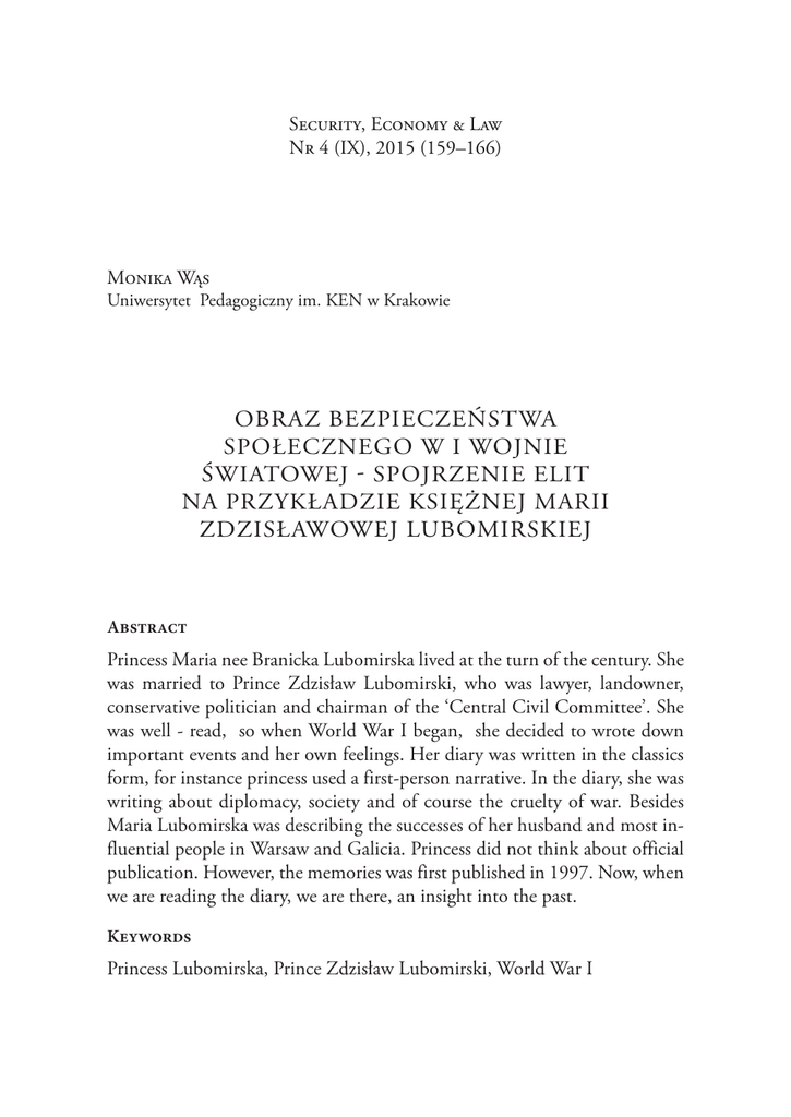 Security, Economy & Law Nr 4 (IX), 2015 (159–166) Monika Wąs Uniwersytet Pedagogiczny im. KEN w Krakowie OBRAZ BEZPIECZEŃSTWA SPOŁECZNEGO W I WOJNIE ŚWIATOWEJ - SPOJRZENIE ELIT NA PRZYKŁADZIE KSIĘŻNEJ MARII ZDZISŁAWOWEJ LUBOMIRSKIEJ Abstract Princess Maria nee Branicka Lubomirska lived at the turn of the century. She was married to Prince Zdzisław Lubomirski, who was lawyer, landowner, conservative politician and chairman of the ‘Central Civil Committee’. She was well - read, so when World War I began, she decided to wrote down important events and her own feelings. Her diary was written in the classics form, for instance princess used a first-person narrative. In the diary, she was writing about diplomacy, society and of course the cruelty of war. Besides Maria Lubomirska was describing the successes of her husband and most influential people in Warsaw and Galicia. Princess did not think about official publication. However, the memories was first published in 1997. Now, when we are reading the diary, we are there, an insight into the past. Keywords Princess Lubomirska, Prince Zdzisław Lubomirski, World War I Monika Wąs Abstrakt Księżna Maria z Branickich Lubomirska żyła na przełomie XIX i XX wieku. Była żoną księcia Zdzisława Lubomirskiego, prawnika, ziemianina, konserwatywnego polityka, przewodniczący Centralnego Komitetu Obywatelskiego. Jako osoba oczytana, zdecydowała się spisać ważne wydarzenia z okresu I wojny światowej oraz towarzyszące im emocje. Sztambuch został napisany w klasycznej formie, np. księżna używała narracji pierwszoosobowej. Na kartach pamiętnika zawarła informacje dotyczące dyplomacji, społeczeństwa, ale nade wszystko okrucieństwa towarzyszącego wojnie. Pisała o sukcesach męża oraz wykonywała portrety najbardziej wpływowych ludzi żyjących wówczas w Warszawie i Galicji. Księżna nie myślała o publikacji wspomnień. Jednak pierwsza publikacja miała miejsce w roku 1997. Lektura pamiętników księżnej Lubomirskiej umożliwia poznanie okresu I wojny światowej z innej, zapewne bliższej czytelnikowi, perspektywy. Słowa kluczowe księżna Lubomirska, Zdzisław Lubomirski, I wojna światowa W jaki sposób obraz wojny potrafiła naszkicować arystokratka żyjąca na przełomie XIX i XX wieku? Czy i jak ówczesna kobieta rozumiała znaczenie konfliktu zbrojnego? Co frapowało żonę jednego z najważniejszych polityków polskich okresu I wojny światowej? Które obszary życia były jej bliskie, a które obce? Czy działalność polityczna umykała ówczesnym kobietom? Jaką rolę spełniały w społeczeństwie, a jaką pragnęły spełniać? Sztuka pisania pamiętników środkuje poniekąd pomiędzy sztuką historyczną a poetycką mając pewną sobie właściwą od obydwu odrębność1. Maria z Branickich Lubomirska pozostawiła sześćdziesiąt jeden zeszytów zapisków z lat 1914 – 19182. Opisu dokonywała z perspektywy arystokratki o poglądach prorosyjskich. Wywodziła się z rodu kojarzonego do dnia dzisiejszego carycą Katarzyną II. Przodek Księżnej, Franciszek Ksawery, naznaczył rodzinę hańbą targowicy3. Maria była najstarszą córką Władysława Branickiego i Julii z Potockich. Ojciec, właściciel wielkich dóbr na Ukrainie i w Galicji Zachodniej, wyjątkowo dbał o kwestie społeczne. Uiścił znaczne sumy na budowę szpitali S. Askenazy, Wczasy historyczne, Wyd. II, Warszawa 1902, s. 54. J. Pajewski, Słowo wstępne [w:] Pamiętniki Księżnej Zdzisławowej Lubomirskiej 1914 – 1918, Poznań 1997, s. 10. 3 T. Zielińska, Poczet polskich rodów arystokratycznych, Warszawa 1997, s. 44. 1 2 160 Obraz bezpieczeństwa społecznego w i wojnie światowej… oraz ochronek dostępnych dla ogółu ludności. Wspierał polskie instytucje naukowe, a także fundował stypendia dla niezamożnej młodzieży. Dla warszawskich robotników zbudował dom z tanimi mieszkaniami 4. Ofiarność i służbę ubogim zaszczepił u córek. Maria wniosła część tradycji Branickich do domu Lubomirskich. Związek małżeński ze Zdzisławem Lubomirskim zawarła, bowiem 6 września 1893 roku (s. 47) .Wszechstronnie wykształcona, czytała i poddawała krytyce arcydzieła literackie. Znała historię Polski, w tym dzieje poszczególnych rodów magnackich. Tworzyła zapiski jednocześnie w dwóch językach obcych – francuskim i angielskim. Współdziałała w organizowaniu tajnego szkolnictwa polskiego dla włościan. Prowadziła bujne życie towarzyskie, dużo korespondowała. Zapoznawała się z aktualnymi wydarzeniami politycznymi przedstawionymi w prasie polsko- i obcojęzycznej. Zdzisławowa Lubomirska opisała okres I wojny światowej z własnej perspektywy. Pamiętniki przygotowała dla dzieci, dedykowała je Małej Wsi. Nie wyjaśniała swych dążeń, nie usprawiedliwiała swojego postępowania, nie myślała o publikacji, raczej spisywała wrażenia o wydarzeniach, których była świadkiem. Nadało to wspomnieniom wyjątkową wartość badawczą. Zapiski Księżnej zostały ujęte w spójną całość dopiero przez Janusza Pajewskiego i opatrzone objaśnieniami Aleksandry Kosickiej – Pajewskiej. Redaktorzy nie zostali dobrani przypadkowo. Janusz Pajewski był absolwentem Uniwersytetu Warszawskiego, wybitnym historykiem, badaczem dziejów politycznych Polski i Europy w okresach nowożytnym oraz najnowszym, nauczycielem akademickim, a także promotorem prac doktorskich5. Zajmował się również życiem i działalnością Zdzisława Lubomirskiego – opracował biogram regenta zamieszczony w Polskim Słowniku Biograficznym6. Aleksandra Kosicka – Pajewska, obecnie doktor habilitowany, profesor Uniwersytetu Adama Mickiewicza w Poznaniu, zadbała o zachowanie charakteru wypowiedzi Księżnej. W 1997 roku nakładem Wydawnictwa Poznańskiego ukazało się pierwsze wydanie Pamiętników Księżnej Marii Zdzisławowej Lubomirskiej 1914 – 1918, zaś dodatkowy nakład wypuszczono w 2002 roku. Książka złożona
