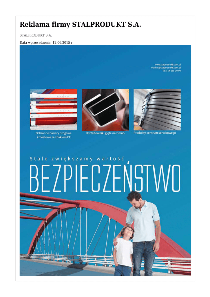 Reklama firmy STALPRODUKT S.A. STALPRODUKT S.A. Data wprowadzenia: 12.06.2015 r. Adres O firmie Produkty Usługi Artykuły Multimedia Zadaj pytanie Oddziały STALPRODUKT S.A. ul. Wygoda 69, 32-700 BOCHNIA (woj. małopolskie) tel. 14 615 10 00 faks 14 615 11 18 [email protected] www.stalprodukt.com.pl Wiodący producent i eksporter wysokoprzetworzonych wyrobów ze stali: blach elektrotechnicznych transformatorowych, kształtowników giętych na zimno, barier drogowych i rdzeni toroidalnych.