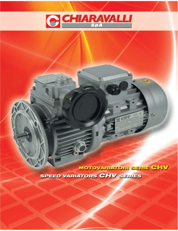 MOTOVARIATORI SERIE CHV - SPEED VARIATORS CHV SERIES CHIARAVALLI presenta la sua linea di variatori meccanici a bagno d’olio serie CHV nelle grandezze 02-05-1020-30-50, le principali caratteristiche sono le seguenti: CHIARAVALLI introduces his mechanical speed variators line with oil bath lubrication CHV series sizes 02-05-1020-30-50, the main characteristics are the following: Campo di variazione 1:5 Funzionamento uniforme e silenzioso Coppia crescente ai bassi giri Elevato rendimento Flange entrata e uscita B5 Forma compatta Casse in alluminio grandezza 02-05-10 Verniciati RAL 9022 grigio Speed range 1:5 Smooth and silent running Increasing torque at low speed High efficiency Input and output flange B5 Compact design Aluminium cases sizes 02-05-10 RAL 9022 grey painted DESIGNAZIONE - DESIGNATION TIPO TYPE GRANDEZZA SIZE POTENZA Kw POLI POWER Kw POLES CHV 02 0.18 - 0.22 1 B5 05 0.37 2 V1 10 0.75 3 V3 20 30 50 1.1 - 1.5 2.2 3.0 - 4.0 4 4 Posizione montaggio Mounting position TENSIONE VOLTAGE FREQUENZA FREQUENCY 230/400 50HZ POS.MORS T.BOX POS. Posizione morsetteria Terminal box position B5 1 2 4 3 V1 POS.MONT. MOUNT. POS. V3 PRESTAZIONI CON MOTORI 4 POLI PERFORMANCES WITH 4 POLES MOTORS VARIATORE SPEED VARIATOR POTENZA Kw POWER Kw VELOCITÀ USCITA OUTPUT SPEED COPPIA USCITA Nm OUTPUT TORQUE Nm CHV 02 0.18 170 - 880 3.0 - 1.5 CHV 02 0.22 170 - 880 3.8 - 1.9 CHV 05 0.37 200 - 1000 6.0 - 3.0 CHV 10 0.75 200 - 1000 12 - 6.0 CHV 20 1.10 200 - 1000 18 - 9.0 CHV 20 1.50 200 - 1000 24 - 12 CHV 30 2.20 200 - 1000 36 - 18 CHV 50 3.00 200 - 1000 48 - 24 CHV 50 4.00 200 - 1000 64 - 32 LUBRIFICAZIONE - LUBRICATION I variatori vengono forniti completi di lubrificazione per la posizione B5, per le altre posizioni andrà aggiunto olio come da tabella seguente. Speed variators are supplied with lubrication oil for assembly position B5, for other positions it will be necessary to add oil, see following table. QUANTITÀ OLIO Kg - OIL QUANTITY Kg CHV B5 V1 V3 02 0.13 0.3 0.2 05 0.15 0.4 0.25 10 0.33 0.85 0.45 20 0.8 1.40 0.90 OLI CONSIGLIATI - RECOMMENDED OILS AGIP A.T.F. DEXRON ESSO A.T.F. DEXRON SHELL A.T.F. DEXRON BP A.T.F. DEXRON 30 1.20 2.15 1.30 50 1.20 2.15 1.30 CHV 02/05/10/20/30/50 DIMENSIONI - DIMENSIONS G X G3 VR1 VR VC VS B VL VF b D H t Y P M N f D M1 D1 I T K E B D(j6) E G G3 H I M M1 N D D1 P T K VC VF VL VR VR1 VS b f t kg CHV 02 23 11 50 112.5 64.5 70 72 115 60 95 9 M6 140 3.5 46 71 111 78 110 110 85 4 M5 12.5 3.4 CHV 05 30 14 40 110 90 130 76 110 9 M8 160 3.5 52.5 71 123 90 110 110 85 5 M6 CHV 10 40 19 58 139 85.5 100 98 165 84 130 11 M8 200 3.5 60 79 140 107 120 120 110 6 M6 21.5 7.8 CHV 20 50 24 - 188 115 126 241 165 - 130 11 - 200 3.5 - - 144 122 150 - 110 8 M8 27 31 CHV 30 60 28 - 208 131 150 270 215 - 180 15 - 250 4 - - 188 150 160 - 110 8 M10 33 55 CHV 50 60 28 - 208 131 150 270 215 - 180 15 - 250 4 - - 188 150 160 - 110 8 M10 33 57 74 80 16 4.7 ACCESSORI - ACCESSORIES Indicatore gravitazionale L’indicatore gravitazionale viene inserito nel volantino ed avendo una scala numerica indica un riferimento legato alla velocità. Tarare l’indicatore facendo coincidere le due lancette con zero e montarlo nel volantino dopo aver portato la velocità del variatore al minimo. L’indicatore non funziona con asse del volantino in verticale. Gravitational indicator The gravitational indicator must be inserted into the handwheel and with a numerical scale it shows a reference link to the speed. Set the indicator moving the two hands to zero and put it into the handwheel after setting the variators to minimum speed. The gravitational indicator doesn’t work with vertical handwheel axis. Feet kit 02 05 10 A 110 120 160 B 105 104 125 C 145 149 190 D 120 125 150 E 15.5 20.5 26.5 F 9 9 11 G 10 12 14 H 82 93 113 G CHV H Kit piedi E F B A C D USO E MANUTENZIONE - USE AND MAINTENANCE The screws under the handwheel are well adjusted, don’t touch them. Don’t adjust the handwheel when the motor is off, this can cause internal breaking. Speed variators are filled with oil, check the level before running. After the running-in the oil must be changed, check the level periodically. The temperature after the running-in can reach 50/55°C over room temperature. When the variator is supplied without motor make sure that the assembled one is at least “normal” class quality and the connection is not forced. Speed variators are supplied with closed oil plugs. When the variator is used for continuous work replace the closed plug with the supplied breather plug. Le viti di regolazione montate sotto il volantino sono tarate, non vanno toccate. Non manovrare il volantino con il motore fermo, può causare rotture interne. I variatori sono forniti completi di olio, verificare il livello prima della messa in funzione. Dopo il rodaggio sostituire olio, si consiglia di controllare spesso il livello. La temperatura dopo il rodaggio può arrivare a 50/55°C oltre la temperatura ambiente. Quando il variatore è fornito senza motore accertarsi che quello da montare sia di classe “normale” e che l’accoppiamento non sia forzato. I variatori sono provvisti di tappi di carico chiusi. Quando il variatore viene utilizzato per lavoro continuo sostituire il tappo chiuso con quello di sfiato in dotazione. LISTA PARTI DI RICAMBIO - SPARE PART LIST 1) 2) 3) 4) 5) 6) 7) 8) 9) 10) 11) 12) 13) Albero di uscita Portasatelliti Boccola scorrevole Pista di regolazione Anello portasfere Pista mobile esterna Satellite Scatola di comando Pista fissa esterna Pista fissa interna Pista mobile interna Molle a tazza Albero motore 1 2 3 4 5 6 7 8 9 10 11 12 13 1) 2) 3) 4) 5) 6) 7) 8) 9) 10) 11) 12) 13) Output shaft Planet support Slide block Regulating orbit Ball ring Moving outer planetary orbit Planet wheel Operating box Fixed outer planetary orbit Fixed inferior planetary orbit Moving inferior planetary orbit Butterfly spring Motor shaft