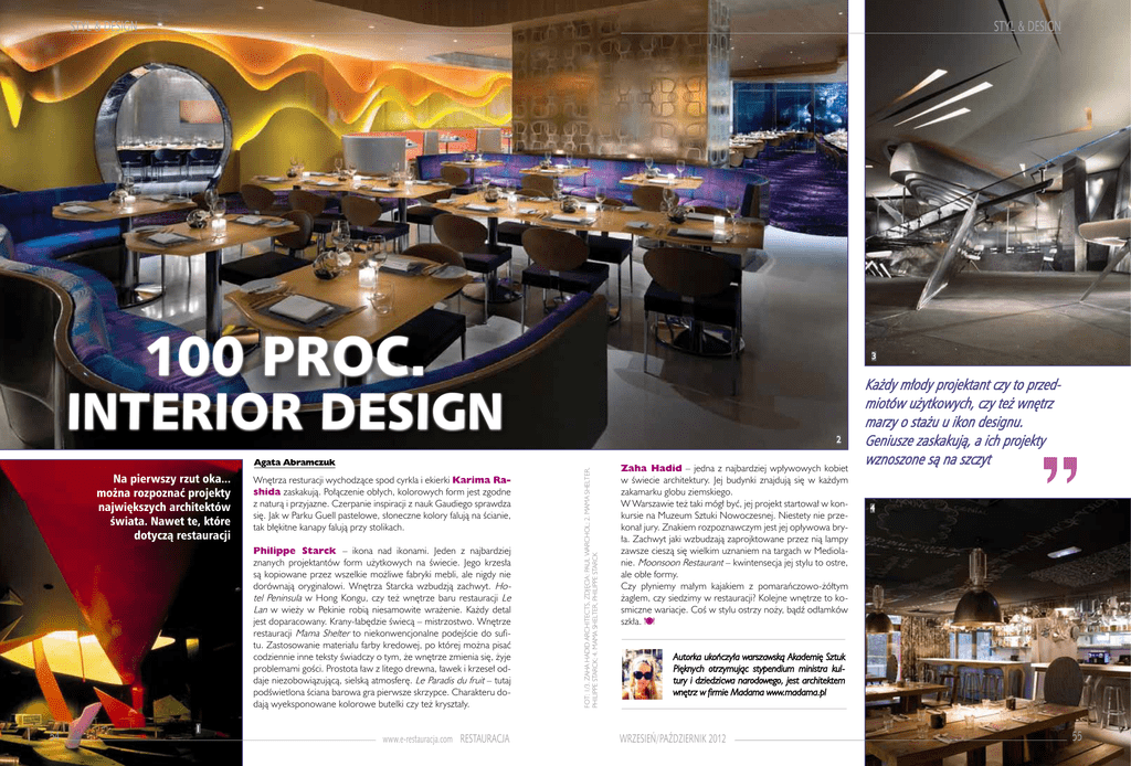 styl & design styl & design 100 proc. 3 Interior Design Na pierwszy rzut oka... można rozpoznać projekty największych architektów świata. Nawet te, które dotyczą restauracji Wnętrza resturacji wychodzące spod cyrkla i ekierki Karima Rashida zaskakują. Połączenie obłych, kolorowych form jest zgodne z naturą i przyjazne. Czerpanie inspiracji z nauk Gaudiego sprawdza się. Jak w Parku Guell pastelowe, słoneczne kolory falują na ścianie, tak błękitne kanapy falują przy stolikach. Philippe Starck – ikona nad ikonami. Jeden z najbardziej znanych projektantów form użytkowych na świecie. Jego krzesła są kopiowane przez wszelkie możliwe fabryki mebli, ale nigdy nie dorównają oryginałowi. Wnętrza Starcka wzbudzją zachwyt. Hotel Peninsula w Hong Kongu, czy też wnętrze baru restauracji Le Lan w wieży w Pekinie robią niesamowite wrażenie. Każdy detal jest doparacowany. Krany-łabędzie świecą – mistrzostwo. Wnętrze restauracji Mama Shelter to niekonwencjonalne podejście do sufitu. Zastosowanie materiału farby kredowej, po której można pisać codziennie inne teksty świadczy o tym, że wnętrze zmienia się, żyje problemami gości. Prostota ław z litego drewna, ławek i krzeseł oddaje niezobowiązującą, sielską atmosferę. Le Paradis du fruit – tutaj podświetlona ściana barowa gra pierwsze skrzypce. Charakteru dodają wyeksponowane kolorowe butelki czy też kryształy. 54 1 www.e-restauracja.com rESTAURACJA FOT: 1/3. Zaha Hadid Architects, zdjęcia: Paul Warchol; 2. Mama Shelter, Philippe Starck; 4. Mama Shelter, Philippe Starck Agata Abramczuk 2 Zaha Hadid – jedna z najbardziej wpływowych kobiet w świecie architektury. Jej budynki znajdują się w każdym zakamarku globu ziemskiego. W Warszawie też taki mógł być, jej projekt startował w konkursie na Muzeum Sztuki Nowoczesnej. Niestety nie przekonał jury. Znakiem rozpoznawczym jest jej opływowa bryła. Zachwyt jaki wzbudzają zaprojktowane przez nią lampy zawsze cieszą się wielkim uznaniem na targach w Mediolanie. Moonsoon Restaurant – kwintensecja jej stylu to ostre, ale obłe formy. Czy płyniemy małym kajakiem z pomarańczowo-żółtym żaglem, czy siedzimy w restauracji? Kolejne wnętrze to kosmiczne wariacje. Coś w stylu ostrzy noży, bądź odłamków szkła. Każdy młody projektant czy to przedmiotów użytkowych, czy też wnętrz marzy o stażu u ikon designu. Geniusze zaskakują, a ich projekty wznoszone są na szczyt 4 Autorka ukończyła warszawską Akademię Sztuk Pięknych otrzymując stypendium ministra kultury i dziedzicwa narodowego, jest architektem wnętrz w firmie Madama www.madama.pl wrzesień/październik 2012 55