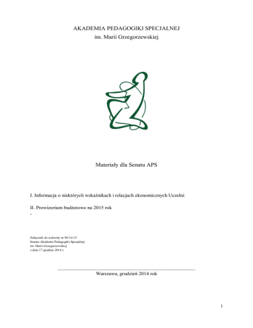AKADEMIA PEDAGOGIKI SPECJALNEJ im. Marii Grzegorzewskiej Materiały dla Senatu APS I. Informacja o niektórych wskaźnikach i relacjach ekonomicznych Uczelni II. Prowizorium budżetowe na 2015 rok - Załącznik do uchwały nr 96/14-15 Senatu Akademii Pedagogiki Specjalnej im. Marii Grzegorzewskiej z dnia 17 grudnia 2014 r. ______________________________________________________ Warszawa, grudzień 2014 rok 1 Informacja o niektórych wskaźnikach i relacjach ekonomicznych działalności Uczelni CZĘŚĆ I: ZAŁOŻENIA DO PLANU PRZYCHODÓW I WYDATKÓW rodzaj i czas trwania stud. 1. Dane w zakresie liczby studentów L.p. 1 2 2012 2013 stan na 30.11. stan na 30.11. 3 4 2014 % 4/3 5 stan na 30.11. 6 Studenci i słuchacze łącznie (I + II + III) 8 187 100,8 8 168 Studenci ogółem (I + II)*, w tym: 6 746 6 782 100,5 - studenci stacjonarni (I.1 + II.1) 3 561 3 728 104,7 - studenci niestacjonarni (I.2 + II.2), w tym: 3 185 3 054 2 901 2 997 284 57 5 123 L-3 L-3 M-2 L-3 M-2 studia stacjonarne, z tego: 1) pedagogika 1.1) pedagogika profil praktyczny 2) pedagogika specjalna 3) edukacja artystyczna w zakresie sztuk plastyczn. I.2 studia niestacjonarne, z tego: 1) pedagogika, 1.1) pedagogika profil praktyczny 2) pedagogika specjalna, studia finansowane z EFS, WYDZIAŁ STOSOWANYCH NAUK SPOŁECZNYCH w tym: II.1 studia stacjonarne, z tego: 1) praca socjalna 2) socjologia 3) psychologia 8/6 8/4 9 10 99,8 99,6 6 754 99,6 7 154 105,9 105,5 3 956 106,1 4 370 110,5 117,2 95,9 2 798 91,6 2 784 99,5 91,2 103,3 2 798 93,4 2 784 99,5 92,9 20,1 0 0,0 0 0,0 0,0 5 200 101,5 5 235 100,7 5 472 104,5 105,2 2 493 714 0 251 1 007 388 2 695 808 0 336 1 012 402 108,1 113,2 106,7 95,5 118,5 95,4 112,2 3 205 805 219 426 1 091 480 111,4 104,3 805,0 219,0 113,1 106,4 118,9 99,6 133,9 100,5 103,6 2 876 772 134 398 965 451 L-3 80 86 107,5 88 102,3 98 111,4 114,0 M-2 L-3 L-3 M-2 53 2 630 488 0 628 51 2 505 531 0 728 x 95,2 108,8 133,3 94,2 83,4 95,2 86 2 267 394 123 620 126,5 96,1 88,9 170,8 89,5 x 90,5 74,2 115,9 68 2 359 443 72 693 L-3 M-2 M-2 466 822 226 430 816 0 92,3 99,3 0,0 400 751 0 93,0 92,0 x 424 706 0 106,0 94,0 x 98,6 86,5 x 1623 1 582 97,5 1 519 96,0 1 682 110,7 106,3 1068 218 198 107 545 555 65 58 52 83 297 1033 208 192 100 533 549 86 57 27 34 345 96,7 95,4 97,0 93,5 97,8 98,9 132,3 98,3 51,9 41,0 116,2 1080 200 177 99 604 439 95 0 12 0 332 104,5 96,2 92,2 99,0 113,3 80,0 106,6 0,0 44,4 0,0 96,2 1 165 230 209 108 618 517 105 0 30 30 352 107,9 115,0 118,1 109,1 102,3 117,8 110,5 112,8 110,6 108,9 108,0 115,9 94,2 122,1 0,0 111,1 x 102,0 II 3) psychologia II.2 studia niestacjonarne, z tego: 1) praca socjalna 1.a.) studia finansowane z EFS, 2) socjologia 8 % 8 154 b) finansowani z EFS I.1 stan na 30.11. 99,8 a) bez finansowania z EFS WYDZIAŁ NAUK PEDAGOGICZNYCH w tym: 6/4 7 8 118 I Plan 2015 % L-3 L-3 M-2 M-5 L-3 L-3 L-3 M-2 M-5 126,8 107,8 119,4 85,2 106,0 2 Studia podyplomowe/** w tym: III.1 -studia odpłatne III 1 372 1 405 102,4 1374 97,8 1 000 72,8 71 1 372 1 405 102,4 1374 97,8 1 000 72,8 71,2 x x x x x x III.2 studia finansowane z EFS i FSS Rodzaje i czas trwania studiów M-5 - studia magisterskie 5-letnie M-2 studia magisterskie uzupełniające 2-letnie L-3 studia licencjackie 3 -letnie *Opracowano na podstawie danych do sprawozdania S-10 z uwzględnieniem cudzoziemców, z wyłączeniem osób po ostatnim roku bez egz. ** Opracowano na podstawie wstępnych danych do sprawozdania S-12 . rodzaj i czas trwania stud. 1.a. studenci studiów stacjonarnych III stopnia (doktoranckich) L.p. 1 2012 stan na 30.11. stan na 30.11. 3 4 2 I WYDZIAŁ NAUK PEDAGOGICZNYCH w tym: I.1 studia stacjonarne III stopnia (doktoranckie) 2013 D-4 104 2014 % stan na 30.11. 4/3 5 117 % 6/4 6 112,5 Plan 2015 stan na 30.11. 7 8/6 8/4 9 10 100,8 111,1 8 130 110,3 129 % 1.b. studenci niepełnosprawni I. II. OGÓŁEM, z tego: stacjonarnych niestacjonarnych z tego: stacjonarnych niestacjonarnych z tego: stacjonarnych niestacjonarnych 164 95 69 154 88 66 154 88 66 Niesłyszący lub słabosłyszący 24 12 12 22 10 12 22 10 12 Niewidomi lub słabowidzący 32 16 16 30 15 15 30 15 15 Z dysfunkcją narządów ruchu 58 35 23 52 26 26 52 26 26 Inne rodzaje niesprawności 50 32 18 50 37 13 50 37 13 121 63 58 110 59 51 110 59 51 Niesłyszący lub słabosłyszący 20 9 11 19 8 11 19 8 11 Niewidomi lub słabowidzący 21 9 12 21 10 11 21 10 11 Z dysfunkcją narządów ruchu 43 22 21 36 16 20 36 16 20 Inne rodzaje niesprawności 37 23 14 34 25 9 34 25 9 43 32 11 44 29 15 44 29 15 4 3 1 3 2 1 3 2 1 Niewidomi lub słabowidzący 11 7 4 9 5 4 9 5 4 Z dysfunkcją narządów ruchu 15 13 2 16 10 6 16 10 6 Inne rodzaje niesprawności 13 9 4 16 12 4 16 12 4 WYDZIAŁ NAUK PEDAGOGICZNYCH Razem, z tego: III. z tego: plan na 2015 r. Liczba studentów niepełnospr. Rodzaje niepełnosprawności 2014 r. Liczba studentów niepełnospr. l.p. Liczba studentów niepełnospr. 2013 r. WYDZIAŁ STOSOWANYCH NAUK SPOŁECZNYCH Razem, z tego: Niesłyszący lub słabosłyszący 3 2. ŚREDNIOROCZNE ZATRUDNIENIE W PRZELICZENIU NA PEŁNE ETATY: przeciętna liczba zatrudnionych w przeliczeniu na pełne etaty w latach: % przewidywane wykonanie L.p. stanowisko/jednostki 1 2 I. 3 2008 2009 2010 2011 2012 2013 2014 9/8 9/7 9/6 9/5 9/4 4 5 6 7 8 9 10 11 12 13 14 15 Nauczyciele akademiccy I.1 profesorowie adiunkci, starsi wykładowcy i kustosze I.2 dyplomowani asystenci, wykładowcy, lektorzy i I.3 instruktorzy Plan 54 56 60 64 69 73 72 73 107,8 115,0 123,2 127,8 130,6 wykonanie 52 56 61 64 70 70,13 69,76 109,4 114,8 125,0 134,6 133,3 Plan 115 120 125 143 156 170 171 179 109,1 124,8 130,0 135,7 130,0 wykonanie 115 121 133 143 160 166,67 169,84 111,9 120,3 132,2 139,1 130,0 plan 124 130 119 98 92 90 82 93,9 77,3 70,8 74,2 92,5 wykonanie 116 114 105 91 83 78,75 66,64 91,2 79,0 72,8 71,6 92,9 plan 293 306 304 305 317 333 325 325 103,9 104,3 103,6 108,2 115,1 283 291 299 298 313 315,55 306,24 105,0 104,7 107,6 110,6 116,4 RAZEM N.A. wykonanie II. prowizorium 2015 73 Pracownicy niebędący nauczyciela