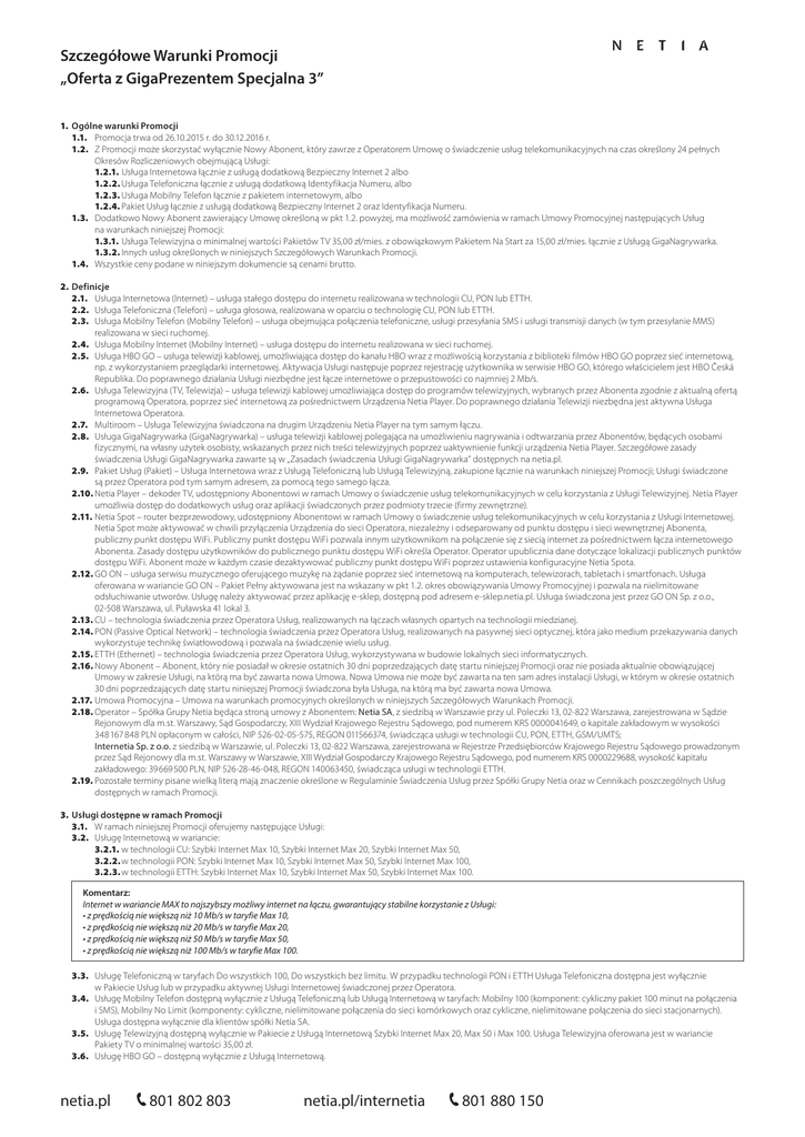 Szczegółowe Warunki Promocji „Oferta z GigaPrezentem Specjalna 3” 1. Ogólne warunki Promocji 1.1. Promocja trwa od 26.10.2015 r. do 30.12.2016 r. 1.2. Z Promocji może skorzystać wyłącznie Nowy Abonent, który zawrze z Operatorem Umowę o świadczenie usług telekomunikacyjnych na czas określony 24 pełnych Okresów Rozliczeniowych obejmującą Usługi: 1.2.1. Usługa Internetowa łącznie z usługą dodatkową Bezpieczny Internet 2 albo 1.2.2. Usługa Telefoniczna łącznie z usługą dodatkową Identyfikacja Numeru, albo 1.2.3. Usługa Mobilny Telefon łącznie z pakietem internetowym, albo 1.2.4. Pakiet Usług łącznie z usługą dodatkową Bezpieczny Internet 2 oraz Identyfikacja Numeru. 1.3. Dodatkowo Nowy Abonent zawierający Umowę określoną w pkt 1.2. powyżej, ma możliwość zamówienia w ramach Umowy Promocyjnej następujących Usług na warunkach niniejszej Promocji: 1.3.1. Usługa Telewizyjna o minimalnej wartości Pakietów TV 35,00 zł/mies. z obowiązkowym Pakietem Na Start za 15,00 zł/mies. łącznie z Usługą GigaNagrywarka. 1.3.2. Innych usług określonych w niniejszych Szczegółowych Warunkach Promocji. 1.4. Wszystkie ceny podane w niniejszym dokumencie są cenami brutto. 2. Definicje 2.1. Usługa Internetowa (Internet) – usługa stałego dostępu do internetu realizowana w technologii CU, PON lub ETTH. 2.2. Usługa Telefoniczna (Telefon) – usługa głosowa, realizowana w oparciu o technologię CU, PON lub ETTH. 2.3. Usługa Mobilny Telefon (Mobilny Telefon) – usługa obejmująca połączenia telefoniczne, usługi przesyłania SMS i usługi transmisji danych (w tym przesyłanie MMS) realizowana w sieci ruchomej. 2.4. Usługa Mobilny Internet (Mobilny Internet) – usługa dostępu do internetu realizowana w sieci ruchomej. 2.5. Usługa HBO GO – usługa telewizji kablowej, umożliwiająca dostęp do kanału HBO wraz z możliwością korzystania z biblioteki filmów HBO GO poprzez sieć internetową, np. z wykorzystaniem przeglądarki internetowej. Aktywacja Usługi następuje poprzez rejestrację użytkownika w serwisie HBO GO, którego właścicielem jest HBO Česká Republika. Do poprawnego działania Usługi niezbędne jest łącze internetowe o przepustowości co najmniej 2 Mb/s. 2.6. Usługa Telewizyjna (TV, Telewizja) – usługa telewizji kablowej umożliwiająca dostęp do programów telewizyjnych, wybranych przez Abonenta zgodnie z aktualną ofertą programową Operatora, poprzez sieć internetową za pośrednictwem Urządzenia Netia Player. Do poprawnego działania Telewizji niezbędna jest aktywna Usługa Internetowa Operatora. 2.7. Multiroom – Usługa Telewizyjna świadczona na drugim Urządzeniu Netia Player na tym samym łączu. 2.8. Usługa GigaNagrywarka (GigaNagrywarka) – usługa telewizji kablowej polegająca na umożliwieniu nagrywania i odtwarzania przez Abonentów, będących osobami fizycznymi, na własny użytek osobisty, wskazanych przez nich treści telewizyjnych poprzez uaktywnienie funkcji urządzenia Netia Player. Szczegółowe zasady świadczenia Usługi GigaNagrywarka zawarte są w „Zasadach świadczenia Usługi GigaNagrywarka” dostępnych na netia.pl. 2.9. Pakiet Usług (Pakiet) – Usługa Internetowa wraz z Usługą Telefoniczną lub Usługą Telewizyjną, zakupione łącznie na warunkach niniejszej Promocji; Usługi świadczone są przez Operatora pod tym samym adresem, za pomocą tego samego łącza. 2.10. Netia Player – dekoder TV, udostępniony Abonentowi w ramach Umowy o świadczenie usług telekomunikacyjnych w celu korzystania z Usługi Telewizyjnej. Netia Player umożliwia dostęp do dodatkowych usług oraz aplikacji świadczonych przez podmioty trzecie (firmy zewnętrzne). 2.11. Netia Spot – router bezprzewodowy, udostępniony Abonentowi w ramach Umowy o świadczenie usług telekomunikacyjnych w celu korzystania z Usługi Internetowej. Netia Spot może aktywować w chwili przyłączenia Urządzenia do sieci Operatora, niezależny i odseparowany od punktu dostępu i sieci wewnętrznej Abonenta, publiczny punkt dostępu WiFi. Publiczny punkt dostępu WiFi pozwala innym użytkownikom na połączenie się z siecią internet za pośrednictwem łącza internetowego Abonenta. Zasady dostępu użytkowników do publicznego punktu dostępu WiFi określa Operator. Operator upublicznia dane dotyczące lokalizacji publicznych punktów dostępu WiFi. Abonent może w każdym czasie dezaktywować publiczny punkt dostępu WiFi poprzez ustawienia konfiguracyjne Netia Spota. 2.12. GO ON – usługa serwisu muzycznego oferującego muzykę na żądanie poprzez sieć internetową na komputerach, telewizorach, tabletach i smartfonach. Usługa oferowana w wariancie GO ON – Pakiet Pełny aktywowana jest na wskazany w pkt 1.2. okres obowiązywania Umowy Promocyjnej i pozwala na nielimitowane odsłuchiwanie utworów. Usługę należy aktywować przez aplikację e-sklep, dostępną pod adresem e-sklep.netia.pl. Usługa świadczona jest przez GO ON Sp. z o.o., 02-508 Warszawa, ul. Puławska 41 lokal 3. 2.13. CU – technologia świadczenia przez Operatora Usług, realizowanych na łączach własnych opartych na technologii miedzianej. 2.14. PON (Passive Optical Network) – technologia świadczenia przez Operatora Usług, realizowanych na pasywnej sieci optycznej, która jako medium przekazywania danych wykorzystuje technikę światłowodową i pozwala na świadczenie wielu usług. 2.15. ETTH (Ethernet) – technologia świadczenia przez Operatora Usług, wykorzystywana w budowie lokalnych sieci informatycznych. 2.16. Nowy Abonent – Abonent, który nie posiadał w okresie ostatnich 30 dni poprzedzających datę startu niniejszej Promocji oraz nie posiada aktualnie obowiązującej Umowy w zakresie Usługi, na którą ma być zawarta nowa Umowa. Nowa Umowa nie może być zawarta na ten sam adres instalacji Usługi, w którym w okresie ostatnich 30 dni poprzedzających datę startu niniejszej Promocji świadczona był