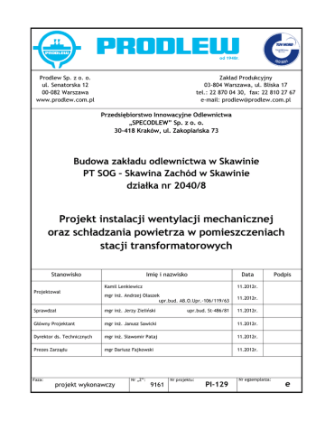 Projekt instalacji wentylacji mechanicznej oraz schładzania
