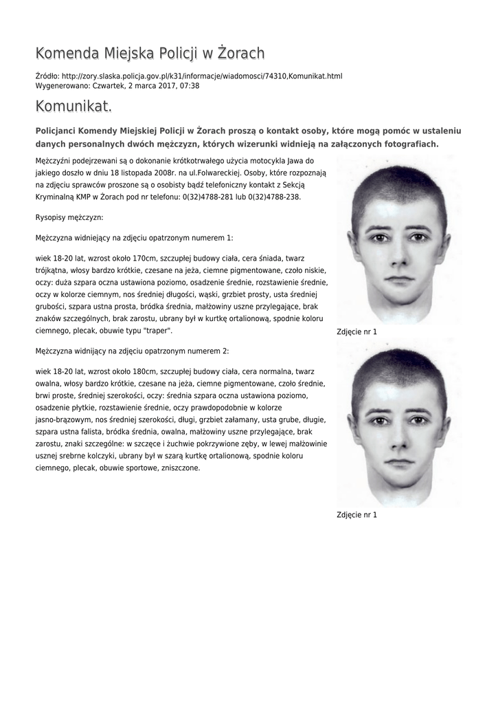 Komenda Miejska Policji w Żorach Źródło: http://zory.slaska.policja.gov.pl/k31/informacje/wiadomosci/74310,Komunikat.html Wygenerowano: Czwartek, 2 marca 2017, 07:38 Komunikat. Policjanci Komendy Miejskiej Policji w Żorach proszą o kontakt osoby, które mogą pomóc w ustaleniu danych personalnych dwóch mężczyzn, których wizerunki widnieją na załączonych fotografiach. Mężczyźni podejrzewani są o dokonanie krótkotrwałego użycia motocykla Jawa do jakiego doszło w dniu 18 listopada 2008r. na ul.Folwareckiej. Osoby, które rozpoznają na zdjęciu sprawców proszone są o osobisty bądź telefoniczny kontakt z Sekcją Kryminalną KMP w Żorach pod nr telefonu: 0(32)4788-281 lub 0(32)4788-238. Rysopisy mężczyzn: Mężczyzna widniejący na zdjęciu opatrzonym numerem 1: wiek 18-20 lat, wzrost około 170cm, szczupłej budowy ciała, cera śniada, twarz trójkątna, włosy bardzo krótkie, czesane na jeża, ciemne pigmentowane, czoło niskie, oczy: duża szpara oczna ustawiona poziomo, osadzenie średnie, rozstawienie średnie, oczy w kolorze ciemnym, nos średniej długości, wąski, grzbiet prosty, usta średniej grubości, szpara ustna prosta, bródka średnia, małżowiny uszne przylegające, brak znaków szczególnych, brak zarostu, ubrany był w kurtkę ortalionową, spodnie koloru ciemnego, plecak, obuwie typu "traper". Zdjęcie nr 1 Mężczyzna widnijący na zdjęciu opatrzonym numerem 2: wiek 18-20 lat, wzrost około 180cm, szczupłej budowy ciała, cera normalna, twarz owalna, włosy bardzo krótkie, czesane na jeża, ciemne pigmentowane, czoło średnie, brwi proste, średniej szerokości, oczy: średnia szpara oczna ustawiona poziomo, osadzenie płytkie, rozstawienie średnie, oczy prawdopodobnie w kolorze jasno-brązowym, nos średniej szerokości, długi, grzbiet załamany, usta grube, długie, szpara ustna falista, bródka średnia, owalna, małżowiny uszne przylegające, brak zarostu, znaki szczególne: w szczęce i żuchwie pokrzywione zęby, w lewej małżowinie usznej srebrne kolczyki, ubrany był w szarą kurtkę ortalionową, spodnie koloru ciemnego, plecak, obuwie sportowe, zniszczone. Zdjęcie nr 1 Zdjęcie nr 2 Ocena: 0/5 (0) Tweetnij