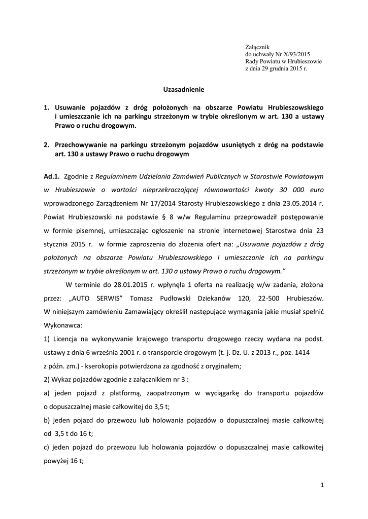 Załącznik do uchwały Nr X/93/2015 Rady Powiatu w Hrubieszowie z dnia 29 grudnia 2015 r. Uzasadnienie 1. Usuwanie pojazdów z dróg położonych na obszarze Powiatu Hrubieszowskiego i umieszczanie ich na parkingu strzeżonym w trybie określonym w art. 130 a ustawy Prawo o ruchu drogowym. 2. Przechowywanie na parkingu strzeżonym pojazdów usuniętych z dróg na podstawie art. 130 a ustawy Prawo o ruchu drogowym Ad.1. Zgodnie z Regulaminem Udzielania Zamówień Publicznych w Starostwie Powiatowym w Hrubieszowie o wartości nieprzekraczającej równowartości kwoty 30 000 euro wprowadzonego Zarządzeniem Nr 17/2014 Starosty Hrubieszowskiego z dnia 23.05.2014 r. Powiat Hrubieszowski na podstawie § 8 w/w Regulaminu przeprowadził postępowanie w formie pisemnej, umieszczając ogłoszenie na stronie internetowej Starostwa dnia 23 stycznia 2015 r. w formie zaproszenia do złożenia ofert na: „Usuwanie pojazdów z dróg położonych na obszarze Powiatu Hrubieszowskiego i umieszczanie ich na parkingu strzeżonym w trybie określonym w art. 130 a ustawy Prawo o ruchu drogowym.” W terminie do 28.01.2015 r. wpłynęła 1 oferta na realizację w/w zadania, złożona przez: „AUTO SERWIS” Tomasz Pudłowski Dziekanów 120, 22-500 Hrubieszów. W niniejszym zamówieniu Zamawiający określił następujące wymagania jakie musiał spełnić Wykonawca: 1) Licencja na wykonywanie krajowego transportu drogowego rzeczy wydana na podst. ustawy z dnia 6 września 2001 r. o transporcie drogowym (t. j. Dz. U. z 2013 r., poz. 1414 z późn. zm.) - kserokopia potwierdzona za zgodność z oryginałem; 2) Wykaz pojazdów zgodnie z załącznikiem nr 3 : a) jeden pojazd z platformą, zaopatrzonym w wyciągarkę do transportu pojazdów o dopuszczalnej masie całkowitej do 3,5 t; b) jeden pojazd do przewozu lub holowania pojazdów o dopuszczalnej masie całkowitej od 3,5 t do 16 t; c) jeden pojazd do przewozu lub holowania pojazdów o dopuszczalnej masie całkowitej powyżej 16 t; 1 3) Opłacona polisa, a w przypadku jej braku inny dokument potwierdzający, że wykonawca jest ubezpieczony od odpowiedzialności cywilnej w zakresie prowadzonej działalności, związanej z przedmiotem zamówienia, na sumę ubezpieczenia nie mniejszą niż 60 000,00 zł. - kserokopia potwierdzona za zgodność z oryginałem, złożona w chwili podpisania umowy. Wykonawca „AUTO SERWIS” Tomasz Pudłowski Dziekanów 120, 22-500 Hrubieszów w złożonej ofercie w załączniku nr 3 – wykaz pojazdów samochodowych niezbędnych do realizacji zamówienia przedstawił pojazdy, którymi dysponuje i będzie używał do wykonania w/w zadania: 1. Samochód specjalny marki Mercedes-Benz 412 o Nr rejestracyjnym LHR 09141, o dopuszczalnej ładowności 1700 kg. 2. Samochód specjalny marki Mercedes-Benz 1117 o Nr rejestracyjnym LHR 16036, o dopuszczalnej ładowności 5000 kg. 3. Ciągnik siodłowy marki Scania P310 DA o Nr rejestracyjnym LHR 20250. 4. Naczepa specjalna marki GS-MEPPEL 0-120-2000 TR o Nr rejestracyjnym LHR 69Y9, o dopuszczalnej ładowności 23740 kg. Wykonawca jednocześnie oświadczył, iż dysponuje odpowiednim potencjałem technicznym oraz osobami zdolnymi do wykonywania zamówienia jak i posiadania wiedzy i doświadczenia. Zamawiający wymagał aby: „Pojazdy specjalistyczne muszą spełniać warunki dodatkowe dla pojazdu samochodowego przeznaczonego do wykonywania czynności na drodze oraz dla innego pojazdu samochodowego, na który ze względu na bezpieczeństwo ruchu należy zwracać szczególną uwagę, zgodnie z rozporządzeniem Ministra Infrastruktury z dnia 31 grudnia 2002 r. w sprawie warunków technicznych pojazdów oraz zakresu ich niezbędnego wyposażenia (Dz. U. z 2013r., poz.951 z późn. zm.). W związku z powyższym Wykonawca, składający ofertę oświadcza w załączniku nr 3 do oferty, iż wymagania zostały spełnione. Zamawiający dokonując wyboru oferty uznaje, iż składane oświadczenia w postepowaniu są zgodne z prawdą tzn. stanem rzeczywistym. Nadmieniam, iż HERMES s.c. Aleksander Djabin, Bartłomiej Djabin nie złożyła oferty na realizację niniejszego zadania, mimo iż zapewnia że posiada specjalistyczny sprzęt. W dniu 17.02.2015 roku pojazd usunęła w/w s.c. „Hermes” Aleksander Djabin, Roman Djabin, która nie powinna otrzymać zlecenia usunięcia pojazdu, gdyż nie jest jednostką wyznaczoną przez Starostę Hrubieszowskiego. 2 Komisja powołana zarządzeniem nr 1/2015 Starosty Hrubieszowskiego dokonała oceny ofert, stwierdzając iż oferta spełnia postawione przez Zamawiającego wymogi. Zamawiający stawiając wymogi w w/w zadaniu nie określił wymogu posiadania sprzętu specjalistycznego – dźwig. Ad. 2 Zgodnie z Regulaminem Udzielania Zamówień Publicznych w Starostwie Powiatowym w Hrubieszowie o wartości nieprzekraczającej równowartości kwoty 30 000 euro wprowadzonego Zarządzeniem Nr 17/2014 Starosty Hrubieszowskiego z dnia 23.05.2014 r. Powiat Hrubieszowski na podstawie § 8 w/w Regulaminu przeprowadził postępowanie w formie pisemnej, umieszczając ogłoszenie na stronie internetowej Starostwa dnia 23 stycznia 2015 r. w formie zaproszenia do złożenia ofert na: Przechowywanie na parkingu strzeżonym pojazdów usuniętych z dróg na podstawie art. 130 a ustawy Prawo o ruchu drogowym. W terminie do 28.01.2015 r. wpłynęła 1 oferta na realizację w/w zadania, złożona przez: Mariusz Hapoński „AUT-LAK”, ul. Wodna 8, 22-500 Hrubieszów. W niniejszym zamówieniu Zamawiający określił następujące wymagania jakie musiał spełnić Wykonawca: 1) Wykaz nieruchomości niezbędnych do realizacji zamówienia –załącznik nr 3. W wykazie należy podać powierzchnię nieruchomości, adres wskazanej w wykazie nieruchomości, a także podstawę dysponowania wskazaną nieruchomością. 2) Opłacona polisa, a w przypadku jej braku inny dokument potwierdzający, że wykonawca jest ubezpieczony od odpowiedzialności cywilnej w zakresie prowadzonej działalności, zw