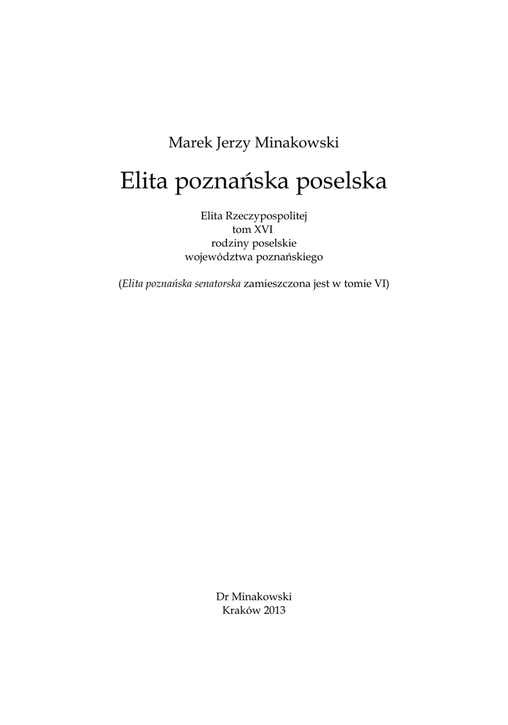 Marek Jerzy Minakowski Elita poznańska poselska Elita Rzeczypospolitej tom XVI rodziny poselskie województwa poznańskiego (Elita poznańska senatorska zamieszczona jest w tomie VI) Dr Minakowski Kraków 2013 Egzemplarz № ░░░░░░░░ ISBN 978-83-63202-14-9 Wydawca: Dr Minakowski ul. Komandosów 5/10 30-334 Kraków [email protected] www.przodkowie.com, ElitaRP.pl Złożono do druku w październiku 2012 Copyright © by Marek Jerzy Minakowski Zasady serii Elita Rzeczypospolitej 3 Zasady serii Elita Rzeczypospolitej Ogólną przedmowę do serii wydawniczej Elita Rzeczypospolitej umieściłem w tomie I (Elita północnomazowiecka, Kraków 2011). W tomie II nie umieściłem jej z powo du braku miejsca. Począwszy od tomu III umieszczam ją w wersji skróconej, jak poni żej. Z czasem zasady te będą ewoluować (co jest nieuniknione przy długich seriach wydawniczych), ale nie powinny to być zmiany głębokie. 1. Seria niniejsza przedstawia genealogię elity społeczno-politycznej Rzeczypo spolitej (Królestwa Polskiego i Wielkiego Księstwa Litewskiego) od pokolenia kwitną cego w ostatnich latach jej istnienia (okres Sejmu Wielkiego) do dzisiaj. 2. Uczestnicy Sejmu Wielkiego (jego posłowie i senatorowie) urodzili się około roku 1745. Tymczasem ostatnie kompletne wielotomowe kompendium genealogii elit Rzeczypospolitej, obejmujące całość alfabetu, to Korona polska Kaspra Niesieckiego (tzw. „Herbarz Niesieckiego”), ukończona w roku 1743 (autor zmarł w 1744). Misję ni niejszego dzieła można więc streścić następująco: Elitę rodową początków Rzeczypospolitej pokazuje kronika Jana Dłu gosza, zakończona z jego śmiercią w roku 1480. Kolejne 263 lata są opi sane w herbarzu Niesieckiego. Elita Rzeczypospolitej przedstawia zaś okres 267 lat od śmierci Niesieckiego do dzisiaj. Jak mają być sobie po dobne, tak muszą być od siebie różne — bo inne czasy je zrodziły i inne okresy są w nich przedstawione. 3. Rozmaicie można definiować tradycyjną elitę i każda definicja ma swoje wady. Chcąc być kompletnym, a jednocześnie nie przekraczać objętością czterdziestu tomów, przyjąłem wypróbowaną definicję „potomków Sejmu Wielkiego”. Są to więc posłowie na Sejm wybrani w wyborach 1788 i 1790 (obie kadencje Sejmu Czteroletnie go), senatorowie, którzy w tym czasie zaprzysięgli Konfederację sejmową, a także ro dzeństwo jednych i drugich wraz z potomstwem we wszystkich liniach aż do dziś. 4. Definicja ta nie rozróżnia stanu (szlachecki lub plebejski) ani sposobu dzie dziczenia (czy w linii męskiej, czy żeńskiej). Przez swą szerokość obejmuje więc ob szerne grupy zwane w XIX i XX wieku inteligencją — nawet wtedy, gdy w innych li niach te same osoby wywodziły się ze stanu mieszczańskiego czy żydowskiego, albo nawet chłopskiego. Nie rozróżnia narodowości, płci ani miejsca zamieszkania. 5. Inaczej niż dawniejsze herbarze, nie umieszczam tu informacji biograficz nych, a jedynie podstawowe daty życia opisywanych osób. Odsyłam za to, gdzie tylko to możliwe, do artykułów zamieszczonych w Polskim Słowniku Biograficznym, który ukazując się od roku 1935 doszedł już szczęśliwie do „Sz”. 6. Piszę tę książkę z perspektywy obywatela Rzeczypospolitej, a nie jednego z wielu państw powstałych na jej gruzach. Tak się jednak złożyło, że większość żyjących osób przedstawionych w tej książce mówi w domu po polsku. To samo dotyczy 4 Marek Jerzy Minakowski — Elita poznańska poselska prenumeratorów. Dlatego w tym języku książkę tę napisałem. Jeżeli pojawią się odpo wiednio silne argumenty — wybrane tomy (lub nawet całość) chętnie zobaczyłbym też w innych językach. 7. Elita Rzeczypospolitej podzielona jest na tomy według podziału administra cyjnego Rzeczypospolitej tak, by żaden tom nie przekraczał tysiąca stron. Czasami udaje się zmieścić jedno województwo w jednym tomie (tak było w tomie II), czasem tylko pół województwa (tak było w tomie I), a czasami na jeden tom składają się aż cztery dawne województwa (jak w tomie III). 8. Kolejność tomów jest przypadkowa. Prenumeratorom wysyłane są kolejne tomy, docelowo z częstotliwością miesięczną. Lista prenumeratorów umieszczona jest na końcu niniejszego tomu. Gdyby ktoś zdecydował się na prenumeratę później, bra kujące tomy również otrzyma. Jest też możliwość zamawiania jedynie wybranych to mów, kosztuje to jednak więcej. 9. Każdy tom opatrzony jest tablicą genealogiczną pokazującą powiązania we wnątrz grupy osób stanowiących elitę danego regionu. Te tablice pokazują, że w każ dym z tych przypadków mamy do czynienia z jedną de facto rodziną, a wyróżnianie „rodzin” według nazwisk lub pochodzenia od konkretnej osoby ma charakter umow ny. Stanowią uproszczoną mapę umożliwiającą odnalezienie się w gąszczu powiązań rodzinnych. 10. Właściwa treść zebrana jest w rozdziałach opisujących rodzinę danego członka elity wraz z jej koligacjami. 11. Wybierając osoby ważne, z którymi powiązania pokazać warto, kieruję się przede wszystkim kryterium posiadania biogramu w Polskim słowniku biograficznym. Dzieło to, wydawane początkowo przez Polską Akademię Umiejętności, a obecnie przez Instytut Historii Polskiej Akademii Nauk ukazuje się od roku 1935 i dochodzi do końca litery „S”, opisując ponad 26.000 osób żyjących na terenach Rzeczpospolitej lub mocno z nią związanych od pradziejów do końca XX wieku. Osoby o nazwiskach za czynających się na T-Ż są przez to niesprawiedliwie dyskryminowane, czy jednak można czekać kolejne ćwierć wieku (albo i więcej) aż dzieło to zostanie dokończone? Nie znam innego obiektywnego standardu, który pozwoliłby ocenić, kto jest postacią ważną, a o kim pamiętać się nie musi. Z Polskiego słownika biograficznego wybieram więc około 50 osób, które są najbliżej powiązane z bohaterem