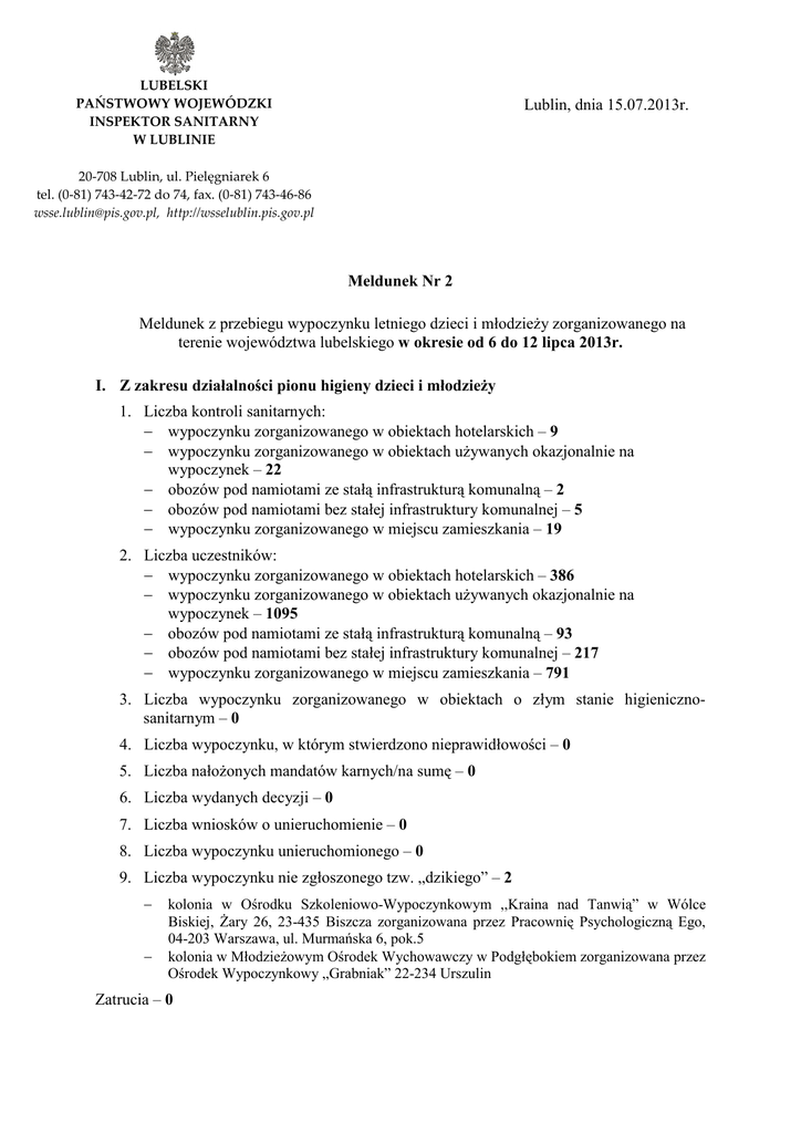LUBELSKI PAŃSTWOWY WOJEWÓDZKI INSPEKTOR SANITARNY W LUBLINIE Lublin, dnia 15.07.2013r. 20-708 Lublin, ul. Pielęgniarek 6 tel. (0-81) 743-42-72 do 74, fax. (0-81) 743-46-86 [email protected], http://wsselublin.pis.gov.pl Meldunek Nr 2 Meldunek z przebiegu wypoczynku letniego dzieci i młodzieŜy zorganizowanego na terenie województwa lubelskiego w okresie od 6 do 12 lipca 2013r. I. Z zakresu działalności pionu higieny dzieci i młodzieŜy 1. Liczba kontroli sanitarnych: − wypoczynku zorganizowanego w obiektach hotelarskich – 9 − wypoczynku zorganizowanego w obiektach uŜywanych okazjonalnie na wypoczynek – 22 − obozów pod namiotami ze stałą infrastrukturą komunalną – 2 − obozów pod namiotami bez stałej infrastruktury komunalnej – 5 − wypoczynku zorganizowanego w miejscu zamieszkania – 19 2. Liczba uczestników: − wypoczynku zorganizowanego w obiektach hotelarskich – 386 − wypoczynku zorganizowanego w obiektach uŜywanych okazjonalnie na wypoczynek – 1095 − obozów pod namiotami ze stałą infrastrukturą komunalną – 93 − obozów pod namiotami bez stałej infrastruktury komunalnej – 217 − wypoczynku zorganizowanego w miejscu zamieszkania – 791 3. Liczba wypoczynku zorganizowanego w obiektach o złym stanie higienicznosanitarnym – 0 4. Liczba wypoczynku, w którym stwierdzono nieprawidłowości – 0 5. Liczba nałoŜonych mandatów karnych/na sumę – 0 6. Liczba wydanych decyzji – 0 7. Liczba wniosków o unieruchomienie – 0 8. Liczba wypoczynku unieruchomionego – 0 9. Liczba wypoczynku nie zgłoszonego tzw. „dzikiego” – 2 − − kolonia w Ośrodku Szkoleniowo-Wypoczynkowym ,,Kraina nad Tanwią” w Wólce Biskiej, śary 26, 23-435 Biszcza zorganizowana przez Pracownię Psychologiczną Ego, 04-203 Warszawa, ul. Murmańska 6, pok.5 kolonia w MłodzieŜowym Ośrodek Wychowawczy w Podgłębokiem zorganizowana przez Ośrodek Wypoczynkowy „Grabniak” 22-234 Urszulin Zatrucia – 0 Wykaz wypoczynku skontrolowanego w okresie od 6 do 12 lipca 2013r. przez Państwową Inspekcję Sanitarną I. Formy wyjazdowe 1. Organizator – Andrzej Drewnowski ul. Wojska Polskiego 47/12, 05-101 Nowy Dwór Mazowiecki; obóz tenisowy zorganizowano w Domach Studenta Wydziału Wychowania Fizycznego i Sportu AWF, ul. Akademicka 2, 21-500 Biała Podlaska – wypoczynek oceniono jako dobry 2. Organizator – Lubelski Sportowy Klub Taekwon-do, ul. Nowowiejska 1/1, 20-880 Lublin; Centralne Zgrupowanie Taekwon-do zorganizowano w Domach Studenta Wydziału Wychowania Fizycznego i Sportu AWF, ul. Akademicka 2, 21-500 Biała Podlaska – wypoczynek oceniono jako dobry 3. Organizator – Katolickie Stowarzyszenie „Moria”, ul. Bp-a Świrskiego 57, 08-110 Siedlce; obóz szkoleniowy zorganizowano w Szkole Podstawowej z Oddziałami Przedszkola, ul. Warszawska 19, 21-580 Wisznice – wypoczynek oceniono jako dobry 4. Organizator – Pracownia Psychologiczna Ego,04-203 Warszawa, ul. Murmańska 6, pok.5; wypoczynek zorganizowano w Ośrodku Szkoleniowo-Wypoczynkowym ,,Kraina nad Tanwią” w Wólce Biskiej, śary 26, 23-435 Biszcza – wypoczynek oceniono jako dobry 5. Organizator – Stowarzyszenie Harcerstwa Katolickiego ul. śelazna 129, 20-364 Lublin; obóz harcerski zorganizowano w Gminie Biszcza, Oddział 123h, Nadleśnictwo Biłgoraj, Leśnictwo Biszcza – wypoczynek oceniono jako dobry 6. Organizator – HUFIEC RAWSKI Stowarzyszenie Harcerstwa Katolickiego ,,Zawisza” Federacja Skautingu Europejskiego, ul. Zwolińskie-go 2a/33, 96-200 Rawa Mazowiecka; obóz harcerski zorganizowano w Gminie Biszcza, Oddział 123h, Nadleśnictwo Biłgoraj, Leśnictwo Biszcza – wypoczynek oceniono jako dobry 7. Organizator – Stowarzyszenie Harcerstwa Katolickiego ul. śelazna 129, 20-364 Lublin; obóz harcerski zorganizowano w Górecku Starym 31A, 23-460 Józefów – wypoczynek oceniono jako dobry 8. Organizator – Niepubliczna Poradnia Psychologiczno-Pedagogiczna TRAMPOLINA ul. Kawaleryjska 10a lok. 2, 20-552 Lublin; obóz terapeutyczno-edukacyjny zorganizowano w Ośrodku Wypoczynkowym ALMATUR ul. Turystyczna 10E, 23-300 Janów Lubelski – wypoczynek oceniono jako dobry 9. Organizator – ALMATUR Ośrodek Wypoczynkowy Lucjan Ukryj ul. Szczytowa 11/61, 20-562 Lublin; obóz wypoczynkowo-rekreacyjny zorganizowano w Ośrodku Wypoczynkowym ALMATUR ul. Turystyczna 10E, 23-300 Janów Lubelski – wypoczynek oceniono jako dobry 10. Organizator – Biuro Turystyki Przyrodniczej PERKOZ Małgorzata Styła ul. Rynek 14, 20-111 Lublin; kolonie zorganizowano w Ośrodku Edukacji Ekologicznej przy Nadleśnictwie w Janowie Lubelskim ul. Bohaterów Porytowego Wzgórza 35h, 23-300 Janów Lubelski – wypoczynek oceniono jako dobry 11. Organizator – Studio „Relax-Sport” Marek Kulesza ul. Szolc-Rogozińskiego 8/2, 02-777 Warszawa; obóz rekreacyjno-wypoczynkowy zorganizowano w Ośrodku ZALEW Sp. z o.o. ul. Turystyczna 10, 23-300 Janów Lubelski – wypoczynek oceniono jako dobry 12. Organizator – Caritas Archidiecezji Lubelskiej ul. Prymasa Stefana Wyszyńskiego 2, 20-950 Lublin; kolonie zorganizowano w Ośrodku Formacyjno-Wypoczynkowym „Dom Zawierzenia” w Firleju ul. Choiny 2 21–136 Firlej – wypoczynek oceniono jako dobry 13. Organizator – K.P.T.W. „NATURA-TOUR” Sp. z o. o. ul. Dyrekcyjna 2-4, 80-598 Gdańsk; Moja pierwsza kolonia; Obóz ASG Braterstwo Broni; Obóz Wodny Patrol zorganizowano w Ośrodku Sportów Wodnych – „POLESIE” w Firleju ul. Wczasowa 4, 21-136 Firlej – wypoczynek oceniono jako dobry 14. Organizator – Katolickie Stowarzyszenie MłodzieŜy Archidiecezji Lubelskiej ul. Krakowskie Przedmieście 1, 20-002 Lublin; kolonie zorganizowano w Ośrodku Wypoczynkowym „Riviera Krasne”, Krasne 187, 21-109 Uścimów – wypoczynek oceniono jako dobry 15. Organizator – Stowarzyszenie Przyjaciół Domu Dziecka w Komarnie, Komarno 13, 21-543 Konstantynów; kolonie wychowanków domu dziecka zorganizowano w Specjalnym Ośrodku Szkolno-Wychowawcz