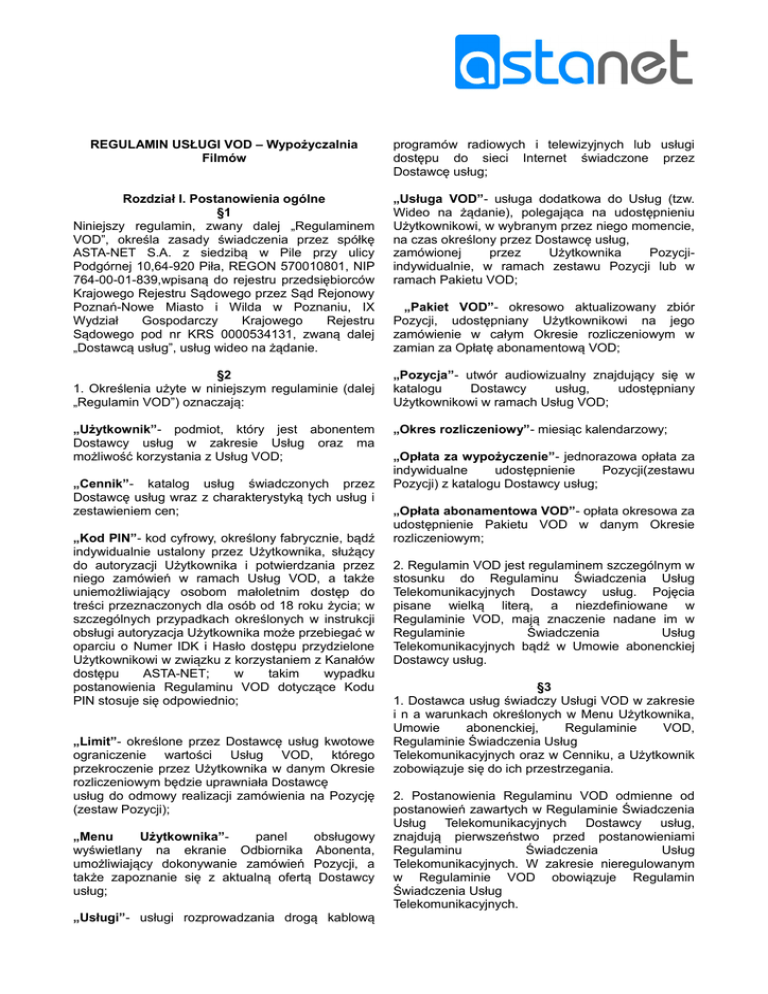 REGULAMIN USŁUGI VOD – Wypożyczalnia Filmów programów radiowych i telewizyjnych lub usługi dostępu do sieci Internet świadczone przez Dostawcę usług; Rozdział I. Postanowienia ogólne §1 Niniejszy regulamin, zwany dalej „Regulaminem VOD”, określa zasady świadczenia przez spółkę ASTA-NET S.A. z siedzibą w Pile przy ulicy Podgórnej 10,64-920 Piła, REGON 570010801, NIP 764-00-01-839,wpisaną do rejestru przedsiębiorców Krajowego Rejestru Sądowego przez Sąd Rejonowy Poznań-Nowe Miasto i Wilda w Poznaniu, IX Wydział Gospodarczy Krajowego Rejestru Sądowego pod nr KRS 0000534131, zwaną dalej „Dostawcą usług”, usług wideo na żądanie. „Usługa VOD”- usługa dodatkowa do Usług (tzw. Wideo na żądanie), polegająca na udostępnieniu Użytkownikowi, w wybranym przez niego momencie, na czas określony przez Dostawcę usług, zamówionej przez Użytkownika Pozycjiindywidualnie, w ramach zestawu Pozycji lub w ramach Pakietu VOD; §2 1. Określenia użyte w niniejszym regulaminie (dalej „Regulamin VOD”) oznaczają: „Pozycja”- utwór audiowizualny znajdujący się w katalogu Dostawcy usług, udostępniany Użytkownikowi w ramach Usług VOD; „Użytkownik”- podmiot, który jest abonentem Dostawcy usług w zakresie Usług oraz ma możliwość korzystania z Usług VOD; „Okres rozliczeniowy”- miesiąc kalendarzowy; „Cennik”- katalog usług świadczonych przez Dostawcę usług wraz z charakterystyką tych usług i zestawieniem cen; „Kod PIN”- kod cyfrowy, określony fabrycznie, bądź indywidualnie ustalony przez Użytkownika, służący do autoryzacji Użytkownika i potwierdzania przez niego zamówień w ramach Usług VOD, a także uniemożliwiający osobom małoletnim dostęp do treści przeznaczonych dla osób od 18 roku życia; w szczególnych przypadkach określonych w instrukcji obsługi autoryzacja Użytkownika może przebiegać w oparciu o Numer IDK i Hasło dostępu przydzielone Użytkownikowi w związku z korzystaniem z Kanałów dostępu ASTA-NET; w takim wypadku postanowienia Regulaminu VOD dotyczące Kodu PIN stosuje się odpowiednio; „Limit”- określone przez Dostawcę usług kwotowe ograniczenie wartości Usług VOD, którego przekroczenie przez Użytkownika w danym Okresie rozliczeniowym będzie uprawniała Dostawcę usług do odmowy realizacji zamówienia na Pozycję (zestaw Pozycji); „Menu Użytkownika”panel obsługowy wyświetlany na ekranie Odbiornika Abonenta, umożliwiający dokonywanie zamówień Pozycji, a także zapoznanie się z aktualną ofertą Dostawcy usług; „Usługi”- usługi rozprowadzania drogą kablową „Pakiet VOD”- okresowo aktualizowany zbiór Pozycji, udostępniany Użytkownikowi na jego zamówienie w całym Okresie rozliczeniowym w zamian za Opłatę abonamentową VOD; „Opłata za wypożyczenie”- jednorazowa opłata za indywidualne udostępnienie Pozycji(zestawu Pozycji) z katalogu Dostawcy usług; „Opłata abonamentowa VOD”- opłata okresowa za udostępnienie Pakietu VOD w danym Okresie rozliczeniowym; 2. Regulamin VOD jest regulaminem szczególnym w stosunku do Regulaminu Świadczenia Usług Telekomunikacyjnych Dostawcy usług. Pojęcia pisane wielką literą, a niezdefiniowane w Regulaminie VOD, mają znaczenie nadane im w Regulaminie Świadczenia Usług Telekomunikacyjnych bądź w Umowie abonenckiej Dostawcy usług. §3 1. Dostawca usług świadczy Usługi VOD w zakresie i n a warunkach określonych w Menu Użytkownika, Umowie abonenckiej, Regulaminie VOD, Regulaminie Świadczenia Usług Telekomunikacyjnych oraz w Cenniku, a Użytkownik zobowiązuje się do ich przestrzegania. 2. Postanowienia Regulaminu VOD odmienne od postanowień zawartych w Regulaminie Świadczenia Usług Telekomunikacyjnych Dostawcy usług, znajdują pierwszeństwo przed postanowieniami Regulaminu Świadczenia Usług Telekomunikacyjnych. W zakresie nieregulowanym w Regulaminie VOD obowiązuje Regulamin Świadczenia Usług Telekomunikacyjnych. 3. W przypadku Usług VOD będących usługami świadczonymi drogą elektroniczną, Regulamin VOD oraz Regulamin Świadczenia Usług Telekomunikacyjnych stanowią regulamin w rozumieniu ustawy z dnia 18 lipca 2002r. o świadczeniu usług drogą elektroniczną (dz.U.z 2002r. nr 144, poz.1204). usług ma prawo zawiesić świadczenie Usług VOD, po uprzednim poinformowaniu Użytkownika o tym fakcie. 4. Dostawca usług może wprowadzić odrębne regulaminy dla świadczonych przez siebie Usług, w szczególności związane z akcjami promocyjnymi(„regulaminy promocji”), które znajdują pierwszeństwo przed postanowieniami Regulaminu VOD. Rozdział III. Zamówienia. Rozpoczęcie świadczenia Usługi VOD. §6 1. W przypadku indywidualnego udostępniania Pozycji lub zestawu Pozycji Użytkownik składa zamówienie za pośrednictwem Menu Użytkownika, przy użyciu Kodu PIN, zgodnie z dostarczoną instrukcją obsługi. Złożenie zamówienia, potwierdzone wprowadzeniem przez Użytkownika Kodu PIN, jest równoznaczne z zawarciem przez Użytkownika umowy z Dostawcą usług w zakresie udostępnienia Pozycji lub zestawu Pozycji. 5. Dostawca usług może przy wykonywaniu zobowiązań wynikających z Umowy abonenckiej i Regulaminu VOD posługiwać się osobami trzecimi. Rozdział II. Usługi VOD. §4 1. Warunkiem skorzystania przez Użytkownika z Usług VOD jest zapoznanie się z Regulaminem VOD oraz odpowiednią instrukcją obsługi oraz dokonanie autoryzacji Użytkownika, zgodnie z postanowieniami instrukcji. 2. Pozycja jest udostępniana Użytkownikowi indywidualnie, w ramach zestawu Pozycji lub w ramach Pakietu VOD. 3. Złożenie przez Użytkownika zamówienia na Pozycję, zestaw Pozycji lub Pakiet VOD jest równoznaczne z zapoznaniem się z postanowieniami Regulaminu VOD oraz ich akceptacją. 4. Katalog Pozycji oferowanych Użytkownikowi w ramach Usług VOD wraz z ich charakterystyką określony jest w Menu Użytkownika. §5 1. Dostawca usług ma prawo w każdym czasie 
