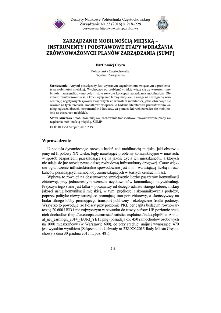 Zeszyty NaukoweBartłomiej Politechniki Osyra Częstochowskiej Zarządzanie Nr 22 (2016) s. 218–229 dostępne na: http://www.zim.pcz.pl/znwz ZARZĄDZANIE MOBILNOŚCIĄ MIEJSKĄ – INSTRUMENTY I PODSTAWOWE ETAPY WDRAŻANIA ZRÓWNOWAŻONYCH PLANÓW ZARZĄDZANIA (SUMP) Bartłomiej Osyra Politechnika Częstochowska Wydział Zarządzania Streszczenie: Artykuł poświęcony jest wybranym zagadnieniom związanym z problematyką mobilności miejskiej. Wychodząc od problemów, jakie wiążą się ze wzrostem mobilności, zasygnalizowano cele i istotę rozwoju koncepcji zarządzania mobilnością. Obszarem zainteresowania są z kolei wyłącznie tereny miejskie, z uwagi na szczególną koncentrację negatywnych zjawisk związanych ze wzrostem mobilności, jakie obserwuje się właśnie na tych terenach. Dodatkowo w oparciu o badania literaturowe przedstawiono katalog najważniejszych instrumentów i środków, za pomocą których zarządza się mobilnością na obszarach miejskich. Słowa kluczowe: mobilność miejska, zachowania transportowe, zrównoważone plany zarządzania mobilnością miejską, SUMP DOI: 10.17512/znpcz.2016.2.19 Wprowadzenie U podłoża dynamicznego rozwoju badań nad mobilnością miejską, jaki obserwujemy od II połowy XX wieku, legły narastające problemy komunikacyjne w miastach, w sposób bezpośredni przekładające się na jakość życia ich mieszkańców, a których nie udaje się już rozwiązywać dalszą rozbudową infrastruktury drogowej. Coraz większe ograniczenie infrastrukturalne spowodowane jest m.in. wzrastającą liczbą mieszkańców posiadających samochody zamieszkujących w ścisłych centrach miast. Wpływa to również na obserwowane zmniejszenie liczby pasażerów komunikacji zbiorowej, przy jednoczesnym wzroście użytkowników komunikacji indywidualnej. Przyczyn tego stanu jest kilka – począwszy od dużego udziału starego taboru, niskiej jakości usług komunikacji miejskiej, w tym: prędkości i skomunikowania podróży, poprzez politykę niewystarczająco promującą transport zbiorowy, a skończywszy na braku silnego lobby promującego transport publiczny i ekologiczne środki podróży. Wszystko to powoduje, że Polacy przy poziomie PKB per capita będącym równowartością 20.600 USD i nie najwyższym w stosunku do reszty państw UE poziomie średnich dochodów (http://ec.europa.eu/eurostat/statistics-explained/index.php/File: Annual_net_earnings,_2014_(EUR)_YB15.png) posiadają ok. 450 samochodów osobowych na 1000 mieszkańców (w Warszawie 600), co przy średniej unijnej wynoszącej 470 jest wysokim wynikiem (Załącznik do Uchwały nr 238.XX.2015 Rady Miasta Częstochowy z dnia 30 grudnia 2015 r., poz. 481). 218 Zarządzanie mobilnością miejską - instrumenty i podstawowe etapy … Według danych Eurostatu i Komisji Europejskiej 72% mieszkańców Unii Europejskiej zamieszkuje obszary zurbanizowane (Opracowanie Dyrekcji Generalnej ds. Polityki Wewnętrznej Komisji Europejskiej, Plan zrównoważonego transportu miejskiego, 2010, s. 15), a niemal 42% mieszka w granicach administracyjnych miast (http://ec.europa.eu/eurostat/cache/RSI/#?vis=typologies.urb_typology oraz http://uniaeuropejska.org/eurostat-41-proc-europejczykow-mieszka-w-miastach/) – podobny trend zauważalny jest w Polsce, gdzie dane GUS wskazują, że odsetek mieszkańców miast wynosi 52,2%1. Oczywiście na wynik pomiaru procentowego odsetka ludności zamieszkującej tereny miejskie duży wpływ ma metodologia kwalifikacji terenów jako obszarów zurbanizowanych, jednak każdy z pomiarów potwierdza obserwowany trend wzrostowy liczby osób zamieszkujących tereny miejskie w Polsce, co w sposób bezpośredni przekłada się na zwiększoną liczbę pojazdów w miastach (Pifczyk 2016). Celem artykułu jest przedstawienie problemów wiążących się ze wzrostem mobilności. Zasygnalizowane zostaną cele oraz istota rozwoju koncepcji zarządzania mobilnością miejską. Ponadto na podstawie badań literaturowych przedstawiony zostanie katalog najważniejszych instrumentów i środków, jakimi zarządza się mobilnością na obszarach miejskich. Mobilność i problemy, jakie generuje Stale wzrastający odsetek ludności Polski zamieszkującej obszary zurbanizowane jest wynikiem zarówno rozszerzania się oddziaływania struktur miejskich, jak i obserwowanych w ostatnim dwudziestoleciu zmian zachowań transportowych i stylu życia Polaków, których widoczną oznaką jest m.in. zwiększenie ich mobilności. Czym jednak jest mobilność? W znaczeniu potocznym – utożsamiana jest często z aktywnością, energią i zdolnością do elastycznego działania w stosunku do osób oraz możliwością przenoszenia i przesuwania w odniesieniu do rzeczy (http://sjp.pwn.pl/slowniki/mobilno%C5%9B%C4%87.html). W sferze logistyki miejskiej – mobilnością możemy określić ogół zachowań transportowych związanych z przemieszczaniem się osób na danym obszarze, jak i wszelkie działania zmierzające do osiągnięcia celu tego przemieszczania (np.: praca, nauka, rozrywka, sprawy socjalne i kulturalne), które ruch danej osoby generują (Hebel 2013, s. 32). Mobilność nieodłącznie związana jest z działalnością człowieka i jego zachowaniami transportowymi, które obejmują dwie decyzje. Pierwsza to decyzja o podjęciu podróży lub jej zaniechaniu, druga dotyczy wyboru środka transportu, czasu planowanej podróży oraz jej trasy (Szołtysek 2011, s. 145). Co ważne, na podjęcie obu decyzji istotny wpływ ma cały zestaw czynników o charakterze zarówno zewnętrznym, jak i wewnętrznym, z których najważniejsze nazwać możemy psychologiczno-społecznymi. Jest to nic innego jak oddziaływanie poglądów i opinii Co prawda w stosunku do spisu powszechnego z 2002 roku, odsetek ten uległ zmniejszeniu o 1,6%, jednak wynika ono głównie z migracji ludzi z dużych ośrodków miejskich na ich przedmieścia, leżące już na terenach administracyjnie wyodrębnianych jako o