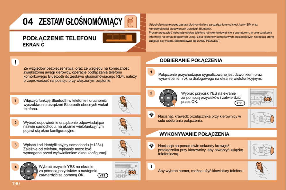 04 ZESTAW GŁOŚNOMÓWIĄCY PODŁĄCZENIE TELEFONU EKRAN C Usługi oferowane przez zestaw głośnomówiący są uzależnione od sieci, karty SIM oraz kompatybilności stosowanych urządzeń Bluetooth. Proszę przeczytać instrukcję obsługi telefonu lub skontaktować się z operatorem, w celu uzyskania informacji na temat dostępnych usług. Lista telefonów komórkowych, posiadających najlepszą ofertę znajduje się w sieci. Skontaktować się z ASO PEUGEOT. ODBIERANIE POŁĄCZENIA Ze względów bezpieczeństwa, oraz ze względu na konieczność zwiększonej uwagi kierowcy, operacje podłączania telefonu komórkowego Bluetooth do zestawu głośnomówiącego RD4, należy przeprowadzać na postoju przy włączonym zapłonie. 1 2 1 Włączyć funkcję Bluetooth w telefonie i uruchomić wyszukiwanie urządzeń Bluetooth obecnych wokół telefonu. 2 Wybrać odpowiednie urządzenie odpowiadające nazwie samochodu, na ekranie wielofunkcyjnym pojawi się okno konfiguracyjne. 3 4 190 WYKONYWANIE POŁĄCZENIA Nacisnąć na ponad dwie sekundy krawędź przełącznika przy kierownicy, aby otworzyć książkę telefoniczną. 1 YES Wybrać przycisk YES na ekranie za pomocą przycisków i zatwierdzić przez OK. YES Nacisnąć krawędź przełącznika przy kierownicy w celu odebrania połączenia. Wpisać kod identyfikacyjny samochodu (=1234). Zależnie od telefonu, wpisanie może być wymagane przed wyświetleniem okna konfiguracji. Wybrać przycisk YES na ekranie za pomocą przycisków a następnie zatwierdzić za pomocą OK. Połączenie przychodzące sygnalizowane jest dzwonkiem oraz wyświetleniem okna dialogowego na ekranie wielofunkcyjnym. Aby wybrać numer, można użyć klawiatury telefonu.