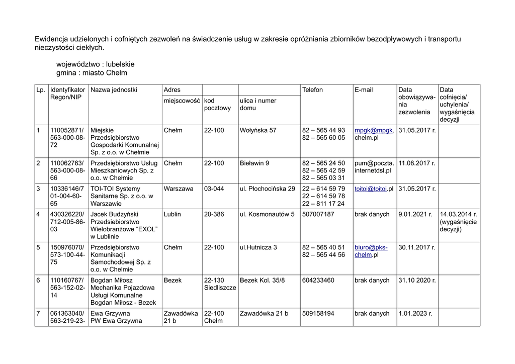 Ewidencja udzielonych i cofniętych zezwoleń na świadczenie usług w zakresie opróżniania zbiorników bezodpływowych i transportu nieczystości ciekłych. województwo : lubelskie gmina : miasto Chełm Lp. Identyfikator Nazwa jednostki Regon/NIP Adres miejscowość kod pocztowy Telefon E-mail ulica i numer domu Data obowiązywania zezwolenia 1 110052871/ Miejskie Chełm 563-000-08- Przedsiębiorstwo 72 Gospodarki Komunalnej Sp. z o.o. w Chełmie 22-100 Wołyńska 57 82 – 565 44 93 82 – 565 60 05 mpgk@mpgk. 31.05.2017 r. chelm.pl 2 110062763/ Przedsiębiorstwo Usług Chełm 563-000-08- Mieszkaniowych Sp. z 66 o.o. w Chełmie 22-100 Bieławin 9 82 – 565 24 50 82 – 565 42 59 82 – 565 03 31 pum@poczta. 11.08.2017 r. internetdsl.pl 3 10336146/7 01-004-6065 03-044 ul. Płochocińska 29 22 – 614 59 79 22 – 614 59 78 22 – 811 17 24 [email protected] 31.05.2017 r. 4 430326220/ Jacek Budzyński Lublin 712-005-86- Przedsiebiorstwo 03 Wielobranżowe “EXOL” w Lublinie 20-386 ul. Kosmonautów 5 507007187 brak danych 9.01.2021 r. 5 150976070/ Przedsiębiorstwo 573-100-44- Komunikacji 75 Samochodowej Sp. z o.o. w Chelmie Chełm 22-100 ul.Hutnicza 3 82 – 565 40 51 82 – 565 44 56 [email protected] 30.11.2017 r. 6 110160767/ Bogdan Miłosz 563-152-02- Mechanika Pojazdowa 14 Usługi Komunalne Bogdan Miłosz - Bezek Bezek 22-130 Bezek Kol. 35/8 Siedliszcze 604233460 brak danych 31.10 2020 r. 7 061363040/ Ewa Grzywna 563-219-23- PW Ewa Grzywna Zawadówka 22-100 21 b Chełm 509158194 brak danych 1.01.2023 r. TOI-TOI Systemy Sanitarne Sp. z o.o. w Warszawie Warszawa Zawadówka 21 b Data cofnięcia/ uchylenia/ wygaśnięcia decyzji 14.03.2014 r. (wygaśnięcie decyzji) 15 Zawadówka 21 b 8 110447552/ Piotr Silski 563-149-73- Jagodne 36 14 Jagodne 3 22-107 Sawin Jagodne 36 504917018 brak danych 1.01.2023 r. 9 110194418/ Janusz Wronka PRIMA- Pokrówka 563-180-64- LUX Janusz Wronka – 13 Pokrówka 22-100 Chełm Pokrówka 77 600944968 brak danych 31.01.2023 r. 26.11.2015 r. (wygaśnięcie decyzji) 10 061621022/ PIXI Spółka z 946-264-62- ograniczoną 09 odpowiedzialnością – Spółka Komandytowa w Lublinie Lublin 20-386 Lublin ul. Strojnowskiego 25 81 441-14-11 brak danych 29.02.2024 r. 11 061668992/ Tomasz Pietrykowski 563 230-13- AL-TOM Usługi 13 Asenizacyjne Tomasz Pietrykowski - Janów Janów 22-151 Janów ul. J. Słowackiego 19 519856688 brak danych 30.04.2024 r. 30.04.2015 r. (wygaśnięcie decyzji) 12 110567629/ 563-18556 -82 Małgorzata Franczak Chełm „EKO-WÓZ” Małgorzata Franczak - Chełm 22-100 Chełm ul. Ceramiczna 18 512132276 brak danych 31.05.2024 r. 13 110343551/ Edward Koniuszewski 563-121-98- Sklep Spożywczo80 Przemysłowy Edward Koniuszewski - Berdyszcze 22-175 Dorohusk ul. Kolejowa 2 531211096 brak danych 30.11.2024 r. Berdyszcze 2.10.2014 r. (wygaśnięcie decyzji)