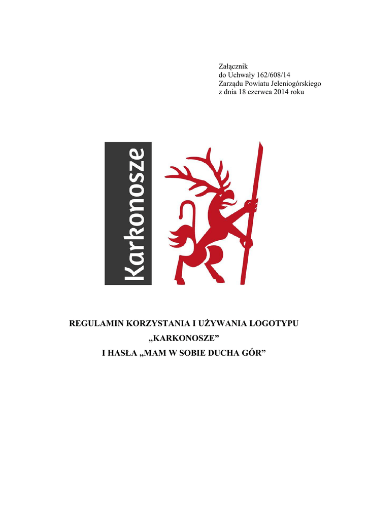 Załącznik do Uchwały 162/608/14 Zarządu Powiatu Jeleniogórskiego z dnia 18 czerwca 2014 roku REGULAMIN KORZYSTANIA I UŻYWANIA LOGOTYPU „KARKONOSZE” I HASŁA „MAM W SOBIE DUCHA GÓR” §1 PODMIOT PRAWA 1. Właścicielami logotypu „Karkonosze” i hasła „Mam w sobie ducha gór” są strony „Porozumienia w sprawie wzajemnej współpracy w zakresie wspólnej promocji turystycznej”: Powiat Jeleniogórski, Gmina Janowice Wielkie, Gmina Jeżów Sudecki, Gmina Mysłakowice, Gmina Podgórzyn, Gmina Miejska Piechowice oraz Miasto Jelenia Góra, Miasto Karpacz, Miasto Kowary, Miasto Szklarska Poręba. 2. Właściciele posiadają wszelkie prawa autorskie i pokrewne do logotypu KARKONOSZE i hasła MAM W SOBIE DUCHA GÓR. Korzystanie i używanie logotypu i hasła bez zgody Właścicieli pociągają za sobą odpowiedzialność przewidzianą stosownymi przepisami prawa. §2 PRZEDMIOT REGULAMINU 1. Przedmiotem Regulaminu jest logotyp marki Karkonosze składający się z symbolu Ducha Gór i nazwy „Karkonosze” oraz hasło „Mam w sobie ducha gór”. 2. Logotyp marki Karkonosze stanowi graficzny element systemu zewnętrznej identyfikacji Karkonoszy. 3. Logotyp i hasło mogą być wykorzystywane i używane wyłącznie w celach promocji Karkonoszy na rynkach zagranicznych oraz na rynku krajowym. 4. Właściciele nie zezwalają na korzystanie i używanie logotypu oraz hasła bez uzyskania zgody. 5. Logotyp oraz hasło mogą być umieszczane wyłącznie na nośnikach służących promocji Karkonoszy takich jak: druki, ulotki, filmy i spoty reklamowe oraz inne środki audiowizualne; strony internetowe, plansze, roll-up’y, prezentacje multimedialne, systemy wystawiennicze, materiały przygotowane na konferencje, seminaria, sympozja, szkolenia i inne. 6. Korzystanie i używanie z logotypu oraz hasła na własnych produktach lub materiałach promujących produkt wymaga uzyskania zgody Właścicieli. 7. Logotyp i hasło nie mogą być wykorzystywane i używane w celach nie zgodnych z niniejszym regulaminem. §3 LOGOTYP 1. Logotyp występuje wyłącznie z nazwą w języku polskim. 8. Logotyp może być stosowany w trzech wersjach: - podstawowej - to symbol w kolorze bordowym (Pantone 187C) i nazwa „Karkonosze” w kolorze białym (Pantone Opaque White), na szarym tle (Pantone Black 7C),; - pozytywowej - to symbol w kolorze szarym (Pantone Black 7C) lub czarnym (Pantone Process Black) na białym tle (, Pantone Opaque White), - negatywowej - to symbol w kolorze białym (Pantone Opaque White) na czarnym tle (Pantone Process Black), 9. Podstawowymi kolorami logotypu są bordowy i szary oraz barwa biała, wskazana w załączniku nr 1 do Regulaminu. 10. Proporcje znaku względem układu typograficznego i elementów graficznych (wskazane w załączniku nr 1 do Regulaminu) są stałe i nie mogą być w żaden sposób skalowane. 11. Typografią zastosowaną w logotypie jest krój Amaranth Regular, a budowa znaku określona jest w załączniku nr 1 do Regulaminu. 12. Zabroniona jest jakakolwiek ingerencja w konstrukcję Logotypu. §4 SPOSÓB UŻYWANIA ZNAKU 1. Logotyp Karkonosze należy umieszczać w wielkości zapewniającej czytelność i jego właściwe wyeksponowanie. 2. Logotyp powinien być zawsze otoczony polem ochronnym, wokół którego nie należy umieszczać żadnych napisów i elementów graficznych. 3. Konstrukcja pola ochronnego opiera się na szerokości szarego pola, na którym umieszczona jest nazwa „Karkonosze”. 4. Minimalna wielkość logotypu gwarantująca jego czytelność to 16,4 mm x 15 mm. 5. Niedozwolone jest stosowanie znaku na tle jednobarwnym o zbyt niskim kontraście. 6. Niedozwolone jest stosowanie znaku na tle z gradientem, wzorem lub na zdjęciu bez białego pola ochronnego. 7. Dozwolone jest stosowanie znaku, umieszczonego na białym polu ochronnym, na tle wielobarwnym. §5 HASŁO 1. Hasło „Mam w sobie ducha gór” występuje w czcionce Naomi Sans. 2. Typografią stosowaną w akcydensach jest krój Naomi Sans w odmianach Light, Regular, Medium, Bold oraz w kursywie dla każdej z w/w rodziny, określony w załączniku nr 2 do Regulaminu. §6 POZOSTAŁE ELEMENTY 1. Elementami z rodziny znaku Karkonosze są symbole pod nazwą: a) KULTURA – fiolet – ośrodki kultury, muzea, zespoły, lokalni twórcy, rzemieślnicy; b) RODZINA – zielony – miejsca wypoczynku dla rodzin, dedykowane szlaki i wycieczki; c) ODBUDOWA – niebieski – SPA, uzdrowiska, samotnie, miejsca magiczne; d) EXTREME – szlaki, zawody, ośrodki sportowe, rajdy; 2. Budowa elementów z rodziny znaków Karkonosze określona jest w załączniku nr 3 do Regulaminu. §7 UPRAWNIENI 1. Strony „Porozumienia w sprawie wzajemnej współpracy w zakresie wspólnej promocji turystycznej”: Powiat Jeleniogórski, Gmina Janowice Wielkie, Gmina Jeżów Sudecki, Gmina Mysłakowice, Gmina Podgórzyn, Gmina Miejska Piechowice oraz Miasto Jelenia Góra, Miasto Karpacz, Miasto Kowary, Miasto Szklarska Poręba. 2. Powiat Jeleniogórski, ul. Kochanowskiego 10, 58-500 Jelenia Góra, działający w imieniu stron „Porozumienia w sprawie wzajemnej współpracy w zakresie wspólnej promocji turystycznej” Gminy Janowice Wielkie, Gminy Jeżów Sudecki, Gminy Mysłakowice, Gminy Podgórzyn, Gminy Miejskiej Piechowice oraz Miasta Jelenia Góra, Miasta Karpacz, Miasta Kowary, Miasta Szklarska Poręba może na wniosek udzielić zgody na korzystanie i używanie logotypu „Karkonosze” i hasła „Mam w sobie ducha gór” podmiotom, które spełniają kryteria określone w niniejszym Regulaminie. 3. Korzystać i używać logotyp i hasło mogą na podstawie pisemnej zgody, określającej warunki korzystania i używania logotypu i hasła oraz termin korzystania i używania: 1) organy i jednostki organizacyjne stron wymienionych w §7 ust. 1, 2) inne podmioty m.in. osoby fizyczne, osoby prawne, organizacje pozarządowe (stowarzyszenia, fundacje), organizacje i instytucje kulturalne, sportowe stron wymienionych w