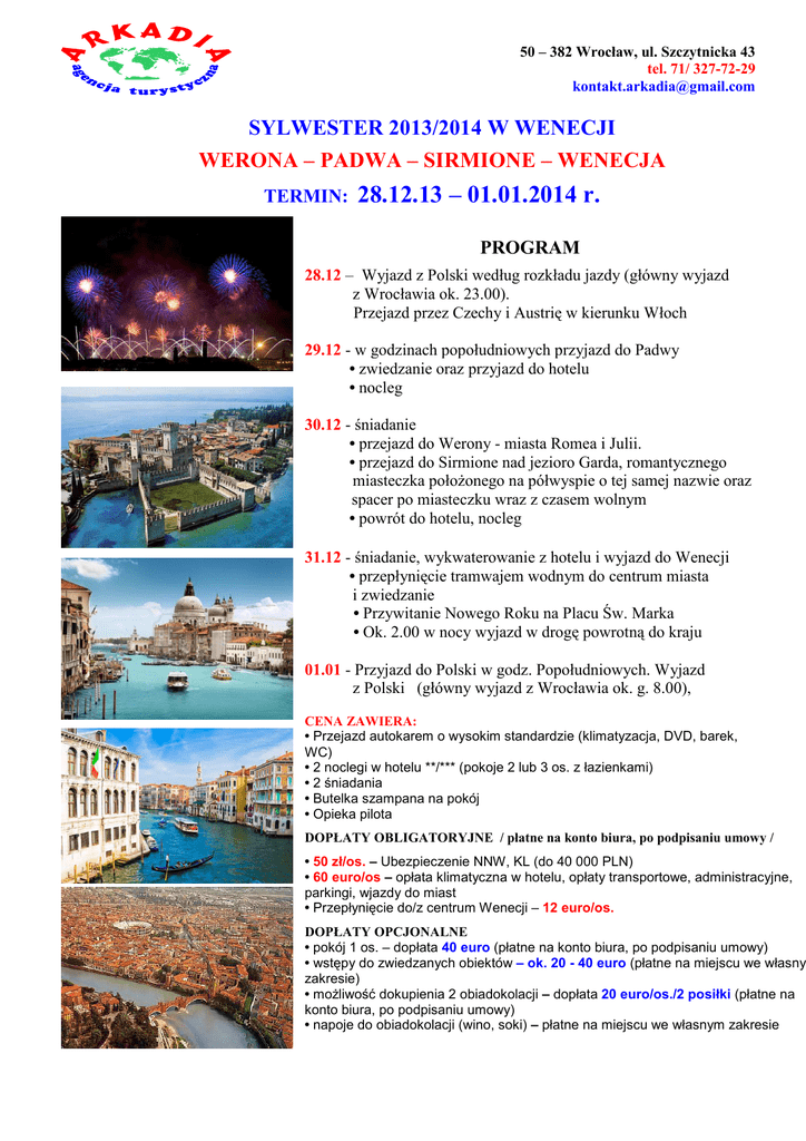 50 – 382 Wrocław, ul. Szczytnicka 43 tel. 71/ 327-72-29 [email protected] SYLWESTER 2013/2014 W WENECJI WERONA – PADWA – SIRMIONE – WENECJA TERMIN: 28.12.13 – 01.01.2014 r. PROGRAM 28.12 – Wyjazd z Polski według rozkładu jazdy (główny wyjazd z Wrocławia ok. 23.00). Przejazd przez Czechy i Austrię w kierunku Włoch 29.12 - w godzinach popołudniowych przyjazd do Padwy • zwiedzanie oraz przyjazd do hotelu • nocleg 30.12 - śniadanie • przejazd do Werony - miasta Romea i Julii. • przejazd do Sirmione nad jezioro Garda, romantycznego miasteczka położonego na półwyspie o tej samej nazwie oraz s spacer po miasteczku wraz z czasem wolnym • powrót do hotelu, nocleg 31.12 - śniadanie, wykwaterowanie z hotelu i wyjazd do Wenecji • przepłynięcie tramwajem wodnym do centrum miasta i zwiedzanie • Przywitanie Nowego Roku na Placu Św. Marka • Ok. 2.00 w nocy wyjazd w drogę powrotną do kraju 01.01 - Przyjazd do Polski w godz. Popołudniowych. Wyjazd z Polski (główny wyjazd z Wrocławia ok. g. 8.00), CENA ZAWIERA: • Przejazd autokarem o wysokim standardzie (klimatyzacja, DVD, barek, WC) • 2 noclegi w hotelu **/*** (pokoje 2 lub 3 os. z łazienkami) • 2 śniadania • Butelka szampana na pokój • Opieka pilota DOPŁATY OBLIGATORYJNE / płatne na konto biura, po podpisaniu umowy / • 50 zł/os. – Ubezpieczenie NNW, KL (do 40 000 PLN) • 60 euro/os – opłata klimatyczna w hotelu, opłaty transportowe, administracyjne, parkingi, wjazdy do miast • Przepłynięcie do/z centrum Wenecji – 12 euro/os. DOPŁATY OPCJONALNE • pokój 1 os. – dopłata 40 euro (płatne na konto biura, po podpisaniu umowy) • wstępy do zwiedzanych obiektów – ok. 20 - 40 euro (płatne na miejscu we własny zakresie) • możliwość dokupienia 2 obiadokolacji – dopłata 20 euro/os./2 posiłki (płatne na konto biura, po podpisaniu umowy) • napoje do obiadokolacji (wino, soki) – płatne na miejscu we własnym zakresie ______________________________________________________________________________________________________________________________________________________________________________ CENA: 809 zł PROMOCJA GROUPON !!! 299 zł/os. UWAGA !!! 1. Organizator zastrzega sobie prawo do zmiany kolejności zwiedzania. Szczegółowy program ustala pilot. 2. Możliwość wykupienia ubezpieczenia od rezygnacji z wyjazdu za 5% wartości imprezy oraz chorób przewlekłych, szczegóły w biurze. 3. Na wyjazd wymagany dowód osobisty lub paszport (ważne min. do lipca 2014r.) 4. Po zakupie kuponu w Groupon, klient jest zobowiązany potwierdzić swój udział w wyjeździe, w ciągu 3 dni od daty zakupu Groupona na mail: [email protected], podając dane osobowe: -imię i nazwisko, -adres zameldowania, -datę urodzenia, -nr dowodu osobistego/paszportu, -miasto wyjazdowe z Polski, -tel. kontaktowy) oraz skan kuponu Groupona. Dane osobowe są niezbędne do podpisania umowy na wyjazd. UWAGI DO ROZKŁADU JAZDY !!! 1. Autobus podstawowy wyjeżdża z Wrocławia, ok. godz. 08.00. Z pozostałych miast realizowane są tzw. połączenia antenowe przy min. 10 osobach (za dopłatą), realizowane różnymi środkami transportu: samochód osobowy, bus, pociąg, autobusy liniowe. Połączenia antenowe potwierdzane są na 72 godziny przed datą wyjazdu. Warszawa (150 zł), Opole (50 zł), Gliwice (60 zł), Kraków (100 zł), Katowice (80 zł). Inne miasta na zapytanie. 2. Przewozy antenowe są skomunikowane ze sobą, co może powodować oczekiwanie w miejscach przesiadkowych, zwłaszcza w terminach powrotu.