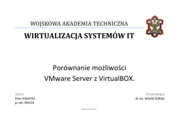 WOJSKOWA AKADEMIA TECHNICZNA WIRTUALIZACJA SYSTEMÓW IT Porównanie możliwości VMware Server z VirtualBOX. Autor Prowadzący Piotr KWIATEK gr szk. I9H1S4 dr inż. Witold ŻORSKI Warszawa 2011. Opis środowiska VMware Server Vmware Server wcześniej znany pod nazwą VMware GSX Server od 12 lipca 2006 roku jest udostępniany przez Vmware na zasadach licencji freeware. Jak większośd menadżerów maszyn wirtualnych (VMM – Virtual Machine Manager) umożliwia tworzenie, konfigurację oraz uruchamianie maszyn wirtualnych. Do przeprowadzenia testów opisanych w niniejszym sprawozdaniu użyłem ostatniego stabilnego wydania VMware Server 2.0.2 (Build 203138) z dn. 26.10.2009r. Oprogramowanie pracuje w trybie klient-serwer na dwóch płaszczyznach. VMware Server nie posiada desktopowej aplikacji do zarządzania serwerem, jednak wyposażono go w kontener aplikacji webowych - Tomcat w wersji 6. Udostępnia on webową aplikację – menadżera do zarządzania VMM napisanego w technologii JSP – VMware Infrastructure Web Access. VMware Server posiada także specjalne oprogramowanie w postaci wtyczki do przeglądarki internetowej odpowiadające za ekran wirtualnej maszyny – VMware Remote Console. Wracając do menadżera, pierwszą stycznośd z konfiguracją pracy webowego menadżera mamy już podczas instalacji, kiedy kreator prosi nas o ustawienie portów, na których ma nasłuchiwad serwer Tomcat. Wstępna konfiguracja serwera Tomcat do VMware Server Strona 2 z 24 Wirtualizacja systemów IT | Piotr KWIATEK Instalator prosi nas także o podanie numeru seryjnego, który można pobrad ze stron VMware po uprzedniej rejestracji. Po instalacji serwera w menadżerze usług systemu Windows 7 Professional widad uruchomione usługi odpowiedzialne za wirtualizację: Usługi uruchamiane przez VMware Server 2.0.2 Ponieważ VMware Server z założenia jest oprogramowaniem kierowanym na serwery przedsiębiorstw, jego interfejs do zarządzania (VIWA - VMware Infrastructure Web Access) został przystosowany do połączeo zdalnych, dlatego też do testów użyłem komputera zdalnego. Na komputerze zdalnym uruchomiłem za pomocą przeglądarki Internet Explorer 8 interfejs webowy serwera VMware spod adresu https://kwiatu5:8333/ui/. Kolejną częścią oprogramowania klienckiego jest wtyczka do przeglądarki umożliwiająca podgląd konsoli zwirtualizowanego systemu. Można ją pobrad z serwera i zainstalowad. VMware Infrastructure Web Access – menadżer do zarządzania VMware Server. Strona 3 z 24 Wirtualizacja systemów IT | Piotr KWIATEK Uwaga! W przypadku konsoli VMRC, VMware wspiera zasadniczo Internet Explorera od 6 wersji wzwyż. Wtyczka działa także w Mozilla Firefox do wersji 3.5.x, jednak w Mozilla Firefox 3.6 po kliknięciu na konsolę maszyna wirtualna już nie odpowiada. Podobna sytuacja jest z przeglądarką Google Chrome – wtyczka nie działa. Stwarza to dośd poważny problem w Linuksach z powodu braku Internet Explorer-a, ponieważ, aby uruchomid konsolę należy wywoływad ją bezpośrednio z pliku. W Windows 7 aplikacja znajduje się w: C:\Program Files\Common Files\VMware\VMware Remote Console Plug-in\ Można ją wywoład dodając odpowiednie parametry: vmware-vmrc -h <ip>:8333 -M "<vmid>" Zaletą VMRC jest to, że można pracowad na wirtualnej maszynie bez Pobieranie wtyczki do Internet Explorer 8 - VMRC konieczności używania programów typu VNC, Remote Desktop czy TeamViewer, a co za tym idzie maszyna wirtualna może nie mied skonfigurowanej sieci, ważne, aby miał ją skonfigurowaną host – czyli system gospodarza, na którym zainstalowano VMserver. VMRC widoczny jako plugin w Firefox 3.6.x Strona 4 z 24 Wirtualizacja systemów IT | Piotr KWIATEK VI Web Access Opis podstawowych paneli: Inventory panel – panel wyświetla wszystkie dodane do naszego inwentarza maszyny wirtualne. Wokrspace – kiedy zaznaczony jest host (komputer gospodarza), w prawej części menadżera wyświetlane są informacje o systemie hosta, zainstalowane magazyny danych, podłączone sieci. Dostępne są także zakładki przedstawiające wirtualne maszyny, bieżące zadania, zdarzenia na serwerze oraz uprawnienia użytkowników. Kiedy zaznaczona jest w inwentarzu konkretna wirtualna maszyna, przestrzeo workspace zawiera podsumowanie wirtualnej maszyny (pamięd, procesor, dyski itd.), okno konsoli, zadania dotyczące bieżącej wirtualnej maszyny, zdarzenia oraz uprawnienia. Okno konsoli VMRC podczas instalacji systemu Windows XP na wirtualnej maszynie Menu – zawiera menu oferujące podstawowe operacje do zarządzania maszynami wirtualnymi, opcje zarządzania energią, zarządzania snapshot-ami. Tasks – przestrzeo, w której wyświetlane są aktualne zadania wykonywane na serwerze. Strona 5 z 24 Wirtualizacja systemów IT | Piotr KWIATEK Oracle VM VirtualBox VirtualBox jest darmową aplikacją tworzoną przez Oracle do celów wirtualizacji. Jest to jedno z najpopularniejszych, wieloplatformowych środowisk do wirtualizacji. VirtualBox tak jak VMwareServer umożliwia tworzenie i uruchamianie maszyn wirtualnych, jednak dokumentacja VirtualBox wskazuje, że umożliwia on na pracę systemom z rodziny Windows (wszystkie wersje), Linux (Kernel 2.4-2.6.x), OS/2, Warp, OpenBSD, FreeBSD, Solaris, DOS. Nie jest jednak powiedziane, że nie wyszczególnione w dokumentacji VMware systemy nie zadziałają na VMware’owej, serwerowej wersji VMM. Na uwagę oczywiście muszą zasłużyd takie funkcje jak udostępnianie zasobów z wirtualną maszyną, a hostem, wspieranie wirtualizacji (Intel VT-x i AMD-V), obsługa wielu portów, zdalne sterowanie przy pomocy RDP, akcelerator 3D OpenGL 2.0. Aby bardziej przybliżyd funkcje oferowane przez VirtualBOX i jego mocniejsze strony wyróżniłem funkcje, którym VMware Server nie posiada (dokładne zestawienie różnic między produktem Oracle, a VMware – patrz tabela koocowa): „Zapis stanu maszyny, Dwustronny schowek, Automatyczna zmiana rozdzielczości ekranu w system