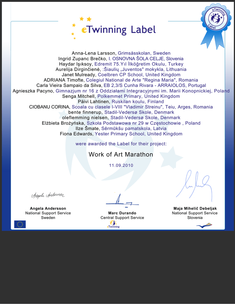 Anna-Lena Larsson, Grimsåsskolan, Sweden Ingrid Zupanc Brečko, I. OSNOVNA ŠOLA CELJE, Slovenia Haydar Işıksoy, Edremit 75.Yıl İlköğretim Okulu, Turkey Aurelija Dirginčienė, :Šiaulių „Juventos" mokykla, Lithuania Janet Mulready, Coelbren CP School, United Kingdom ADRIANA Timofte, Colegiul National de Arte "Regina Maria", Romania Carla Vieira Sampaio da Silva, EB 2,3/S Cunha Rivara - ARRAIOLOS, Portugal Agnieszka Pacyno, Gimnazjum nr 16 z Oddziałami Integracyjnymi im. Marii Konopnickiej, Poland Senga Mitchell, Polkemmet Primary, United Kingdom Päivi Lahtinen, Ruskilan koulu, Finland CIOBANU CORINA, Scoala cu clasele I-VIII "Vladimir Streinu", Teiu, Arges, Romania bente finnerup, Stadil-Vedersø Skole, Denmark oleflemming nielsen, Stadil-Vedersø Skole, Denmark Elżbieta Brożyńska, Szkoła Podstawowa nr 29 w Częstochowie , Poland Ilze Šmate, Sērmūkšu pamatskola, Latvia Fiona Edwards, Yester Primary School, United Kingdom were awarded the Label for their project: Work of Art Marathon 11.09.2010 Angela Andersson National Support Service Sweden Marc Durando Central Support Service Maja Mihelič Debeljak National Support Service Slovenia