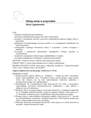 Obieg wody w przyrodzie Alina Ligaszewska Cele: − budzenie świadomości przyrodniczej, − utrwalenie materiału dotyczącego roli wody w przyrodzie, − poznanie i zrozumienie zjawisk i procesów zachodzących podczas obiegu wody w przyrodzie, − pobudzenie wszechstronnego rozwoju uczniów, a w szczególności rozbudzenie ich twórczej postawy, − wzbogacenie czynnego słownictwa dzieci o wyrażenia i zwroty związane z tematem, − rozwijanie i praktyczne sprawdzenie umiejętności cichego czytania ze zrozumieniem, − kształcenie umiejętności efektywnego współdziałania w zespole, − rozwijanie umiejętności świadomej i systematycznej kontroli. METODY: rozmowa, praca z tekstem, prezentacja prac grupy. FORMY PRACY: praca indywidualna oraz w dużej i małej grupie. ŚRODKI DYDAKTYCZNE: karty pracy, załączniki, komiks pt. „Wędrówki kropli wody, czyli o obiegu wody w przyrodzie”. Zajęcia zaplanowane są dla grupy wiekowej 11-12 lat. PRZEBIEG ZAJĘĆ: 1. Rozpoczynamy zajęcia zabawą pt. „Witajcie” – witając po kolei wszystkich, którzy mają niebieskie oczy, wszystkich, którzy noszą okulary, mają ciemne włosy itp. Zabawa ma na celu wprowadzenie właściwej atmosfery i przygotowanie grupy do współdziałania. 2. Nawiązujemy do wcześniejszych zajęć dotyczących roli wody w przyrodzie, zapowiadając utrwalenie dotychczasowych wiadomości z tego zakresu i zdobycie nowych informacji. 3. Dzielimy dzieci na grupy poprzez losowanie karteczek z rysunkami (załącznik nr 1). Następnie polecamy każdej z grup rozwiązanie zadania z karty pracy nr 1 i 2. Prezenter wyłoniony przez zespół głośno odczytuje propozycje grupy. 4. Prosimy dzieci o indywidualne rozwiązanie zadania z karty pracy nr 3 – ma ono na celu pobudzenie wyobraźni i zdolności kojarzenia. Porównujemy propozycje dzieci, umieszczając karty pracy na tablicy. 5. Polecamy dzieciom rozwiązanie krzyżówki z karty pracy nr 4, które pozwoli na poznanie tematu dzisiejszych zajęć. Alina Ligaszewska 6. Rozdajemy każdemu dziecku komiks pt. „Wędrówki kropli wody, czyli o obiegu wody w przyrodzie”. Polecamy bardzo dokładne przeczytanie tekstu, a następnie rozwiązanie zadań z karty pracy nr 5, które są sprawdzeniem cichego czytania ze zrozumieniem. 7. Zachęcamy uczniów do wymiany wypełnionych kart pracy nr 5 z kolegą w ławce i wprowadzenie przez niego ewentualnych poprawek. Zbieramy testy i zapowiadamy ogłoszenie wyników na następnych zajęciach. 8. Polecamy wcześniej dobranym grupom rozwiązanie zadania z karty pracy nr 6 i zapraszamy prezenterów poszczególnych zespołów do przedstawienia wyników swojej pracy wraz z komentarzem. 9. Podsumowujemy zajęcia, zwracając szczególną uwagę na pracę zespołową i twórcze myślenie. 10. Umożliwiamy dzieciom dokonanie samooceny poprzez rozwiązanie karty pracy nr 7. 11. Proponujemy uczniom zabranie komiksów do domu i pokolorowanie ich, mając nadzieję, że ten zabieg pozwoli na lepsze przyswojenie nowego materiału. Załącznik 1 Obieg wody w przyrodzie KARTA PRACY NR 1 Rozwiąż rebus i wpisz hasło w kratki na dole. O O L = D M Alina Ligaszewska KARTA PRACY NR 2 Ułóżcie wierszyk podkreślający walory i znaczenie wody wykorzystując hasło uzyskane przy rozwiązaniu rebusu z karty pracy nr 1. Obieg wody w przyrodzie KARTA PRACY NR 3 Zatytułuj przedstawione poniżej obrazki. Zielonym krzyżykiem w kwadratach znajdujących się w ich lewym górnym rogu zaznacz rysunki, w których woda jest sprzymierzeńcem człowieka, a czerwonym – te, w których utrudnia mu życie. Alina Ligaszewska KARTA PRACY NR 4 Rozwiąż krzyżówkę i odczytaj hasło w zaznaczonej kolumnie. 1 2 3 4 5 6 7 8 9 10 11 12 13 14 15 16 17 18 19 20 Obieg wody w przyrodzie 1. 2. 3. 4. 5. 6. 7. 8. 9. 10. 11. 12. 13. 14. 15. 16. 17. 18. 19. 20. Płyn niezbędny do życia Naczynie z uszkiem – do picia wody Mycie w wannie lub pod prysznicem Pada z nieba – jesienią Pada z nieba – zimą Kiedy woda z rzeki zalewa pola i miasta Jest nim np. Bałtyk Początek rzeki Jest nim rzeka na początku swojego biegu Ląd otoczony ze wszystkich stron wodą Woda w stanie gazowym Leci z niego woda w łazience Jest nią np. Odra Jest nią np. szczupak Pada z niej deszcz Jest nim np. Atlantyk Zamarznięta woda Śnieżna pora roku Można po nim pływać łódką Deszczowa pora roku KARTA PRACY NR 5 W poniższych zdaniach w miejsce kropek wstaw brakujące wyrazy. 1. Morza i oceany są największymi zbiornikami wody na Ziemi. Woda w nich ma smak .........................., ponieważ są w niej rozpuszczone różne .............................. 2. Pod wpływem działania promieni słonecznych woda zamienia się w ............................... i przedostaje się do atmosfery. 3. W wysokich, chłodnych warstwach atmosfery, skondensowana para wodna tworzy ..............................., które wiatr przenosi nad powierzchnią ziemi. Krople wody robią się coraz większe, aż wreszcie na ziemię spada ............................... 4. Zimą, gdy jest mróz, krople wody w chmurach zamarzają i zmieniają się w ..............................., albo w ............................... 5. Woda, która spadła na ziemię w postaci deszczu, wsiąka w nią. Przepływając przez glebę i szczeliny skalne wypłukuje z nich ............................... 6. Duże, puste przestrzenie powstające w skale na skutek przepływu wody nazywamy ............................... Nacieki powstające w nich na stropie i posadzce to ............................... i ............................... 7. Miejsce, w którym woda wypływa spod ziemi nazywamy ............................... 8. Woda spływa w kierunku nizin wąskimi ..............................., które łączą się tworząc szerokie ............................... Każda z nich w końcu dopływa do ..............................., gdzie obieg wody zaczyna się od początku. Alina Ligaszewska Obieg wody w przyrodzie Alina Ligaszewsk