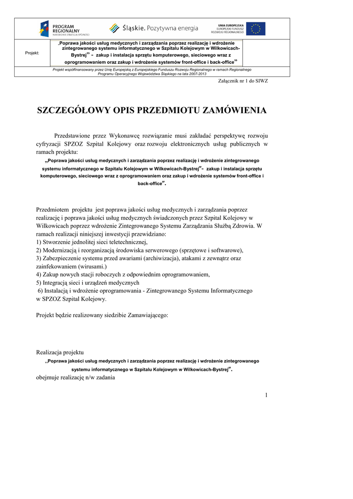 „Poprawa jakości usług medycznych i zarządzania poprzez realizację i wdroŜenie Projekt: zintegrowanego systemu informatycznego w Szpitalu Kolejowym w WilkowicachBystrej” - zakup i instalacja sprzętu komputerowego, sieciowego wraz z oprogramowaniem oraz zakup i wdroŜenie systemów front-office i back-office” Projekt współfinansowany przez Unię Europejską z Europejskiego Funduszu Rozwoju Regionalnego w ramach Regionalnego Programu Operacyjnego Województwa Śląskiego na lata 2007-2013 Załącznik nr 1 do SIWZ SZCZEGÓŁOWY OPIS PRZEDMIOTU ZAMÓWIENIA Przedstawione przez Wykonawcę rozwiązanie musi zakładać perspektywę rozwoju cyfryzacji SPZOZ Szpital Kolejowy oraz rozwoju elektronicznych usług publicznych w ramach projektu: „Poprawa jakości usług medycznych i zarządzania poprzez realizację i wdroŜenie zintegrowanego systemu informatycznego w Szpitalu Kolejowym w Wilkowicach-Bystrej”- zakup i instalacja sprzętu komputerowego, sieciowego wraz z oprogramowaniem oraz zakup i wdroŜenie systemów front-office i back-office”. Przedmiotem projektu jest poprawa jakości usług medycznych i zarządzania poprzez realizację i poprawa jakości usług medycznych świadczonych przez Szpital Kolejowy w Wilkowicach poprzez wdroŜenie Zintegrowanego Systemu Zarządzania SłuŜbą Zdrowia. W ramach realizacji niniejszej inwestycji przewidziano: 1) Stworzenie jednolitej sieci teletechnicznej, 2) Modernizacją i reorganizacją środowiska serwerowego (sprzętowe i softwarowe), 3) Zabezpieczenie systemu przed awariami (archiwizacja), atakami z zewnątrz oraz zainfekowaniem (wirusami.) 4) Zakup nowych stacji roboczych z odpowiednim oprogramowaniem, 5) Integracją sieci i urządzeń medycznych 6) Instalacją i wdroŜenie oprogramowania - Zintegrowanego Systemu Informatycznego w SPZOZ Szpital Kolejowy. Projekt będzie realizowany siedzibie Zamawiającego: Realizacja projektu „Poprawa jakości usług medycznych i zarządzania poprzez realizację i wdroŜenie zintegrowanego systemu informatycznego w Szpitalu Kolejowym w Wilkowicach-Bystrej”. obejmuje realizację n/w zadania 1 „Poprawa jakości usług medycznych i zarządzania poprzez realizację i wdroŜenie Projekt: zintegrowanego systemu informatycznego w Szpitalu Kolejowym w WilkowicachBystrej” - zakup i instalacja sprzętu komputerowego, sieciowego wraz z oprogramowaniem oraz zakup i wdroŜenie systemów front-office i back-office” Projekt współfinansowany przez Unię Europejską z Europejskiego Funduszu Rozwoju Regionalnego w ramach Regionalnego Programu Operacyjnego Województwa Śląskiego na lata 2007-2013 Załącznik nr 1 do SIWZ Zakup i instalację sprzętu komputerowego, sieciowego wraz z oprogramowaniem oraz zakupem i wdroŜeniem systemów font-office i back-office Wykonawca powinien być producentem oprogramowania lub w pełni autoryzowanym dystrybutorem z uprawnieniami do bezpośredniego serwisu do dokonywania usunięć awarii, aktualizacji i jest jedyną stroną odpowiedzialną za poprawne funkcjonowanie systemu. Zamawiający dopuszcza składanie rozwiązań równowaŜnych. Wykonawca zobowiązany jest do wykazania ich równowaŜności zgodnie z art. 30, ust. 5 Ustawy Prawo Zamówień Publicznych Wszędzie tam, gdzie przedmiot zamówienia jest opisany poprzez wskazanie znaków towarowych, patentów lub pochodzenia lub innych wymagań Zamawiający dopuszcza zastosowanie przez Wykonawcę rozwiązań równowaŜnych w stosunku do opisanych w specyfikacji, pod warunkiem, Ŝe będą one posiadały, co najmniej takie same lub lepsze parametry techniczne i funkcjonalne, i nie obniŜą określonych w specyfikacji standardów. Zamawiający dopuszcza w ramach oferty moŜliwość migracji baz danych pod pełną odpowiedzialnością za integralność, rozliczalność, spójność danych , a proces ten musi być zaakceptowany aŜ do stwierdzenia prawidłowości funkcjonowania systemów uŜytkowanych przez SPZOZ Szpital Kolejowy. Zamawiający dopuszcza proces migracji i importu danych z systemów istniejących, uŜytkowanych w organizacji do systemów oferowanych i zaproponowanych w ofercie. Zamawiający dopuszcza warunkowy proces migracji i importu danych z systemów istniejących, uŜytkowanych w organizacji do systemów oferowanych i zaproponowanych w ofercie. Oferent potwierdza poprzez oświadczenie w złoŜonej ofercie , iŜ wymagane przez Zamawiającego minimalne funkcjonalności są dostępne na dzień złoŜenia oferty a złoŜenie oświadczenia jest integralną częścią formularza ofertowego. 2 „Poprawa jakości usług medycznych i zarządzania poprzez realizację i wdroŜenie zintegrowanego systemu informatycznego w Szpitalu Kolejowym w WilkowicachBystrej” - zakup i instalacja sprzętu komputerowego, sieciowego wraz z Projekt: oprogramowaniem oraz zakup i wdroŜenie systemów front-office i back-office” Projekt współfinansowany przez Unię Europejską z Europejskiego Funduszu Rozwoju Regionalnego w ramach Regionalnego Programu Operacyjnego Województwa Śląskiego na lata 2007-2013 Załącznik nr 1 do SIWZ I. Tabelaryczne zestawienie zamówienia Przedmiot postępowania Zakup i instalację sprzętu komputerowego, sieciowego wraz z oprogramowaniem oraz zakupem i wdroŜeniem systemów font-office i back-office Zestawienie zbiorcze w w ramach zadania : „Zakup i instalację sprzętu komputerowego, sieciowego wraz z oprogramowaniem oraz zakupem i wdroŜeniem systemów font-office i back-office” Ilość sztuk łącznie Rodzaj sprzętu 1. Zestawy komputerowe z monitorem i 59 Zestaw komputerowy z monitorem 1 Monitor biurkowy – typ 2 1 Serwer bazodanowy z systemem 1 Serwer 1 licencjami dostępowymi - typ 1 2. (para) i licencją dostępową - typ 2 3. 4. operacyjnym 5. usługowy aplikacji z systemem operacyjnym 6. 7. 60 Oprogramowanie antywirusowe System archiwizacji systemem bazodanowym ,macierzą dyskową, backupem danych z 1 8. Przełącznik sieciowy typ 1 6 9. Przełącznik sieciowy typ 2 2 3 „Popr