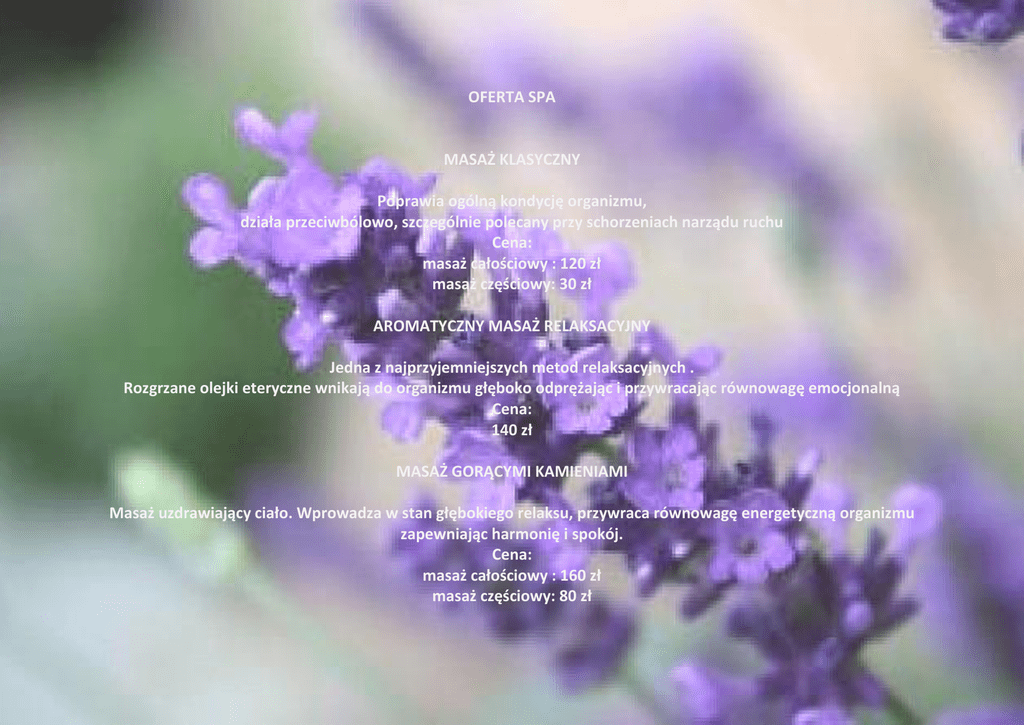 OFERTA SPA MASAŻ KLASYCZNY Poprawia ogólną kondycję organizmu, działa przeciwbólowo, szczególnie polecany przy schorzeniach narządu ruchu Cena: masaż całościowy : 120 zł masaż częściowy: 30 zł AROMATYCZNY MASAŻ RELAKSACYJNY Jedna z najprzyjemniejszych metod relaksacyjnych . Rozgrzane olejki eteryczne wnikają do organizmu głęboko odprężając i przywracając równowagę emocjonalną Cena: 140 zł MASAŻ GORĄCYMI KAMIENIAMI Masaż uzdrawiający ciało. Wprowadza w stan głębokiego relaksu, przywraca równowagę energetyczną organizmu zapewniając harmonię i spokój. Cena: masaż całościowy : 160 zł masaż częściowy: 80 zł MASAŻ STEMPLAMI ZIOŁOWYMI Niezwykły masaż wykonywany za pomocą stempli wypełnionych aromatycznymi ziołami. Dotyk rozgrzanych stempli i zapach olejków eterycznych uwalnianych z ziół stanowi ukojenie zarówno dla ciała jak i zmysłów. Cena: 150 zł ODPRĘŻAJĄCA CZEKOLADA Prawdziwa rozkosz dla zmysłów. Masaż gorącą czekoladą pieści ciało a bogactwo zawartych w niej składników odżywczych odmładza skórę. Ziarna kakaowca pobudzając produkcję hormonów szczęścia zapewniają poprawę samopoczucia. Cena: 170 zł ROSYJSKI MASAŻ CIEPŁYM MIODEM Połączenie masażu rozluźniającego z polewaniem ciała ciepłym miodem. Zabieg doskonale oczyszcza organizm usuwając toksyny z głębokich warstw skóry, a także uwalnia od stresu i przywraca dobre samopoczucie. Cena: Masaż całościowy: 170 zł Masaż częściowy: 90 zł ALGOWY BODY WRAPPING Najskuteczniejsza metoda błyskawicznego modelowania sylwetki oraz redukcji cellulitu, uelastycznia skórę, spłyca rozstępy oraz działa odtruwająco na organizm. Cena: Zabieg całościowy: 170 zł Zabieg częściowy: 90 zł MASAŻ TWARZY Niezwykle przyjemna forma terapii przeciwzmarszczkowej. Odprężający masaż twarzy pobudza skórę do intensywnej odnowy i regeneracji oraz pozwala na szybsze wchłonięcie substancji czynnych z kosmetyków . Cena: 40 zł SPA DLA STÓP Dobroczynny masaż stóp z aromatyczną kąpielą, wprowadza nas w stan błogiego relaksu, rozgrzewa, rozluźnia i dezynfekuje nasze stopy. Połączony z peelingiem i bardzo głębokim nawilżeniem sprawia, że czujemy się niezwykle wypoczęci. Cena: 15 min -40zł SPA DLA DŁONI Jest zabiegiem pielęgnacyjnym, dogłębnie odżywiającym, nawilżającym i wygładzającym naskórek, w skład którego wchodzą m.in. peeleing enzymatyczny, peeling solny oraz masaż odżywczym kremem do rąk. Cena: 10 min - 15 zł SPA DLA WŁOSÓW Doskonale połączenie profesjonalnych masek do włosów z seansem w saunie parowej lub infrared mobilizującym aktywne zioła i minerały do jeszcze szybszego i skuteczniejszego wnikania w cebulki włosów W ofercie: •maski dla włosów siwych •maski dla wzmocnienia włosów •maski głęboko nawilżające dla włosów łamliwych •maski zapobiegające wypadaniu włosów Cena: 15 min- 30 zł SAUNA (parowa, infrared) Gorąca terapia dla ciała i duszy. Kilkunastominutowy seans w saunie aktywizuje ukrwienie, rozluźnia napięte mięśnie, przy okazji gwarantuje dobre samopoczucie. Chcąc spotęgować intensywność doznań w saunie parowej oferujemy bogaty wybór olejków eterycznych. Cena: 30 min : 20 zł