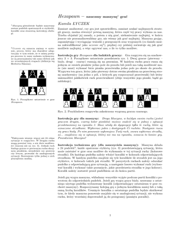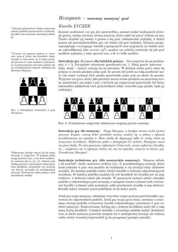 Hexapawn – 1 Maszyną górnolotnie będzie nazywany zestaw pudełek opatrzonych w etykietki, koraliki oraz stosowną instrukcję obsługi. 2 Uczenie się oznacza zmiany w systemie, proces, który ma charakter adaptacyjny w tym sensie, że w miarę postępu procesu te same zadania wykonywane są przynajmniej tak samo dobrze jak we wcześniejszych etapach (definicja wg Herberta Simona). nauczmy maszynę1 grać Kamila ŁYCZEK Zamiast analizować, czy gra jest sprawiedliwa, zamiast szukać najlepszych strategii graczy, można stworzyć pewną maszynę, która część tej pracy wykona za nas. Trzeba objaśnić jej zasady, a potem z nią grać, niekoniecznie najlepiej, w końcu jeszcze nie przeanalizowaliśmy gry, nie wiemy jak grać najlepiej. Maszyna grając, zapamiętując i wyciągając wnioski z przegranych oraz wygranych (co śmiało można zakwalifikować jako uczenie się2 ), prędzej czy później zorientuje się jak grać możliwie najlepiej, a więc ogrywać nas, o ile to tylko możliwe. Instrukcja gry Hexapawn dla ludzkich graczy: Gra rozgrywa się na szachownicy 3 × 3. Początkowe ustawienie przedstawia rys. 1. Dwaj gracze (pierwszy – biały, drugi – czarny) ruszają się na przemian. W każdym ruchu gracz rusza się jednym ze swoich pionków jedno pole do przodu lub jeżeli ma taką możliwość może (nie musi) wykonać bicie pionka przeciwnika jedno pole po skosie do przodu. Wygrywa ten gracz, który jako pierwszy dotrze swoim pionkiem na przeciwną stronę szachownicy (na jedno z pól, z których grę rozpoczynał przeciwnik) lub który uniemożliwi jakikolwiek ruch przeciwnikowi (zbije wszystkie jego pionki, bądź go zablokuje). Rys. 1. Początkowe ustawienie w grze Hexapawn. Rys. 2. Przykładowa rozgrywka zakończona wygraną gracza czarnego. 3 Faktycznie istnieje więcej niż 24 różne sytuacje w rozgrywce. W drugim ruchu mogą powstać trzy, a nie dwie możliwości (inaczej niż na rys. 3). Jednak ruch białego gracza w pierwszym ruchu skrajnym pionkiem, niezależnie czy prawym czy lewym, prowadzi do analogicznych sytuacji. Rozważenie tylko jednej z nich przyspiesza analizę. Instrukcja gry dla maszyny: Droga Maszyno, w każdym swoim ruchu (jesteś graczem drugim, czarny kolor pionków) możesz znaleźć się w jednej z sytuacji przedstawionej na rysunku 3. Masz wtedy do dyspozycji tylko te ruchy, które są oznaczone strzałkami. Wybierasz jeden z dostępnych Ci ruchów. Następnie rusza się gracz biały. Po nim ponownie wykonujesz Twój ruch, znowu wybierasz strzałkę, aż... znajdziesz się w sytuacji, której nie ma na rysunku, oznacza to koniec gry. Powodzenia Maszyno! Instrukcja techniczna gry (dla nauczyciela maszyny): Maszyna składa z 24 pudełek3 , każde opatrzone etykietą (rys. 3) przedstawiającą sytuację, która może zaistnieć w grze oraz możliwe do wykonania w tej sytuacji ruchy (kolorowe strzałki). Do każdego pudełka należy włożyć koraliki w kolorach odpowiadających strzałkom. W każdym pudełku znajdzie się tyle koralików ile strzałek jest na jego etykietce, w kolorach takich jak strzałki. W parzystych ruchach należy odszukać pudełko z odpowiadającą grze sytuacją, a następnie losowo wykonać ruch (wylosować koralik i wykonać takie posunięcie, jakie przedstawia strzałka w jego kolorze). Koralik należy zostawić przed pudełkiem aż do końca partii. Jeżeli grę wygra maszyna, wkładamy wszystkie wyjęte podczas partii koraliki z powrotem do odpowiednich pudełek. Jeżeli grę wygra gracz biały, usuwamy z ostatniego użytego pudełka wylosowany koralik (odpowiadający ostatniemu w grze ruchowi maszyny). Rozpoczynamy kolejną grę z jednym koralikiem mniej lub z taką samą liczbą koralików. Usunięcie koralika z ostatniego pudełka będzie skutkować tym, że kiedy maszyna ponownie znajdzie się w analogicznej sytuacji, nie wykona ruchu, który wcześniej doprowadził ją do przegranej (pamięta porażki). 1 Rys. 3. Etykietki maszyny. Numer pod każdą etykietką oznacza, w którym z kolei ruchu w grze dana sytuacja może zaistnieć. Rys. 4. Przykładowa rozgrywka wygrana przez maszynę. Żaden koralik nie jest usuwany. Rys. 5. Po wykonaniu czwartego ruchu, oznaczonego zieloną strzałką, biały gracz wygra. Jego jedynym możliwym ruchem będzie poruszenie się pionkiem znajdującym się na środku planszy jedno pole do przodu. Maszyna przegra. Z powyższego pudełka z numerem 4 usuwamy zielony koralik. Po paru grach zdarzy się, że niektóre pudełka będą zupełnie puste. Jeżeli maszyna znajdzie się w takiej sytuacji, oznacza to, że nie może wykonać żadnego ruchu, należy traktować to jak jej przegraną (mimo, że zgodnie z zasadami dla ludzkich graczy istnieją możliwe ruchy). Zgodnie z wcześniejszym opisem usuwamy ostatni użyty koralik. Opisaną metodą będą sukcesywnie eliminowane wszystkie ruchy prowadzące do przegranej drugiego gracza. Pozostaną tylko jego najlepsze posunięcia, które prowadzą do jego wygranej. Jak łatwo się przekonać, maszyna staje się mądrzejsza tylko po przegranej partii. Po dokładnie 11 przegranych (co oznacza około 40 gier z myślącym przeciwnikiem) maszyna nauczy się ogrywać nas zupełnie (w grze Hexapawn strategię wygrywającą ma drugi gracz). Jeżeli nauka będzie odbywać się z dobrym przeciwnikiem (wykonującym możliwie najlepsze ruchy) będzie przebiegać szybciej. Nieco szerzej: Gra Hexapawn została wymyślona przez Martina Gardnera w celu zilustrowania prostego działania maszyny samouczącej się, co opisał w rubryce Mathematical Games w Scientific American w marcu 19625 . Maszynę nazwał 2 5 przedrukowane m. in. w książce Knots and Borromean Rings, Rep-Tiles, and Eight Queens: Martin Gardner’s Unexpected Hanging, The New Martin Gardner Mathematical Library, 2014. HER (ang. Hexapawn Educable Robot) i stworzył dla niej partnera, samouczącego się robota HIM (ang. Hexapawn Instructable Matchboxes), który był graczem wykonującym pie