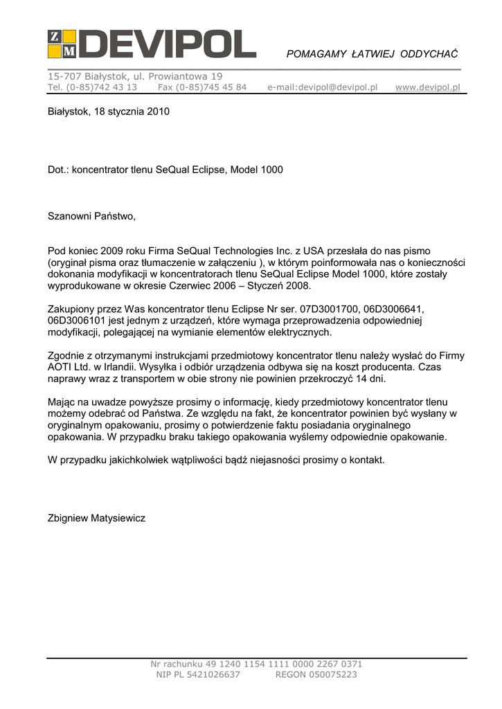 POMAGAMY ŁATWIEJ ODDYCHAĆ _____________________________________________________________________ 15-707 Białystok, ul. Prowiantowa 19 Tel. (0-85)742 43 13 Fax (0-85)745 45 84 e-mail:[email protected] www.devipol.pl Białystok, 18 stycznia 2010 Dot.: koncentrator tlenu SeQual Eclipse, Model 1000 Szanowni Państwo, Pod koniec 2009 roku Firma SeQual Technologies Inc. z USA przesłała do nas pismo (oryginał pisma oraz tłumaczenie w załączeniu ), w którym poinformowała nas o konieczności dokonania modyfikacji w koncentratorach tlenu SeQual Eclipse Model 1000, które zostały wyprodukowane w okresie Czerwiec 2006 – Styczeń 2008. Zakupiony przez Was koncentrator tlenu Eclipse Nr ser. 07D3001700, 06D3006641, 06D3006101 jest jednym z urządzeń, które wymaga przeprowadzenia odpowiedniej modyfikacji, polegającej na wymianie elementów elektrycznych. Zgodnie z otrzymanymi instrukcjami przedmiotowy koncentrator tlenu należy wysłać do Firmy AOTI Ltd. w Irlandii. Wysyłka i odbiór urządzenia odbywa się na koszt producenta. Czas naprawy wraz z transportem w obie strony nie powinien przekroczyć 14 dni. Mając na uwadze powyższe prosimy o informację, kiedy przedmiotowy koncentrator tlenu możemy odebrać od Państwa. Ze względu na fakt, że koncentrator powinien być wysłany w oryginalnym opakowaniu, prosimy o potwierdzenie faktu posiadania oryginalnego opakowania. W przypadku braku takiego opakowania wyślemy odpowiednie opakowanie. W przypadku jakichkolwiek wątpliwości bądź niejasności prosimy o kontakt. Zbigniew Matysiewicz Nr rachunku 49 1240 1154 1111 0000 2267 0371 NIP PL 5421026637 REGON 050075223 Listopad 23, 2009 POPRAWIENIE URZĄDZENIA MEDYCZNEGO Dotyczy urządzenia: Koncentrator tlenu Sequal Eclipse, Model 1000 Wyprodukowany w okresie Czerwiec 2006 - Styczeń 2008 Szanowny Kliencie, Firma Sequal Technologies, Inc. ustaliła, że w niektórych koncentratorach tlenu Eclipse (Model 1000) może wystąpić przedwczesne uszkodzenie pewnego elementu elektrycznego. Może to doprowadzić do wystąpienia czasowych przerw w zasilaniu urządzenia w przypadku korzystania z zasilania bateryjnego. Czasowe przerwy w zasilaniu mogą prowadzić do włączenia się alarmu oraz wyłączenia urządzenia. Jeżeli pacjent w tym czasie nie ma dostępu do alternatywnego źródła tlenu lub nie ma możliwości podłączenia urządzenia do zasilacza prądu zmiennego lub stałego może to doprowadzić do problemów z oddychaniem i być niebezpieczne dla osoby prowadzącej tlenoterapię. W związku z powyższym, w koncentratorze tlenu Eclipse (Model 1000) zostanie wymieniony wspomniany element elektryczny. Zminimalizuje to możliwość wystąpienia problemów w zasilaniu w przypadku korzystania z zasilania bateryjnego. Firma Sequal dostarczyła do wszystkich dystrybutorów wykaz urządzeń dotkniętych tym problemem wraz z numerami seryjnymi. Z dostarczonego wykazu wynika, że Twój Eclipse znajduje się na tej liście. Dystrybutor skontaktuje się z Tobą w celu przeprowadzenia serwisu urządzenia. Element elektryczny wymagający wymiany nie zakłóca w żaden inny sposób pracy Twojego koncentratora Eclipse. Proszę powiadomić dystrybutora o wszelkich niepokojących zdarzeniach jakie zostały stwierdzone podczas pracy koncentratora tlenu Eclipse (Model 1000). Dziękujemy za poświęconą uwagę oraz za okazaną pomoc. Mając na uwadze najwyższą jakość naszych produktów przepraszamy za wszelkie związane z tym niedogodności. Z poważaniem Joe Calabro V-ce prezes
