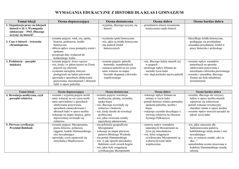 WYMAGANIA EDUKACYJNE Z HISTORII DLA KLAS I GIMNAZJUM Temat lekcji Ocena dopuszczająca Ocena dostateczna – wyjaśnią, dlaczego uczymy się historii 1. Organizacja pracy na lekcjach historii w kl. I. Wymagania edukacyjne – PSO. Dlaczego uczymy się historii? 2. Czas w historii – ćwiczenia chronologiczne. 3. Prehistoria – początki ludzkości Temat lekcji 4. Rewolucja neolityczna, czyli początki rolnictwa 5. Pierwsze cywilizacje. Przykład Babilonii – rozumie pojęcia: wiek, era, epoka, historia, prehistoria, źródło historyczne – oblicza upływ czasu pomiędzy erami i epokami – przypisuje daty wydarzeń do konkretnego wieku – rozumie pojęcie: homo sapiens – wie, kiedy i w jakim rejonie na Ziemi pojawił się człowiek – wymienia narzędzia, którymi posługiwali się ludzie pierwotni – opowiada o sposobach zdobywania pożywienia, mieszkaniach i ubiorach ludzi w epoce paleolitu Ocena dopuszczająca – rozumie i wyjaśnią pojęcie neolit – umie wskazać na osi czasu neolit – umie opowiedzieć o sposobach zdobywania pożywienia, sposobach zamieszkiwania i ubiorach ludzi w epoce neolitu – wskazuje na mapie miejsca, gdzie najwcześniej rozwinęło się rolnictwo – rozumie pojęcia: Mezopotamia, pismo klinowe, politeizm, ziggurat, kodeks Hammurabiego, sieć nawadniająca – opowiada, czym zajmowali się mieszkańcy Międzyrzecza Ocena dobra – wymienia epoki historyczne – wie, jakie są źródła historyczne – zna podział źródeł historycznych – rozumie pojęcia: paleolit, hominidy, neandertalczyk – zaznacza paleolit na osi czasu – umie wskazać na mapie kierunki ekspansji człowieka współczesnego Ocena dostateczna – rozumie pojęcia: rewolucja neolityczna, plemię, ceramika, epoka brązu – wie, dlaczego rozwinęły się rolnictwo i hodowla – wie, kiedy doszło do rewolucji neolitycznej – wie, jakie zwierzęta zostały najszybciej udomowione – zna położenie geograficzne Mezopotamii – wskazuje na mapie pierwsze państwa Bliskiego Wschodu – zna postać Hammurabiego – wie, w jaki sposób mieszkańcy Babilonii czcili swoich bogów – wie, jakie były osiągnięcia cywilizacyjne Mezopotamii Ocena bardzo dobra – przedstawia własne rozumienie konieczności nauki historii – klasyfikuje źródła historyczne, posługując się przykładami – uzasadnia przydatność źródeł w pracy historyka i archeologa – wie, dlaczego ludzie musieli żyć w grupach – dostrzega wpływ klimatu na warunki życia ludzi – wie, skąd pochodzi nazwa paleolit – rozumie wpływ warunków naturalnych na sposoby zdobywania pożywienia i mieszkania człowieka pierwotnego – rozumie i uzasadnia, dlaczego Ziemia nie była zaludniona równomiernie Ocena dobra – wskazuje wpływ klimatu na zmiany w życiu ludzi – potrafi dostrzec różnice pomiędzy epokami paleolitu, neolitu i brązu – wskazuje czynniki decydujące o rozwoju rolnictwa na obszarze Żyznego Półksiężyca Ocena bardzo dobra – rozumie, dlaczego nie wszyscy ludzie w epoce neolitu musieli zajmować się rolnictwem – potrafi wskazać rewolucyjny charakter zmian w epoce neolitu – rozumie wpływ nowych narzędzi na jakość życia ludzi – omawia wpływ warunków naturalnych Mezopotamii na życie jej mieszkańców – wie, które osiągnięcia cywilizacyjne Mezopotamii są wykorzystywane także współcześnie – wie, jakie znaczenie dla funkcjonowania państwa babilońskiego miały pismo i sieć nawadniająca – wie, co oznacza zasada „oko za oko...” – samodzielnie ocenia stosowaną w kodeksie Hammurabiego zasadę odwetu Temat lekcji 6. Starożytny Egipt – geografia starożytnego Egiptu, struktura społeczna. Ocena dopuszczająca – rozumie pojęcia: faraon, system nawadniający, sieć irygacyjna, piramida, politeizm, hieroglify, papirus – znajduje i wskazuje na mapie terytorium starożytnego Egiptu – omawia wpływ położenia geograficznego Egiptu na życie jego mieszkańców Ocena dostateczna – wymienia egipskie grupy społeczne, zna ich zadania – podaje przykłady osiągnięć naukowych Egiptu – rozpoznaje na ilustracjach zabytki starożytnego Egiptu i zna ich przeznaczenie – wie, kiedy powstał Egipt jako państwo, potrafi wskazać ten moment na osi czasu – potrafi wymienić najważniejszych bogów egipskich – rozumie, dlaczego Egipcjanie mumifikowali swoich zmarłych – potrafi omówić rolę kapłanów w życiu Egipcjan 7. Religia starożytnych Egipcjan – zna pojęcia politeizm, piramida, sarkofag, życie pozagrobowe, mumifikacja 8. Izrael – lud wybrany przez Boga – rozumie pojęcia i terminy: monoteizm, Arka Przymierza, Ziemia Obiecana, czasy patriarchów, wyrok salomonowy, szabat, rabin, judaizm, naród wybrany, teokracja, Tora – charakteryzuje cechy judaizmu – omawia wpływ warunków geograficznych Palestyny na życie jej mieszkańców – wskazuje Palestynę na mapie – wymienia postacie związane z historią narodu wybranego: Abrahama, Mojżesza, Dawida, Salomona 9. Powtórzenie wiadomości – początki ludzkości i cywilizacje Bliskiego Wschodu. 10. Sprawdzian wiadomości. – rozumie pojęcia: wiek, era, epoka, historia, prehistoria, źródło historyczne, judaizm, Mezopotamia, faraon, piramida, hieroglify, papirus, sieć irygacyjna, politeizm, monoteizm – oblicza upływ czasu pomiędzy erami i epokami – wskazuje na mapie: Mezopotamię, Egipt, Palestynę – zna postacie: Hammurabiego, Mojżesza, Dawida, Salomona – podaje genezę i znaczenie powiedzenia „oko za oko”, „salomonowy wyrok” – omawia zasady funkcjonowania państw w Mezopotamii, państwa egipskiego i Izraela – rozumie pojęcia: zodiak, kodeks Hammurabiego, Biblia 11. Początki Grecji - geografia – wskazuje na mapie starożytną – wie, kim był Homer Ocena dobra – wyjaśnią, co znaczy powiedzenie: „Egipt darem Nilu” – rozumie znaczenie sieci irygacyjnej dla rozwoju rolnictwa Ocena bardzo dobra – rozumie, dlaczego w Egipcie powst