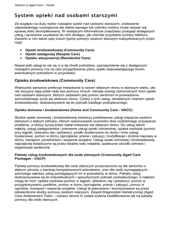 Options in Aged Care – Polish System opieki nad osobami starszymi Ze względu na duży wybór rodzajów opieki nad osobami starszymi, znalezienie odpowiedniego rozwiązania dla siebie samego lub członka rodziny może okazać się sprawą dość skomplikowaną. W niniejszym informatorze znajdziesz przegląd dostępnych usług i sposobów uzyskania do nich dostępu, jak również przydatne numery telefonu. Zawarto w nim także opis trzech typów pomocy osobom starszym subsydiowanych przez rząd: • • • Opieki środowiskowej (Community Care) Opieki zastępczej (Respite Care) Opieku stacjonarnej (Residential Care) Nawet jeśli usługi te nie są ci w tej chwili potrzebne, zaznajomienie się z dostępnymi rodzajami pomocy ma na celu przygotowanie planu opieki dopowiadającego twoim ewentualnym potrzebom w przyszłości. Opieka środowiskowa (Community Care) Większość seniorów preferuje mieszkanie w swoim własnym domu w starszym wieku, ale nie wszyscy dają sobie radę bez pomocy innych. Istnieje szereg różnorodnych form opieki nad osobami starszymi, których zadaniem jest pomoc seniorom w prowadzeniu samodzielnego życia we własnym domu. Cztery z tych usług, określanych mianem opieki środowiskowej, dostosowywane są do potrzeb każdego podopiecznego: Opieka domowa i środowiskowa (Home and Community Care - HACC) Służba opieki domowej i środowiskowej świadczy podstawowe usługi wsparcia osobom starszym o słabym zdrowiu, którym wykonywanie czynności dnia codziennego przysparza problemy, a którzy życzą sobie nadal mieszkać we własnym domu. Do usług takich należą: usługi pielęgniarskie i pokrewne usługi opieki zdrowotnej, opieka osobista (pomoc przy kąpieli, ubieraniu się i jedzeniu), posiłki dostarczane do domu i inne usługi żywieniowe, pomoc w domu (sprzątanie, pranie i zakupy), modyfikacje i drobne naprawy w domu, transport, poradnictwo i wsparcie socjalne. Usługi opieki domowej i środowiskowej najczęściej świadczone są przez lokalne rady miejskie, społeczne ośrodki zdrowia i organizacje społeczne. Pakiety usług środowiskowych dla osób starszych (Community Aged Care Packages - CACP) Pakiety pomocy środowiskowej dla osób starszych przeznaczone są dla seniorów o słabym zdrowiu z bardziej kompleksowymi potrzebami, oraz dla osób wymagających szerszego zakresu usług pomagających im w pozostaniu w domu. Pakiety usług dostosowywane są do indywidualnych i specyficznych potrzeb podopiecznego, a należeć mogą do nich: opieka osobista (pomoc w kąpieli, ubieraniu się i jedzeniu), pomoc w przygotowywaniu posiłków, pomoc w domu (sprzątanie, pranie i zakupy), pomoc w ogrodzie, transport i wsparcie socjalne. Usługi te planowane i koordynowane są przez zatwierdzone służby pomocy osobom starszym. Zespół Diagnostyki Geriatrycznej (Aged Care Assessment Team – zobacz strona 3) ustala kryteria kwalifikowania się na pakiety pomocy dla osób starszych. Pakiety poszerzonej opieki domowej dla osób starszych (Extended Aged Care at Home Packages - EACH) W ramach Pakietów poszerzonej opieki domowej dla osób starszych świadczone są usługi osobom potrzebującym bardziej kompleksowej opieki, niż osoby korzystające z pomocy w ramach Pakietów pomocy środowiskowej dla osób starszych. Pakiety pomocy dostosowane są do indywidualnych i specyficznych potrzeb podopiecznych, a należeć do nich mogą: usługi pielęgniarskie i pokrewne usługi opieki zdrowotnej, opieka osobista (pomoc przy kąpieli, ubieraniu się i jedzeniu), posiłki dostarczane do domu i inne usługi żywieniowe, pomoc w domu (sprzątanie, pranie i zakupy), modyfikacje i naprawy w domu, transport, poradnictwo i wsparcie socjalne. Usługi te planowane i koordynowane są przez urzędowe służby pomocy osobom starszym. Zespół Diagnostyki Geriatrycznej (Aged Care Assessment Team – zobacz strona 3) ustala kryteria kwalifikowania się na program Poszerzonej opieki domowej dla osób starszych. Pakiety poszerzonej opieki domowej dla osób z demencją (Extended Aged Care at Home Packages Dementia - EACH D) Pakiety poszerzonej opieki domowej dla osób z demencją świadczy usługi dla osób żyjących z demencją. Pakiety pomocy dostosowane są do indywidualnych i specyficznych potrzeb podopiecznych, a należeć do nich mogą: usługi pielęgniarskie i powiązane usługi opieki zdrowotnej, opieka osobista (pomoc przy kąpieli, ubieraniu się i jedzeniu), posiłki dostarczane do domu i inne usługi żywieniowe, pomoc w domu (sprzątanie, pranie i zakupy), modyfikacje i naprawy w domu, transport, poradnictwo i wsparcie socjalne. Usługi te planowane i koordynowane są przez zatwierdzone służby pomocy osobom starszym. Zespół Diagnostyki Geriatrycznej (Aged Care Assessment Team – zobacz strona 3) ustala kryteria kwalifikowania się na Pakiety poszerzonej opieki domowej dla osób z demencją. Więcej informacji na temat opieki środowiskowej oraz aby znaleźć służbę pomocy najlepiej odpowiadającej twoim potrzebom, wystarczy zadzwonić do Federalnego ośrodka opieki zastępczej dla opiekunów (Commonwealth Carelink Centre) pod numer 1800 052 222. Opieka zastępcza (Respite Care) Opieka zastępcza to krótkoterminowa forma opieki, która umożliwia starszym osobom oraz ich opiekunom na zrobienie sobie przerwy w codziennych rutynowych obowiązkach. Wieloma osobami starszymi opiekują się członkowie ich rodzin w domu, dlatego ważnym jest, aby opiekunowie mieli dostęp do wsparcia w wykonywaniu tej cennej roli, zwłaszcza że wielu opiekunów jest w podeszłym już wieku. Opieka zastępcza pomaga opiekunom w zrobieniu sobie przerwy od odpowiedzialności nad podopiecznym, jednocześnie umożliwiając podopiecznym pozostanie w domu. Opieka zastępcza świadczy usługi osobom starszym w formie przejściowej, co umożliwia opiekunowi odpoczynek, zajęcie się innymi sprawami (np. zakupami) lub wyjazd na wakacje. Zwykle planowany jest z wyprzedzeniem, ale można skorzystać z n