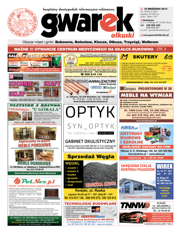 18 WRZEŚNIA 2014 Nr 18/2014 (201) Nakład: 20 000 szt. ISSN: 1896-1797 Redakcja: ul. K. K. Wielkiego 29, 32-300 Olkusz tel. 698 805 242 608 696 097 e-mail: [email protected] www.gwarekolkuski.pl Obszar miast i gmin: Bukowno, Bolesław, Klucze, Olkusz, Trzyciąż, Wolbrom WAŻNE !!! OTWARCIE CENTRUM MEDYCZNEGO NA SKAŁCE-BUKOWNO - STR. 3 SALON KOTŁÓW C.O. Przedsiębiorstwo Wielobranżowe „ŁUKA” DORADZTWO - SPRZEDAŻ - TRANSPORT - MONTAŻ dypl. mistrz kucharstwa - Łukasz Szlęzak Organizacja styp i imprez okolicznościowych ECO-DOM Olkusz , ul. Sikorka 65, tel./fax 32 647 00 35, kom. 603 463 034, e-mail: [email protected] www.system-olkusz.pl OLKUSZ, ul. Sławkowska 22 KUCHNIE NA WYMIAR SKLEP SZAFY www.gastronomia-wolbrom.pl [email protected] ( 508 218 110 Zapraszamy również do organizacji imprez w naszych lokalach w Wolbromiu SKLEP WODNO-KANALIZACYJNY Łukasz Knapczyk Z DRZWIAMI SUWANYMI WSZYSTKO DO MEBLI czynne 9.00 - 17.00 tel./fax 32 641 32 00 • kom. 502 261 586 WSZYSTKO Z DREWNA "U GÓRALA" U NAS NA JTANIEJ!!!! Olkusz, ul. Powstańców Śląskich 40 /obok cmentarza/ koszt stypy od jednej osoby - 38 zł /w tym obiad, ciasto, napoje zimne i gorące/ Producent wyrobów z drewna oferuje: • Boazerię świerkową: szer. 7 cm, 9 cm lub 15 cm • Podbitkę pod dachy • Bardzo duży asortyment listew wykończeniowych z lipy, świerka, buka, dębu i jesionu. Deski podłogowe, schody, poręcze, tralki, sztachety, więźby dachowe, meble oraz drzwi. Czynne: pon - piątek 9.00 - 17.15, sobota 9.00-13.00 SKUTERY • Naprawa chińskich skuterów, motorowerów, motocykli i quadów • Przeglądy i naprawy gwarancyjne i pogwarancyjne CZYNNE • Skutery zastępcze na czas naprawy PON. – SOB. • Możliwość transportu skutera do SERWISU 800 – 2200 • Skup skuterów uszkodzonych i powypadkowych • Sprzedaż części nowych i używanych do chińskich skuterów • Sprzedaż części używanych do WSK125 i ROMET • Sprzedaż skuterów nowych i używanych z gwarancją • Możliwość zostawienia starego lub uszkodzonego skutera w rozliczeniu JERZMANOWICE 128B, Tel. 513 410 697 PROJEKTOWANIE W 3D ul. Główna, 32-329 Bolesław, tel. 728-820-552 Po - Pt 8.00 - 17.00, So 8.00 - 14.00 www.knapczyklukasz.bazarek.pl OPTYK MEBLE NA WYMIAR Al. 1000-lecia 15D, 32-300 Olkusz przy bramie wjazdowej do OFNE Emalia tel. 662 738 296, 601 432 908 [email protected] www.duodampex.pl MOŻLIWOŚĆ DOWOZU WŁASNYM TRANSPORTEM Zapraszamy na piętro MEBLE POKOJOWE GABINET OKULISTYCZNY rejestracja telefoniczna 500-200-941 ul. K. K. Wielkiego 60 (“SILVER” BUDYNEK DAWNEJ POLICJI PRZY POCZCIE) Sprzedaż Węgla MEBLE OGRODOWE 32-300 Olkusz, ul. Składowa 2, (budynek Dworca PKP) tel. (32) 754 60 10 [email protected], drzwi.olkusz24.pl POLNOX - Profesjonalny Serwis Laptopów i Komputerów PC Pojawił się problem z laptopem, komputerem - Zapraszamy do Naszego serwisu. Nasze 12-letnie doświadczenie pozwala Nam fachowo i szybko naprawić Państwa komputer. Prowadzimy profesjonalny serwis laptopów, komputerów stacjonarnych, netbooków, tabletów oraz urządzeń peryferyjnych. Sprawdzimy, ustalimy usterkę a po otrzymaniu informacji o koszcie naprawy mogą Państwo zadecydować o naprawie lub z niej zrezygnować. Każda wykonana usługa objęta jest gwarancją. W naszej stałej ofercie znajdują się akcesoria i cześci zamienne do laptopów i komputerów PC: matryce LCD, pamięci, dyski HDD/SSD, zawiasy, wentylatory, klawiatury, baterie, elementy obudowy. Zakres wykonywanych usług: • Instalacja systemu operacyjnego, programów użytkowych, archiwizacja danych • Czyszczenie i konserwacja układów chłodzenia, wentylatorów, zawiasów klapy matrycy • Wymiana uszkodzonej matrycy LCD, klawiatury, gniazda zasilania, usb, audio • Wymiana na nowy lub reballing uszkodzonych układów BGA z zachowaniem zasad ESD oraz usługi związane z pełnym zakresem serwisu komputerów, laptopów oraz tabletów. ul. Nullo 2, 32-300 Olkusz (naprzeciwko postoju Taxi) tel/fax: 32 211 03 27, kom. +48 519 409 079 www.polnox.pl • [email protected] • [email protected] pon - pt 9.00 ÷ 18.00, sobota 9.00 ÷ 13.00 WĘGIEL • orzech I • orzech II • kostka • groszek • ekogroszek • miał ARTYKUŁY BIUROWE I SZKOLNE MOŻLIWOŚĆ DOSTAWY DO FIRM Olkusz, K. K. Wielkiego 102, tel. 503 505 662 [email protected] • www.abisa.pl Czynne pn. - pt. 7:00 do 16:00 OKRĘGOWA STACJA KONTROLI POJAZDÓW Rodaki, ul. Rzeka Tel: 514 617 132 , 505 576 275, 728 122 613 TECHNOLOGIE BUDOWLANE • systemy ciepłych budynków thermodom • zestawy zasilania fotowoltaicznego • pompy ciepła, wentylacja z rekuperacją • klimatyzacja • badania szczelności budynków • badania termowizyjne • pomiary elektryczne Zakład Usług Technicznych RM-INSTAL ul. Przemysłowa 1, 32-300 Olkusz (budynek HERMES) tel. 667 944 418, 792 447 442 • www.rm-instal.pl Pn - Pt 700 - 2000 Sob 700 - 1400 ul. Długa 1D 32-300 Olkusz tel. 508 133 255 OBNIŻKA CEN!!! czynne: Pn-Pt od 730 - 1600, Sob 800 - 1400 WiREX JUŻ OTWARTE!!! ZAPRASZAMY Do każdego badania upominek gratis OLKUSZ, UL. SKŁADOWA 2 (BUDYNEK DWORCA PKP) TEL. 32 754 60 20 CZĘŚCI DO WSZYSTKICH MAREK SAMOCHODÓW KONKURENCYJNE CENY, WYSOKIE RABATY, GRATISY SŁOWEŃSKIE AKUMULATORY "TOPLA" 2 Informacje Bukowno, ul. Kolejowa 28 www.cmskalka.pl MOŻLIWOŚĆ REJESTRACJI TELEFONICZNEJ POD NUMEREM 32 611 56 30 Z POCZĄTKIEM PAŻDZIERNIKA OTWARCIE NOWEGO CENTRUM MEDYCZNEGO ,,SKAŁKA,, W BUKOWNIE Nadszedł dzień otwarcia Centrum Medycznego "Skałka" w Bukownie. Centrum Medyczne jako kompleks leczniczo pielęgnacyjny powstał w budynku o uznanej historycznej renomie wśród mieszkańców Miasta Bukowna a także Powiatu olkuskiego, jako dawna Przychodnia Przyzakładowa ZGH „Bolesław”. Wkrótce po uroczystym otwarciu mieszkańcy powiatu będą mogli ocenić zrealizowane zadanie, i wrócić wspomnieniami do czasów jego dawnej świetności tj. realizacji kompleksowych usług specjalistycznych pod t