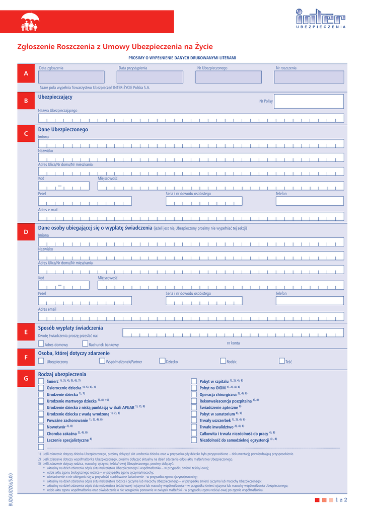 Zgłoszenie Roszczenia z Umowy Ubezpieczenia na Życie PROSIMY O WYPEŁNIENIE DANYCH DRUKOWANYMI LITERAMI A Data zgłoszenia Data przystąpienia Nr Ubezpieczonego Nr roszczenia Szare pola wypełnia Towarzystwo Ubezpieczeń INTER-ŻYCIE Polska S.A. B Ubezpieczający Nr Polisy Nazwa Ubezpieczającego C Dane Ubezpieczonego Imiona Nazwisko Adres Ulica/Nr domu/Nr mieszkania Kod Miejscowość Pesel Seria i nr dowodu osobistego Telefon Adres e-mail D Dane osoby ubiegającej się o wypłatę świadczenia (jeżeli jest nią Ubezpieczony prosimy nie wypełniać tej sekcji) Imiona Nazwisko Adres Ulica/Nr domu/Nr mieszkania Kod Miejscowość Pesel Seria i nr dowodu osobistego Telefon Adres email E Sposób wypłaty świadczenia Kwotę świadczenia proszę przesłać na: Adres domowy F G nr konta Rachunek bankowy Osoba, której dotyczy zdarzenie Ubezpieczony Współmałżonek/Partner Dziecko Rodzic Teść Rodzaj ubezpieczenia Śmierć 1), 3), 4), 5), 6), 7) Osierocenie dziecka Pobyt w szpitalu 1), 2), 4), 8) 1), 5), 6), 7) Pobyt na OIOM 1), 2), 4), 8) Urodzenie dziecka 1), 7) Operacja chirurgiczna 2), 4), 8) Urodzenie martwego dziecka 7), 8), 10) Urodzenie dziecka z niską punktacją w skali APGAR Rekonwalescencja poszpitalna 4), 8) 1), 7), 8) Świadczenie apteczne 8) Urodzenie dziecka z wadą wrodzoną 1), 7), 8) Pobyt w sanatorium 8), 9) Poważne zachorowanie 1), 2), 4), 8) Trwały uszczerbek 1), 2), 4), 8) Nowotwór 2), 8) Trwałe inwalidztwo 2), 4), 8) Choroba zakaźna 2), 4), 8) Całkowita i trwała niezdolność do pracy 4), 8) Leczenie specjalistyczne 8) Niezdolność do samodzielnej egzystencji 4) , 8) BUZ/GUZ/ZGŁ/6.00 ......................................................................................................................................................................................................................................................................................................... 1) Jeśli zdarzenie dotyczy dziecka Ubezpieczonego, prosimy dołączyć akt urodzenia dziecka oraz w przypadku gdy dziecko było przysposobione – dokumentację potwierdzającą przysposobienie. 2) Jeśli zdarzenie dotyczy współmałżonka Ubezpieczonego, prosimy dołączyć aktualny na dzień zdarzenia odpis aktu małżeństwa Ubezpieczonego. 3) Jeśli zdarzenie dotyczy rodzica, macochy, ojczyma, teścia/-owej Ubezpieczonego, prosimy dołączyć: • aktualny na dzień zdarzenia odpis aktu małżeństwa Ubezpieczonego i współmałżonka – w przypadku śmierci teścia/-owej; • odpis aktu zgonu biologicznego rodzica – w przypadku zgonu ojczyma/macochy; • oświadczenie o nie ubieganiu się w przyszłości o adekwatne świadczenie - w przypadku zgonu ojczyma/macochy; • aktualny na dzień zdarzenia odpis aktu małżeństwa rodzica i ojczyma lub macochy Ubezpieczonego – w przypadku śmierci ojczyma lub macochy Ubezpieczonego; • aktualny na dzień zdarzenia odpis aktu małżeństwa teścia/-owej i ojczyma lub macochy współmałżonka – w przypadku śmierci ojczyma lub macochy współmałżonka Ubezpieczonego; • odpis aktu zgonu współmałżonka oraz oświadczenie o nie wstąpieniu ponownie w związek małżeński - w przypadku zgonu teścia/-owej po zgonie współmałżonka. 1z2 G H 4) Jeśli przyczyną zdarzenia był wypadek, prosimy dołączyć dokumentację potwierdzającą okoliczności wypadku, protokół powypadkowy, notatkę policyjną, postanowienie prokuratury, sądu jeśli brały udział w wyjaśnieniu okoliczności zdarzenia, dowód rejestracyjny pojazdu, prawo jazdy ubezpieczonego/współubezpieczonego jeśli kierował pojazdem podczas wypadku oraz należy wypełnić sekcję H. 5) Prosimy dołączyć odpis aktu zgonu. 6) Jeśli zdarzenie dotyczy Ubezpieczonego, współmałżonka/partnera, dziecka Ubezpieczonego prosimy dołączyć dokument stwierdzający przyczynę zgonu. 7) Prosimy dołączyć dokument tożsamości uprawnionego do świadczenia. 8) Prosimy dołączyć pełną dokumentację medyczną. 9) Prosimy dołączyć skierowanie na leczenie uzdrowiskowe potwierdzone przez NFZ, dokumentację medyczną z pobytu w sanatorium. 10)Prosimy dołączyć odpis aktu urodzenia dziecka z adnotacją o martwym urodzeniu. Informacje dotyczące zdarzenia Data zdarzenia dd/mm/rrrr Miejsce zdarzenia Czy ubezpieczony w trakcie wypadku był pod wpływem alkoholu, środków odurzających lub innych substancji toksycznych? TAK NIE Proszę zaznaczyć tak lub nie. Opis zdarzenia I J Rozpatrywanie reklamacji w TU INTER-ŻYCIE Polska S.A. TU INTER-ŻYCIE Polska S.A. informuje, że na podstawie art. 4 ust. 2 ustawy z dnia 05.08.2015 r. o rozpatrywaniu reklamacji przez podmioty rynku finansowego i o Rzeczniku Finansowym (Dz. U. z 2015 r., poz. 1348), Klientowi (ubezpieczający, ubezpieczony, uposażony lub uprawniony z umowy ubezpieczenia) przysługuje możliwość złożenia reklamacji zawierającej zastrzeżenia dotyczące usług świadczonych przez TU INTER-ŻYCIE Polska S.A. Reklamacja może zostać złożona: 1) w formie pisemnej – osobiście lub przesyłką pocztową we wszystkich jednostkach INTER-ŻYCIE Polska obsługujących Klientów, w tym u agentów uprawnionych do działania w imieniu lub na rzecz INTER-ŻYCIE Polska; 2) ustnie – telefonicznie lub osobiście do protokołu podczas wizyty Klienta w jednostce INTER-ŻYCIE Polska obsługującej Klientów; 3) w formie elektronicznej za pośrednictwem strony internetowej www.interpolska.pl. Wykaz jednostek INTER-ŻYCIE Polska obsługujących Klientów, w których możliwe jest złożenie reklamacji, zamieszczony jest na stronie internetowej www.interpolska.pl. Odpowiedź na reklamację zostaje udzielona niezwłocznie, nie później jednak niż w terminie 30 dni od dnia jej otrzymania. W przypadkach szczególnie skomplikowanych, uniemożliwiających rozpatrzenie reklamacji i udzielenie odpowiedzi w terminie, o którym mowa powyżej, INTER-ŻYCIE Polska w informacji przekazywanej Klientowi, który wystąpił z reklamacj