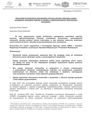 Warszawa, 21.05.2010 r. Komunikat do fachowych pracowników ochrony zdrowia, dotyczący ryzyka wystąpienia uszkodzeń wątroby w związku z ogólnoustrojowym stosowaniem nimesulidu1 Szanowna Pani Doktor! Szanowny Panie Doktorze! W celu ograniczenia ryzyka możliwości wystąpienia uszkodzeń wątroby podczas ogólnoustojowego leczenia produktami leczniczymi, zawierającymi nimesulid, poniżej podano istotne informacje, w tym aktualne zalecenia dotyczące czasu trwania leczenia i aktualne przeciwwskazania oraz ostrzeżenia. Komunikat ten został uzgodniony z Europejską Agencją Leków (EMA) i Urzędem Rejestracji Produktów Leczniczych, Wyrobów Medycznych i Produktów Biobójczych Streszczenie: • Nimesulid należy przepisywać wyłącznie jako lek drugiego rzutu po dokładnej klinicznej ocenie ogólnego ryzyka u poszczególnych pacjentów; • Należy stosować najmniejszą skuteczną dawkę przez najkrótszy okres czasu, nie dłużej niż przez 15 dni. Największe dostępne opakowanie będzie zawierać 30 tabletek/saszetek; • Nie należy stosować nimesulidu w połączeniu z innymi substancjami o potencjalnym działaniu uszkadzającym wątrobę, ani przepisywać pacjentom uzależnionym od alkoholu, leków lub substancji o działaniu odurzającym oraz pacjentom z gorączką i (lub) objawami grypopodobnymi; • Należy zaprzestać stosowania nimesulidu u pacjentów, u których wystąpi gorączka i (lub) objawy grypopodobne. W maju 2007 roku Europejska Agencja Leków rozpoczęła szczegółowy przegląd danych w odniesieniu do zaburzeń czynności wątroby związanych ze stosownaiem nimesulidu po analizie zgłoszeń o ciężkich przypadkach hepatotoksyczności, niekiedy zakończonych zgonem otrzymanych z Irlandii oraz po informacji o zawieszeniu stosowania nimesulidu w tym kraju. Dnia 20 września 2007 roku Komitet ds. Produktów Leczniczych Stosowanych u Ludzi (CHMP) Europejskiej Agencji Leków, zakończył przegląd i zalecił utrzymanie pozwoleń na dopuszczenie do obrotu produktów leczniczych do stosowania ogólnoustrojowego Nimesulid jest nieselektywnym, niesteroidowym lekiem przeciwzapalnym (NLPZ). Jest stosowany w leczeniu ostrego bólu, objawów choroby zwyrodnieniowej stawów i pierwotnego bolesnego miesiączkowania. Produkty zawierające nimesulid są dostępne od 1985 roku i uzyskały pozwolenie na dopuszczenie do obrotu w części państw członkowskich UE. Produkty te są wydawane wyłącznie z przepisu lekarza. 1 zawierających nimesulid. Jednak w celu zmniejszenia ryzyka wystąpienia uszkodzeń wątroby, EMA wymaga wprowadzenia zmian do druków informacyjnych (Charakterystyka Produktu Leczniczego i Ulotka Informacyjna dla Pacjenta), które podkreślają zalecenia dotyczące stosowania nimesulidu. Ocena danych dotyczących bezpieczeństwa w odniesieniu do funkcji wątroby podkreśliła, jak istotne jest aby fachowi pracownicy ochrony zdrowia oraz pacjenci byli świadomi potencjalnego zagrożenia, jakim jest uszkodzenie wątroby w wyniku przyjmowania nimesulidu. Należy przerwać leczenie produktem leczniczym w razie pojawienia się pierwszych oznak i objawów, które mogą wskazywać na upośledzenie funkcji wątroby. Dnia 16 października 2009 roku Komisja Europejska potwierdziła opinię CHMP w sprawie pozytywnego stosunku korzyści do ryzyka związanego ze stosowaniem nimesulidu i potwierdziła utrzymanie pozwoleń na dopuszczenie do obrotu produktów leczniczych do stosowania ogólnoustrojowego zawierających nimesulid. Komisja Europejska zaakceptowała propozycje CHMP dotyczące sposobu minimalizacji ryzyka, zaleciła również – w celu dalszego obniżenia ryzyka uszkodzeń wątroby- ograniczenie stosowania leku do leczenia drugiego rzutu w terapii bólu. Z tych powodów do Charakterystyk Produktów Leczniczych zawierających nimesulid do stosowania ogólnoustrojowego (w Polsce Aulin, Coxtral, Minesulin, Nimesil) zostaną wprowadzone następujące zmiany: „Wskazania do stosowania” – dodanie następujących ostrzeżeń dla lekarza • Nimesulid należy stosować wyłącznie jako lek drugiego rzutu. • Decyzja o zastosowaniu nimesulidu powinna opierać się na klinicznej ocenie ogólnego ryzyka u poszczególnych pacjentów. „Dawkowanie i sposób podawania” – dodanie następujących ograniczeń • Przyjmowanie leku w najmniejszej skutecznej dawce przez najkrótszy okres czasu w celu zmniejszenia ryzyka działań niepożądanych. • Najdłuższy czas stosowania nimesulidu wynosi 15 dni. „Przeciwwskazania” – do dotychczas obowiązujących zapisów, dotyczących pacjentów z niewydolnością wątroby, dodano informację, że nimesulid jest również przeciwwskazany w następujących sytuacjach: • Jednoczesna ekspozycja na substancje o potencjalnym działaniu uszkadzającym wątrobę. • Uzależnienie od alkoholu, leków lub substancji o działaniu odurzającym. • Pacjenci z gorączką i (lub) objawami grypopodobnymi. „Specjalne ostrzeżenia i środki ostrożności dotyczące stosowania” – sekcja została uaktualniona w celu przypomnienia fachowym pracownikom ochrony zdrowia o tym, że należy przerwać leczenie u pacjentów, u których wystąpi gorączka i (lub) objawy grypopodobne. Więcej informacji o warunkach stosowania nimesulidu można znaleźć w pełnym tekście zatwierdzonej Charakterystyki Produktu Leczniczego. Zaktualizowano też Ulotkę Informacyjną dla Pacjenta, aby odzwierciedlała podane powyżej informacje dotyczące bezpieczeństwa. Ponadto, w związku z ograniczeniem maksymalnego czasu stosowania leku, wszystkie opakowania zawierające więcej niż 30 dawek (tj. 15 dni leczenia) nimesulidu w tabletkach lub saszetkach zostaną wycofane ze sprzedaży. Zaleca się lekarzom, aby przepisywali nimesulid w ścisłej zgodności ze wskazaniami terapeutycznymi, przeciwwskazaniami, specjalnymi ostrzeżeniami i środkami ostrożności, podanymi w nowej Charakterystyce Produktu Leczniczego. Jednocześnie zaleca się staranną obse