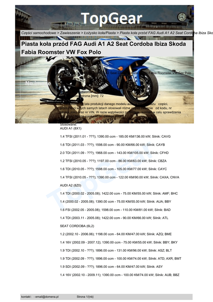 Utworzono : 02 marzec 2017 Części samochodowe > Zawieszenie > Łożysko koła/Piasta > Piasta koła przód FAG Audi A1 A2 Seat Cordoba Ibiza Sko Piasta koła przód FAG Audi A1 A2 Seat Cordoba Ibiza Skoda Fabia Roomster VW Fox Polo Model : FAG713610470 Piasta koła przód FAG Audi A1 A2 Seat Cordoba Ibiza Skoda Fabia Roomster VW Fox Polo Producent : FAG No image Dane podstawowe: Oprawa, ilosc otworów: 5 Srednica zewnetrzna [mm]: 72 W nawiasach są lata produkcji danego modelu auta, a nie montażu części, producenci w tych samych latach stosowali różne części zależnie od kodu, nr silnika, roku oraz nr VIN. W razie wątpliwości prosimy o kontakt w celu sprawdzenia czy część będzie pasować do danego auta Stosowane: AUDI A1 (8X1) r a 1.4 TFSI (2011.01 - ???); 1390.00 ccm - 185.00 KM/136.00 kW; Silnik: CAVG 1.6 TDI (2011.03 - ???); 1598.00 ccm - 90.00 KM/66.00 kW; Silnik: CAYB e G 2.0 TDI (2011.09 - ???); 1968.00 ccm - 143.00 KM/105.00 kW; Silnik: CFHD 1.2 TFSI (2010.05 - ???); 1197.00 ccm - 86.00 KM/63.00 kW; Silnik: CBZA 1.6 TDI (2010.05 - ???); 1598.00 ccm - 105.00 KM/77.00 kW; Silnik: CAYC p o T 1.4 TFSI (2010.05 - ???); 1390.00 ccm - 122.00 KM/90.00 kW; Silnik: CAXA; CNVA AUDI A2 (8Z0) 1.4 TDI (2000.02 - 2005.08); 1422.00 ccm - 75.00 KM/55.00 kW; Silnik: AMF; BHC 1.4 (2000.02 - 2005.08); 1390.00 ccm - 75.00 KM/55.00 kW; Silnik: AUA; BBY 1.6 FSI (2002.05 - 2005.08); 1598.00 ccm - 110.00 KM/81.00 kW; Silnik: BAD 1.4 TDI (2003.11 - 2005.08); 1422.00 ccm - 90.00 KM/66.00 kW; Silnik: ATL SEAT CORDOBA (6L2) 1.2 (2002.10 - 2006.06); 1198.00 ccm - 64.00 KM/47.00 kW; Silnik: AZQ; BME 1.4 16V (2002.09 - 2007.12); 1390.00 ccm - 75.00 KM/55.00 kW; Silnik: BBY; BKY 1.9 TDI (2002.10 - ???); 1896.00 ccm - 131.00 KM/96.00 kW; Silnik: ASZ; BLT 1.9 TDI (2002.09 - ???); 1896.00 ccm - 100.00 KM/74.00 kW; Silnik: ATD; AXR; BMT 1.9 SDI (2002.09 - ???); 1896.00 ccm - 64.00 KM/47.00 kW; Silnik: ASY 1.4 16V (2002.10 - 2009.11); 1390.00 ccm - 100.00 KM/74.00 kW; Silnik: AUB; BBZ kontakt : - [email protected] Strona 1/{nb} Utworzono : 02 marzec 2017 Części samochodowe > Zawieszenie > Łożysko koła/Piasta > Piasta koła przód FAG Audi A1 A2 Seat Cordoba Ibiza Sko Piasta koła przód FAG Audi A1 A2 Seat Cordoba Ibiza Skoda Fabia Roomster VW Fox Polo 1.4 TDI (2002.10 - 2005.12); 1422.00 ccm - 75.00 KM/55.00 kW; Silnik: AMF 1.6 (2003.04 - 2009.11); 1598.00 ccm - 101.00 KM/74.00 kW; Silnik: BAH 2.0 (2002.09 - 2009.11); 1984.00 ccm - 115.00 KM/85.00 kW; Silnik: AZL; BBX 1.4 TDI (2005.05 - 2009.11); 1422.00 ccm - 70.00 KM/51.00 kW; Silnik: BNM 1.4 TDI (2005.06 - 2009.11); 1422.00 ccm - 80.00 KM/59.00 kW; Silnik: BMS; BNV 1.2 12V (2006.05 - 2009.11); 1198.00 ccm - 70.00 KM/51.00 kW; Silnik: BXV 1.4 16V (2006.05 - 2009.11); 1390.00 ccm - 86.00 KM/63.00 kW; Silnik: BXW 1.6 16V (2006.11 - 2009.11); 1598.00 ccm - 105.00 KM/77.00 kW; Silnik: BTS SEAT IBIZA IV (6L1) r a 1.2 (2002.02 - 2006.06); 1198.00 ccm - 64.00 KM/47.00 kW; Silnik: AZQ; BME 1.4 16V (2002.02 - ???); 1390.00 ccm - 100.00 KM/74.00 kW; Silnik: AUB; BBZ e G 1.9 TDI (2002.02 - ???); 1896.00 ccm - 100.00 KM/74.00 kW; Silnik: ATD; AXR; BMT 1.9 TDI (2002.02 - ???); 1896.00 ccm - 131.00 KM/96.00 kW; Silnik: ASZ; BLT p o T 1.4 16V (2002.02 - 2007.12); 1390.00 ccm - 75.00 KM/55.00 kW; Silnik: BBY; BKY 1.9 SDI (2002.02 - 2005.12); 1896.00 ccm - 64.00 KM/47.00 kW; Silnik: ASY 1.4 TDI (2002.05 - 2005.12); 1422.00 ccm - 75.00 KM/55.00 kW; Silnik: AMF 1.8 T Cupra R (2004.01 - 2008.02); 1781.00 ccm - 180.00 KM/132.00 kW; Silnik: BBU; BLZ 1.8 T FR (2003.12 - 2008.05); 1781.00 ccm - 150.00 KM/110.00 kW; Silnik: BJX; BKV 1.6 (2003.02 - ???); 1598.00 ccm - 101.00 KM/74.00 kW; Silnik: BAH 1.9 TDI Cupra R (2004.03 - 2008.02); 1896.00 ccm - 160.00 KM/118.00 kW; Silnik: BPX; BUK 1.4 TDI (2005.05 - ???); 1422.00 ccm - 70.00 KM/51.00 kW; Silnik: BNM 1.4 TDI (2005.06 - ???); 1422.00 ccm - 80.00 KM/59.00 kW; Silnik: BMS; BNV 1.2 12V (2006.05 - ???); 1198.00 ccm - 70.00 KM/51.00 kW; Silnik: BXV 1.6 16V (2006.11 - ???); 1598.00 ccm - 105.00 KM/77.00 kW; Silnik: BTS 2.0 (2002.04 - ???); 1984.00 ccm - 116.00 KM/85.00 kW; Silnik: AZL; BBX 1.4 16V (2006.05 - ???); 1390.00 ccm - 86.00 KM/63.00 kW; Silnik: BXW kontakt : - [email protected] Strona 2/{nb} Utworzono : 02 marzec 2017 Części samochodowe > Zawieszenie > Łożysko koła/Piasta > Piasta koła przód FAG Audi A1 A2 Seat Cordoba Ibiza Sko Piasta koła przód FAG Audi A1 A2 Seat Cordoba Ibiza Skoda Fabia Roomster VW Fox Polo 1.2 (2007.06 - 2008.05); 1198.00 ccm - 60.00 KM/44.00 kW; Silnik: BBM SEAT IBIZA V (6J5) 1.2 (2009.07 - ???); 1198.00 ccm - 60.00 KM/44.00 kW; Silnik: CGPB 1.2 (2008.03 - ???); 1198.00 ccm - 70.00 KM/51.00 kW; Silnik: BZG; CGPA 1.4 (2008.03 - ???); 1390.00 ccm - 85.00 KM/63.00 kW; Silnik: BXW; CGGB 1.4 TDI (2008.07 - ???); 1422.00 ccm - 80.00 KM/59.00 kW; Silnik: BMS 1.9 TDI (2008.07 - ???); 1896.00 ccm - 90.00 KM/66.00 kW; Silnik: BXJ 1.9 TDI (2008.03 - ???); 1896.00 ccm - 105.00 KM/77.00 kW; Silnik: BLS r a 1.6 (2008.05 - ???); 1598.00 ccm - 105.00 KM/77.00 kW; Silnik: BTS 2.0 (2008.10 - ???); 1984.00 ccm - 115.00 KM/85.00 kW; Silnik: CEKA e G 1.4 TSI (2009.06 - ???); 1390.00 ccm - 150.00 KM/110.00 kW; Silnik: CAVF 1.6 TDI (2009.05 - ???); 1598.00 ccm - 90.00 KM/66.00 kW; Silnik: CAYB 1.6 TDI (2009.05 - ???); 1598.00 ccm - 105.00 KM/77.00 kW; Silnik: CAYC; CLNA p o T 2.0 TDI (2010.01 - ???); 1968.00 ccm - 143.00 KM/105.00 kW; Silnik: CFHD 1.2 TSI (2010.09 - ???); 1197.00 ccm - 105.00 KM/77.00 kW; Silnik: CBZB 1.2 TDI (2010.05 - ???); 1199.00 ccm - 75.00 KM/55.00 kW; Silnik: CFWA SEAT IBIZA V SPORTCOUPE (6J1) 1.2 TDI (2010.05 - ???); 1199.00 ccm - 75.00 KM/55.00 kW; Silnik: CFWA 1.2 (2008.07 - ???); 1198.00 ccm - 70.00 KM/51.00 kW; Silnik: BZG; CGPA 1.4 (2008.07 - ???); 1390.00 ccm - 85.00 KM/63.00 kW; Silnik: BXW; CGGB 1.4 TDI (2008.07 - ???); 1422.00 ccm - 80.00 KM/59.00 kW; Silnik: BMS 1.9 TDI (2008.07 - ???); 1896.00 ccm - 90.00 KM/66.00 kW; Silnik: BXJ 1.9 TDI (2008.07 - ???); 1896.00 ccm -