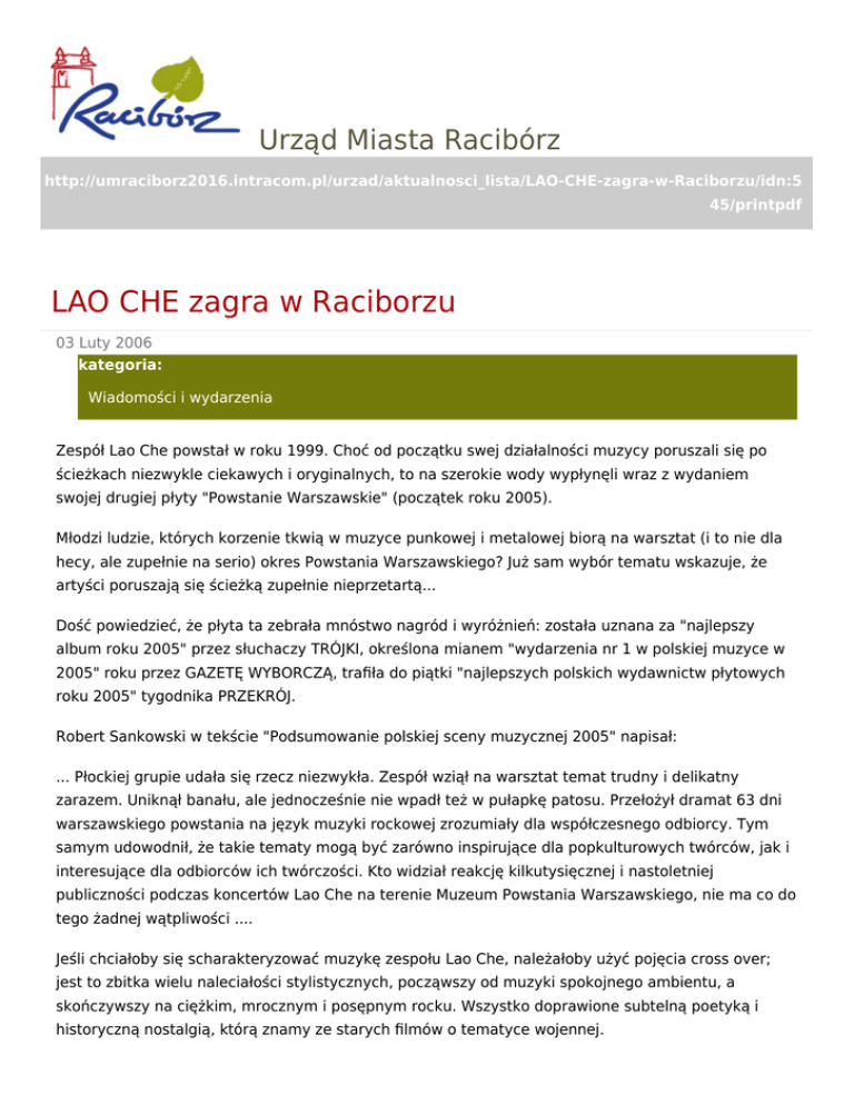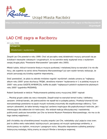 Urząd Miasta Racibórz http://umraciborz2016.intracom.pl/urzad/aktualnosci_lista/LAO-CHE-zagra-w-Raciborzu/idn:5 45/printpdf LAO CHE zagra w Raciborzu 03 Luty 2006 kategoria: Wiadomości i wydarzenia Zespół Lao Che powstał w roku 1999. Choć od początku swej działalności muzycy poruszali się po ścieżkach niezwykle ciekawych i oryginalnych, to na szerokie wody wypłynęli wraz z wydaniem swojej drugiej płyty "Powstanie Warszawskie" (początek roku 2005). Młodzi ludzie, których korzenie tkwią w muzyce punkowej i metalowej biorą na warsztat (i to nie dla hecy, ale zupełnie na serio) okres Powstania Warszawskiego? Już sam wybór tematu wskazuje, że artyści poruszają się ścieżką zupełnie nieprzetartą... Dość powiedzieć, że płyta ta zebrała mnóstwo nagród i wyróżnień: została uznana za "najlepszy album roku 2005" przez słuchaczy TRÓJKI, określona mianem "wydarzenia nr 1 w polskiej muzyce w 2005" roku przez GAZETĘ WYBORCZĄ, trafiła do piątki "najlepszych polskich wydawnictw płytowych roku 2005" tygodnika PRZEKRÓJ. Robert Sankowski w tekście "Podsumowanie polskiej sceny muzycznej 2005" napisał: ... Płockiej grupie udała się rzecz niezwykła. Zespół wziął na warsztat temat trudny i delikatny zarazem. Uniknął banału, ale jednocześnie nie wpadł też w pułapkę patosu. Przełożył dramat 63 dni warszawskiego powstania na język muzyki rockowej zrozumiały dla współczesnego odbiorcy. Tym samym udowodnił, że takie tematy mogą być zarówno inspirujące dla popkulturowych twórców, jak i interesujące dla odbiorców ich twórczości. Kto widział reakcję kilkutysięcznej i nastoletniej publiczności podczas koncertów Lao Che na terenie Muzeum Powstania Warszawskiego, nie ma co do tego żadnej wątpliwości .... Jeśli chciałoby się scharakteryzować muzykę zespołu Lao Che, należałoby użyć pojęcia cross over; jest to zbitka wielu naleciałości stylistycznych, począwszy od muzyki spokojnego ambientu, a skończywszy na ciężkim, mrocznym i posępnym rocku. Wszystko doprawione subtelną poetyką i historyczną nostalgią, którą znamy ze starych filmów o tematyce wojennej. Pierwsza płyta zespołu - "Gusła" miała oddać atmosferę zamierzchłych czasów, okresu średniowiecza i historycznych relacji rodem z kresów. Królują na niej teksty o charakterze archaicznym, można w niej odnaleźć wiele neologizmów i zapożyczeń z kultury wschodnich Słowian. Całość tworzy dość dziwny zlepek kulturowy, o dość ciemnym i tajemniczym koncepcie, związanym z Gusłami, czyli obrzędem wywoływania duchów. Całość zabrudzono wstawkami sampli, oraz szumami radiowymi co nadaje muzyce oryginalnego charakteru. Jest to autentyczna i niecodzienna płyta, która powinna zainteresować słuchaczy szukających w muzyce czegoś więcej niż rytmu i melodii. Pomysł na drugą płytę zespołu "Powstanie Warszawskie" pojawił się podczas końcowego etapu prac nad płytą "Gusła". W ciągu dwóch lat zespół tworzył muzykę, która miała odzwierciedlić 10 obrazów najbardziej znamiennych dla tego zrywu wydarzeń. Jest tu delikatny śpiew o romantyce uczuć zawieszonych pomiędzy Warszawą a Londynem, gorzkie, ale pogodne ballady o dzielnych żołnierzach i ich dowódcach, hardcorowy wrzask o młodych hitlerowcach. Wszystko przypomina okres wojenny, Płyta trzeszczy, słuchać w niej urywki przemówień radiowych, rozkazy wydawane przez stare przekaźniki radiowe. Ciekawostką jest to, że płyta została nagrana w wyposażonym w stare sprzęty, legendarnym studio "Obuh". Do nagrań użyto przede wszystkim starych mikrofonów pamiętających lata 60-tę czy nawet lata 30-ste. Lao Che wystąpi w Raciborzu w sobotę 4 lutego o godzinie 18.00. Koncert dofinansowany jest przez Urząd Miasta Racibórz, w ramach realizacji gminnego programu profilaktyki uzależnień. Organizatorami imprezy są: GRUPA ROSYNANT i Raciborskie Centrum Kultury. Sponsorem wspierającym jest Hotel Polonia. STRONA ZESPOŁU: www.laoche.art.pl