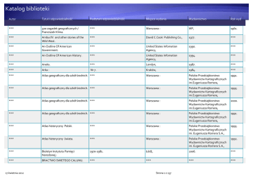 Katalog biblioteki Autor Tytuł / odpowiedzialność Podtytuł / odpowiedzialność Miejsce wydania Wydawnictwo Rok wyd *** 500 zagadek geograficznych / Franciszek Klima. *** Warszawa : WP, 1961. *** Ambus'h! and other stories of the Wild West. *** David C.Cook Publishing Co., 1977. *** *** An Outline Of American Government. *** United States Infomation Agency, 1990. *** *** An Outline Of American History. *** United States Infomation Agency, 1994. *** *** Aneks. *** Londyn, 1987. *** *** Arka : Nr 7. Kraków, 1984. *** *** Atlas geograficzny dla szkół średnich. *** Warszawa : Polskie Przedsiębiorstwo Wydawnictw Kartograficznych im.Eugeniusza Romera, 1991. *** Atlas geograficzny dla szkół średnich. *** Warszawa : Polskie Przedsiębiorstwo Wydawnictw Kartograficznych im.Eugeniusza Romera, 1995. *** Atlas geograficzny dla szkół średnich. *** Warszawa : Polskie Przedsiębiorstwo Wydawnictw Kartograficznych im.Eugeniusza Romera, 2000. *** Atlas geograficzny dla szkół średnich. *** Warszawa : Polskie Przedsiębiorstwo Wydawnictw Kartograficznych im.Eugeniusza Romera, 1991. *** Atlas historyczny Polski. *** Warszawa : Polskie Przedsiębiorstwo Wydawnictw Kartograficznych im. Eugeniusza Romera S.A., 1993. *** Atlas historyczny świata. *** Warszawa : Polskie Przedsiębiorstwo Wydawnictw Kartograficznych im. Eugeniusza Romera S.A., 1992. *** Biuletyn Instytutu Pamięci Narodowej : 1970-1981. Łódź, 2006. *** *** BRACTWO SWIETEGO CALUNU. *** *** *** *** 17 kwietnia 2012 Strona 1 z 237 Autor Tytuł / odpowiedzialność Podtytuł / odpowiedzialność Miejsce wydania Wydawnictwo Rok wyd *** Bractwo Świetego Całunu. *** *** *** *** *** Canada - a discovery. *** Ottawa : External Affaires, 1984. *** Chemia : Zakrez rozszerzony 1 / Stanisława Hejwowska. Gdynia : Operon, 2005. *** Chemia : Zakres rozszerzony 3 / Stanisława Hejwowska. Gdynia : Operon, 2005. *** Chiny : Podróże Marzeń. Warszawa, 2006. *** *** Cuda świata : Podróże marzeń. Warszawa : Biblioteka Gazety Wyborczej, 2006. *** Egzamin gimnazjalny : testy z przedmiotów matematycznoprzyrodniczych 2010. Gdynia : Wydawnictwo Pedagogiczne Operon, 2009. *** Family Book of Car Fun. *** London : Drive Publications, 1974. *** Fizyka z astronomią / Krzysztof Chyla. *** Bielsko-Biała : Debit, 2003. *** Geografia 1 : Ziemia / Jan Wójcik. Warszawa : PPWK, 2002. *** Geograficzny atlas Polski. *** Warszawa : Polskie Przedsiębiorstwo Wydawnictw Kartograficznych im.Eugeniusza Romera, 1999. *** Grapevine : Student`s Book 2. *** *** *** *** Jestem świadkiem Chrystusa w Kościele : Katechizm dla kl. I liceum i technikum. Kraków : WAM, 2002. *** Jestem Świadkiem Chrystusa w Rodzinie : Podręcznik do religii kl.3. Kraków : Wydawnictwo WAM, 2004. *** JULIA NAVARRO : BRACTWO SWIETEGO CALUNU. *** *** *** *** JULIA NAVARRO. *** *** *** *** *** Kilmt : Klasycy sztuki. Warszawa : Rzeczpospolita HPS, 2006. *** Kształcenie obywatelskie : scenariusze lekcji. Centrum Edukacji Europejskiej, 1995. *** *** Nowa encyklopedia powszechna PWN. T. 4. M-P. *** Warszawa : Wydawnictwo Naukowe PWN S.A., 1996. *** nT.1-2 Korso, Krawędź wieku / Włodzimierz Kłaczyński. *** *** *** *** nT.3 Wrażenie bólu / Włodzimierz Kłaczyński. *** *** *** 17 kwietnia 2012 Strona 2 z 237 Autor Tytuł / odpowiedzialność Podtytuł / odpowiedzialność Miejsce wydania Wydawnictwo Rok wyd *** nT.4 Gon / Włodzimierz Kłaczyński. *** *** *** *** nT.5 Głowa Holofernesa / Włodzimierz Kłaczyński. *** *** *** *** Opowieść o człowieku : scenariusze lekcji : klasa II. Kraków : Wydawnictwo Znak, 2003. *** Pochwała ciekawości : poradnik dla nauczycieli filozofii, języka polskiego, wiedzy o kulturze i historii. Kraków : Wydawnictwo Znak, cop. 2003. *** Povratak i vrijeme i druge price Eisenhowerovog vremena / Charles Merrill. *** Tuzla, 2007. *** *** Programy szkół ponadpodstawowych : Cz.I / Wydawnictwa Szkolne i Pedagogiczne. Warszawa : Wydawnictwa Szkolne i Pedagogiczne, 1987. *** Putovanje : Masakr nevinih / Charles Merrill. Tuzla, 2007. *** *** Reading for Comprehension : Book 2. New York : Cambridge Book Co, 1960. *** Spotkania z Bogiem : Katechizm do kl. II szkół ponadpodstawowych. Kraków : WAM, 1999. *** Telephone Dynamics : Workbook. *** *** *** *** The book of pooular science / The book of popular science. *** *** *** *** *** This is America. *** United States Infomation Agency, 1990. *** Aaron, Ira E. Orbiting Earth / Ira E.Aaron. *** Glenview,Illinois,Dallas : Scott,Foresman and co, 1975. Abecassis, Eliette (1969- Skarb świątyni / Eliette Abecassis. ) *** Warszawa : Wydawnictwo Albatros Andrzej 2005. Kuryłowicz, Acevedo, Ana High Flyer-Upper Intermediate : Student's Book / Ana Acevedo,Marisol Gower. Longman, 1998. *** Acevedo, Ana High Flyer-Upper Intermediate : Teacher's Book / Ana Acevedo,Marisol Gower. Longman, 1998. *** Aciman, Andre (1951- ) Wyjście z Egiptu / Andre Aciman ; przeł. Elżbieta Jasińska. *** Wołowiec : Wydawnictwo Czarne, 2009. Adamczyk, Gabriel Przysposobienie obronne : Podręcznik dla szkół ponadpodstawowych / Warszawa : Gabriel Adamczyk, Bogusława Breitkopf, Zbigniew Worwa. Wydawnictwa Szkolne i Pedagogiczne, 1999. 17 kwietnia 2012 Strona 3 z 237 Autor Tytuł / odpowiedzialność Podtytuł / odpowiedzialność Miejsce wydania Wydawnictwo Rok wyd Adamczyk, Maria Starożytność - oświecenie : podręcznik literatury dla klasy pierwszej szkoły średniej / Maria Adamczyk, Bożena Chrząstowska, Józef Tomasz Pokrzywniak. Warszawa : Wydawnictwa Szkolne i Pedagogiczne, 1987. Adamczyk, Maria Starożytność - oświecenie : podręcznik literatury dla klasy pierwszej szkoły średniej / Maria Adamczyk, Bożena Chrząstowska, Józef Tomasz Pokrzywniak. Warszawa : Wydawnictwa Szkolne i Pedagogiczne, 1993. Adamczyk-Szczecinska, Halina Słownik Szkolny : Postacie historyczne / Halina AdamczykSzczecinska,Alicja Mańkowska,Krystyna Zalewska. Warszawa : Wydawnictwa Szkolne i Pedagogiczne, 1997. Adamiecki, Wojciech (1934- ) Okr