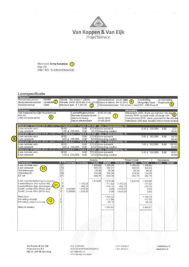 1 Imię, nazwisko i adres 2 Personeelnummer - numer personalny Burgerservicenummer - numer BSN Dossienummer - numer dossier 3 Tijdvak - numer i zakres okresu rozliczeniowego (4 tygodnie) Periode - daty okresu rozliczeniowego Minumun loon - minimalne wynagrodzenie 4 Geboortedatum - data urodzenia Datum in dienst - data rozpoczęcia pracy Tabel/voordeelregel - tabela podatkowa (4 tygodniowa) 5 Loonheffing - podatki (ulga podatkowa) Burgerlijke staat - stan cywilny CAO - ABU Faza … 6 Nazwa i adres pracodawcy 7 Loonheffingenummer - numer podatkowy pracodawcy Nummer loonspecificatie - numer paska wynagrodzenia 8 Mededeling - informacja, wiadomość od biura 9 Declaratie 167282422 (04-01/10-01) TFC Holland B.V* - tydzien i nazwa firmy Loon normale uren - przepracowane godziny : liczba godzin, stawka, wynagrodzenie brutto Loon overwerk - nadgodziny Loon onregelmatige uren - godziny nieregularne Inhouding - potrącenie, np: * maaltijd - wyżywienie * werkschoenen - buty * werkkleiding - ubranie robocze * borg klokpas - karta do odbijania godzin * fiets - rower * bekeuring - mandat (VKVE auto) 10 Loon normale uren - przepracowane godziny brutto Loon overwerk - nadgodziny brutto Loon onregelmatige uren - nieregularne godziny brutto Vakantiedagen - godziny urlopowe brutto (pobierane podczas urlopu lub dopełnienie do tygodnia) Vakantiegeld - pieniądze wakacyjne (wypłacane pracownikom mieszkającym na mieszkaniu firmowym) ET ruil - odciągniecie za mieszkanie (często pojawia sie w dwoch miejscach na salarisie, z kwoty brutto oraz z kwoty netto) 11 Loon voor loonbelasting en premies - kwota do opodatkowania Loonheffingen - tabela podatkowa Gediff. premie Whk -vast -flex - ustawowe potrącenie na fundusz dla bezrobotnych i niezdolnych do pracy 12 Netto loon - wynagrodzenie netto Inhouding - wspomniane potrącenia Inhouding zorgverzekering - składka na ubezpieczenie zdrowotne Netto te betalen - wynagrodzenie netto do wyplaty 13 Cumulatieven - dodatkowe ubezpiecznie społeczne opłacane przez pracodawcę 14 Vakantiedagen - godziny urlopowe (opname - pobrane, saldo uren - aktualne saldo) Vakantiegeld - pieniądze wakacyjne 15 Informacja dotyczy opłaty za mieszkanie w stosunku do liczby przepracowanych godzin 16 Arbeidskorting - przysługujące pomniejszenie opodatkowania Pensioen - składki na emeryturę Opname vakantiedagen 2016 in uren - pobrane godziny urlopowe w danym roku Opbouw vakantiedagen 2016 in uren - wypracowane godziny urlopowe w danym roku Inhouding verzekering - dotychczasowa kwota opłaconych składek na ubezpieczenie Netto te betalen - kwota, jaka została przelana na podane konto bankowe