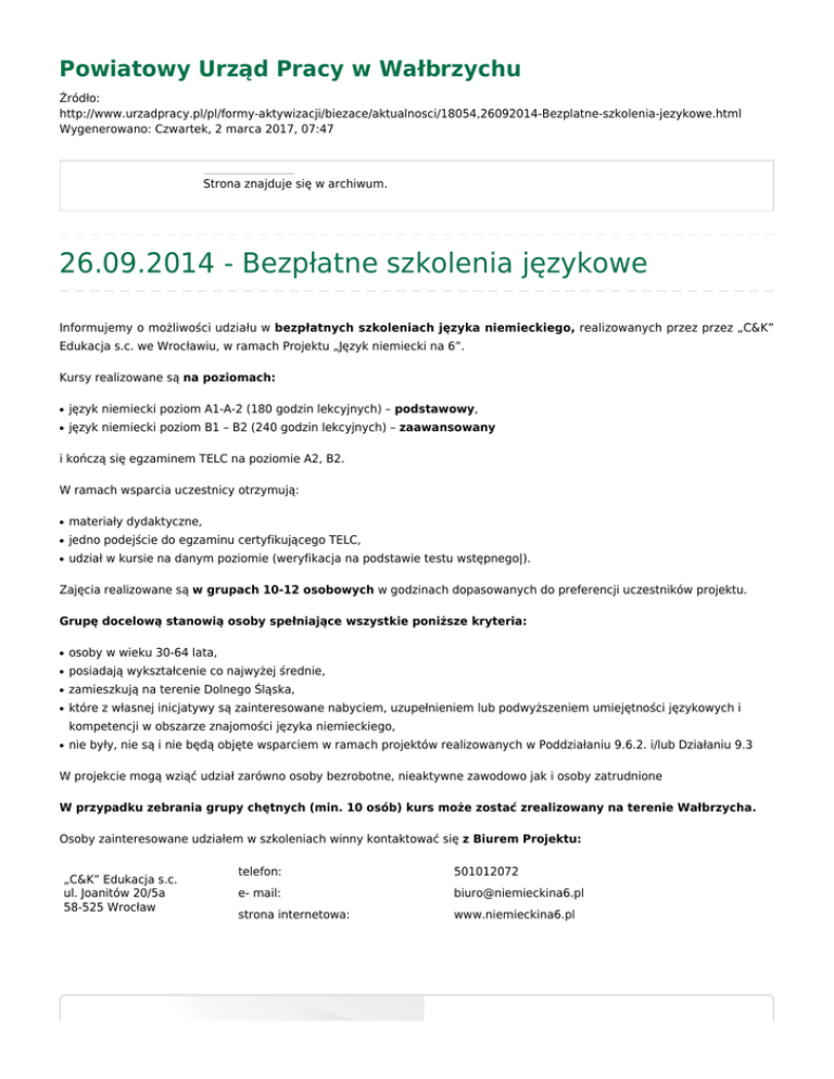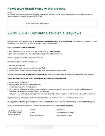 Powiatowy Urząd Pracy w Wałbrzychu Źródło: http://www.urzadpracy.pl/pl/formy-aktywizacji/biezace/aktualnosci/18054,26092014-Bezplatne-szkolenia-jezykowe.html Wygenerowano: Czwartek, 2 marca 2017, 07:47 Strona znajduje się w archiwum. 26.09.2014 - Bezpłatne szkolenia językowe Informujemy o możliwości udziału w bezpłatnych szkoleniach języka niemieckiego, realizowanych przez przez „C&K” Edukacja s.c. we Wrocławiu, w ramach Projektu „Język niemiecki na 6”. Kursy realizowane są na poziomach: ● język niemiecki poziom A1-A-2 (180 godzin lekcyjnych) – podstawowy, ● język niemiecki poziom B1 – B2 (240 godzin lekcyjnych) – zaawansowany i kończą się egzaminem TELC na poziomie A2, B2. W ramach wsparcia uczestnicy otrzymują: ● materiały dydaktyczne, ● jedno podejście do egzaminu certyfikującego TELC, ● udział w kursie na danym poziomie (weryfikacja na podstawie testu wstępnego|). Zajęcia realizowane są w grupach 10-12 osobowych w godzinach dopasowanych do preferencji uczestników projektu. Grupę docelową stanowią osoby spełniające wszystkie poniższe kryteria: ● osoby w wieku 30-64 lata, ● posiadają wykształcenie co najwyżej średnie, ● zamieszkują na terenie Dolnego Śląska, ● które z własnej inicjatywy są zainteresowane nabyciem, uzupełnieniem lub podwyższeniem umiejętności językowych i kompetencji w obszarze znajomości języka niemieckiego, ● nie były, nie są i nie będą objęte wsparciem w ramach projektów realizowanych w Poddziałaniu 9.6.2. i/lub Działaniu 9.3 W projekcie mogą wziąć udział zarówno osoby bezrobotne, nieaktywne zawodowo jak i osoby zatrudnione W przypadku zebrania grupy chętnych (min. 10 osób) kurs może zostać zrealizowany na terenie Wałbrzycha. Osoby zainteresowane udziałem w szkoleniach winny kontaktować się z Biurem Projektu: „C&K” Edukacja s.c. ul. Joanitów 20/5a 58-525 Wrocław telefon: 501012072 e- mail: [email protected] strona internetowa: www.niemieckina6.pl Metryka strony Data publikacji 26.09.2014 Rejestr zmian Osoba publikująca: Beata Uhryn Zespół ds. Analiz, Statystyki i Zamówień Publicznych Autor: Magdalena Oleś Liczba wejść: 840 Drukuj Generuj PDF Powiadom znajomego Wstecz
